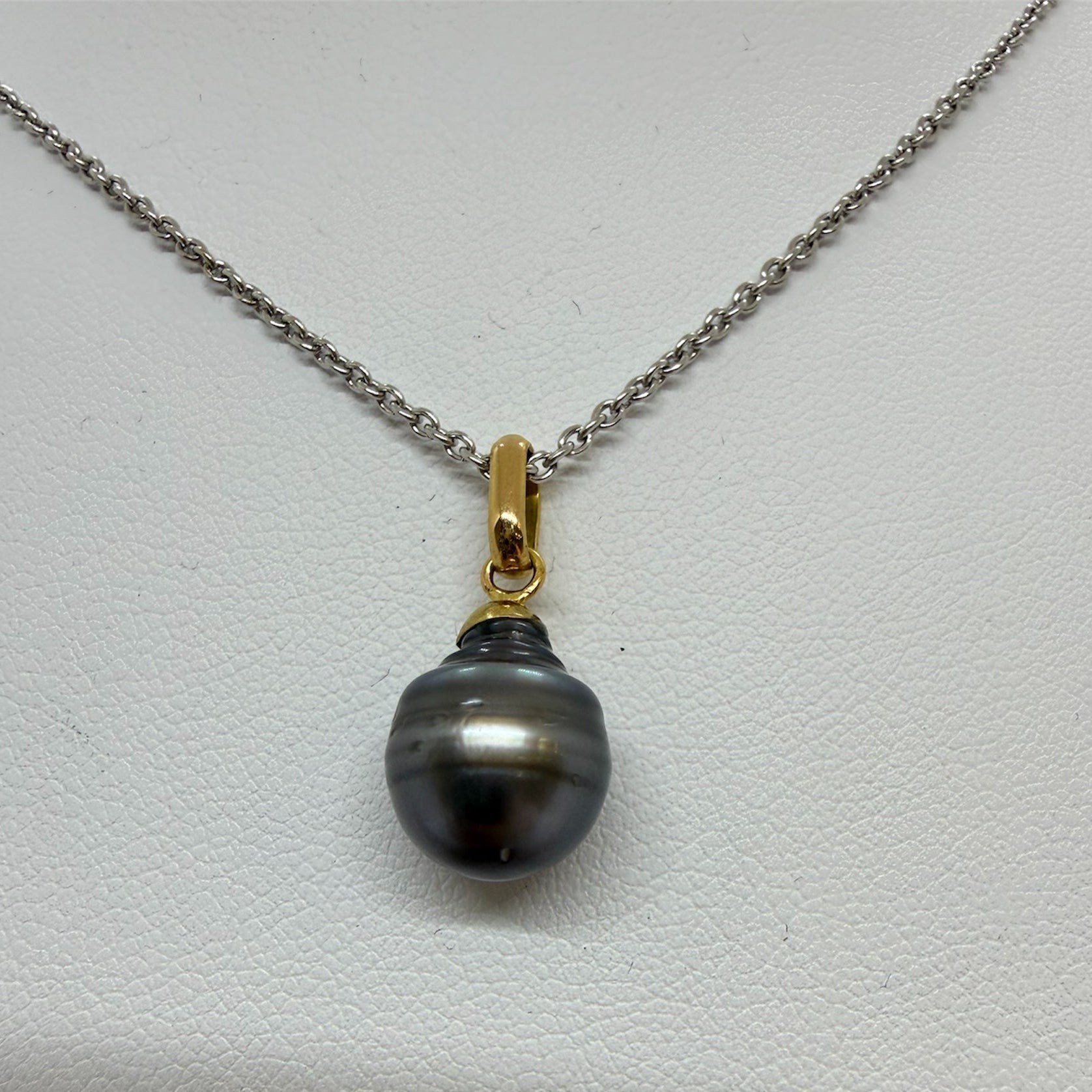 Pendentif solitaire en or jaune 18 carats (750/1000), orné d’une perle de Tahiti. Poids 1,75 g, dimensions 20 × 9 mm, en très bon état, un bijou élégant et intemporel.