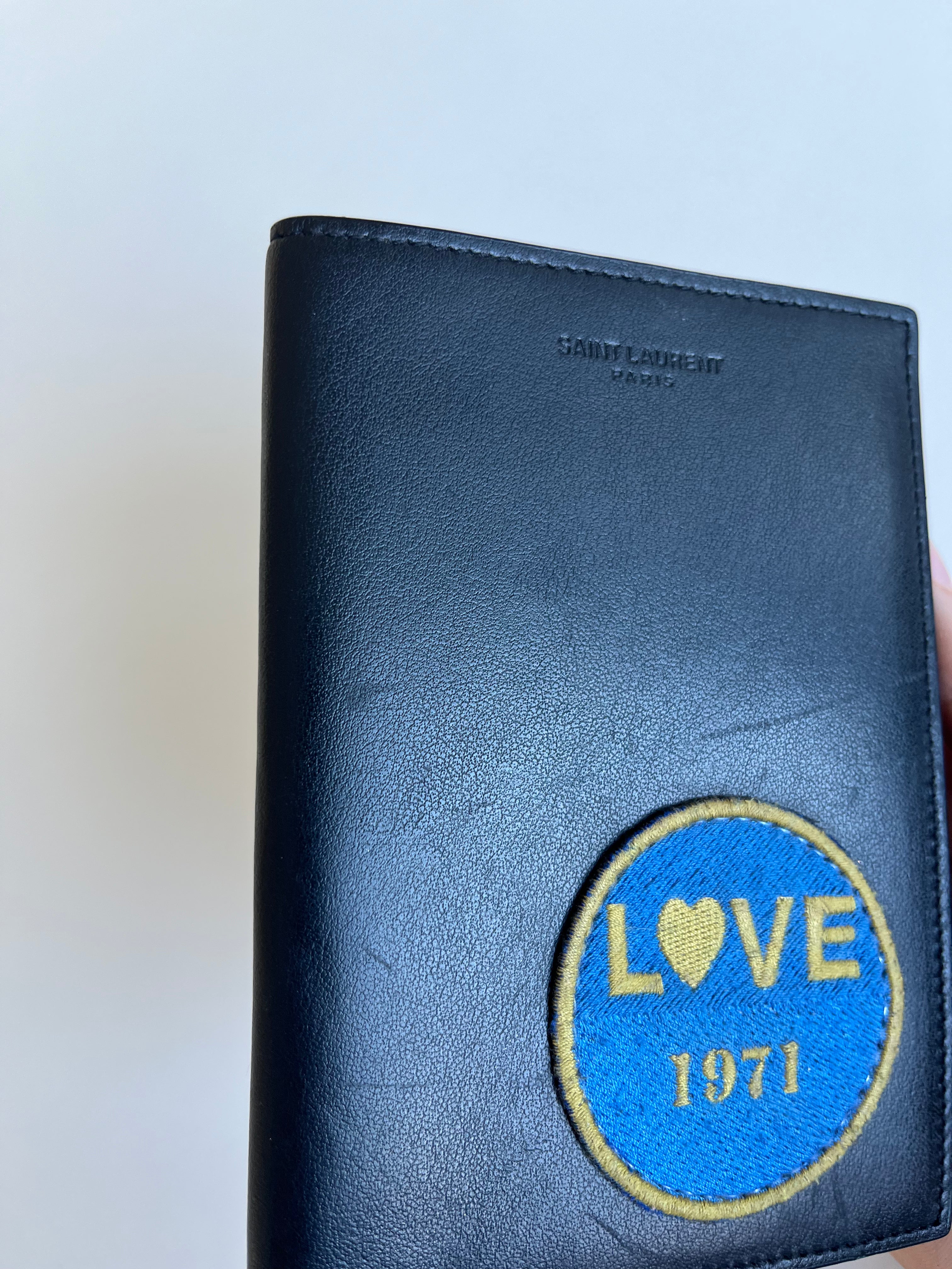 Porte-passeport en cuir lisse noir, modèle rare Saint Laurent Love 1971. Dimensions 14 × 10 × 1 cm, bon état. Élégant et pratique pour voyager avec style.