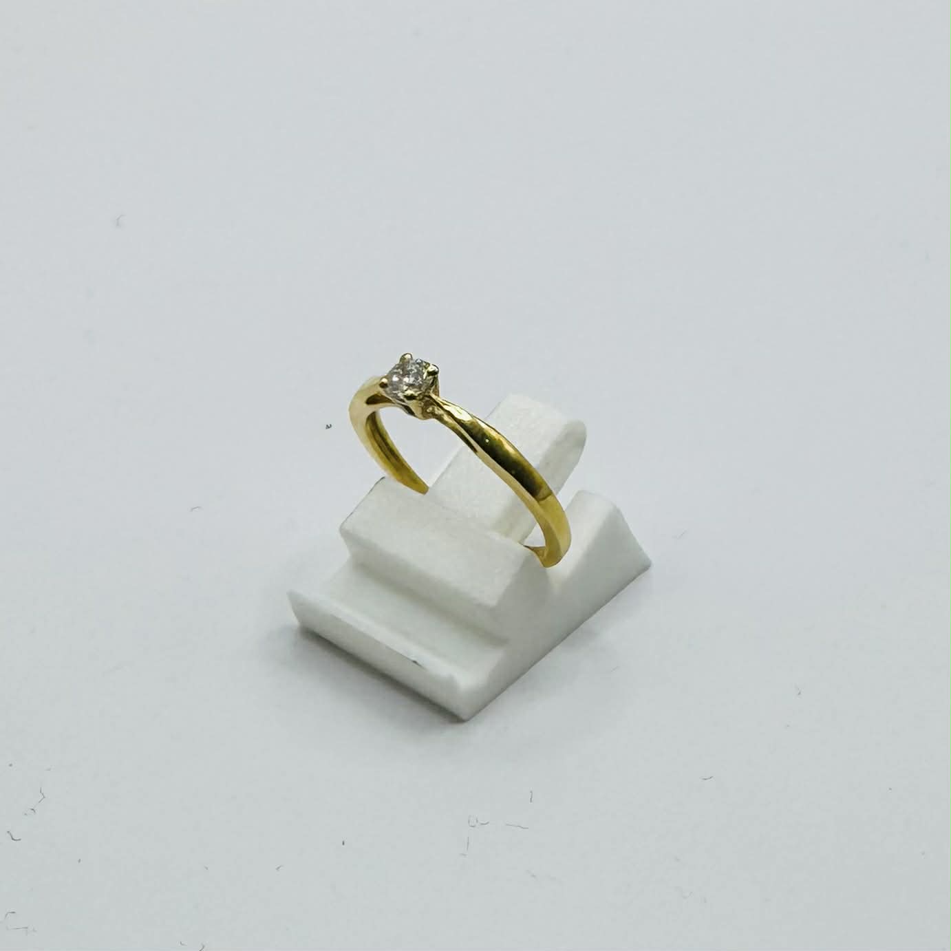 Bague solitaire en or jaune 18 carats (750/1000), mettant en valeur un diamant de 0,16 carat soigneusement serti. Son poids de 1,77 g et sa taille 49 offrent un porté fin et élégant, idéal pour un style intemporel. Poinçonnée 750, cette bague en bon état séduit par la pureté de l’or et l’éclat du diamant, parfaite pour symboliser un moment précieux.