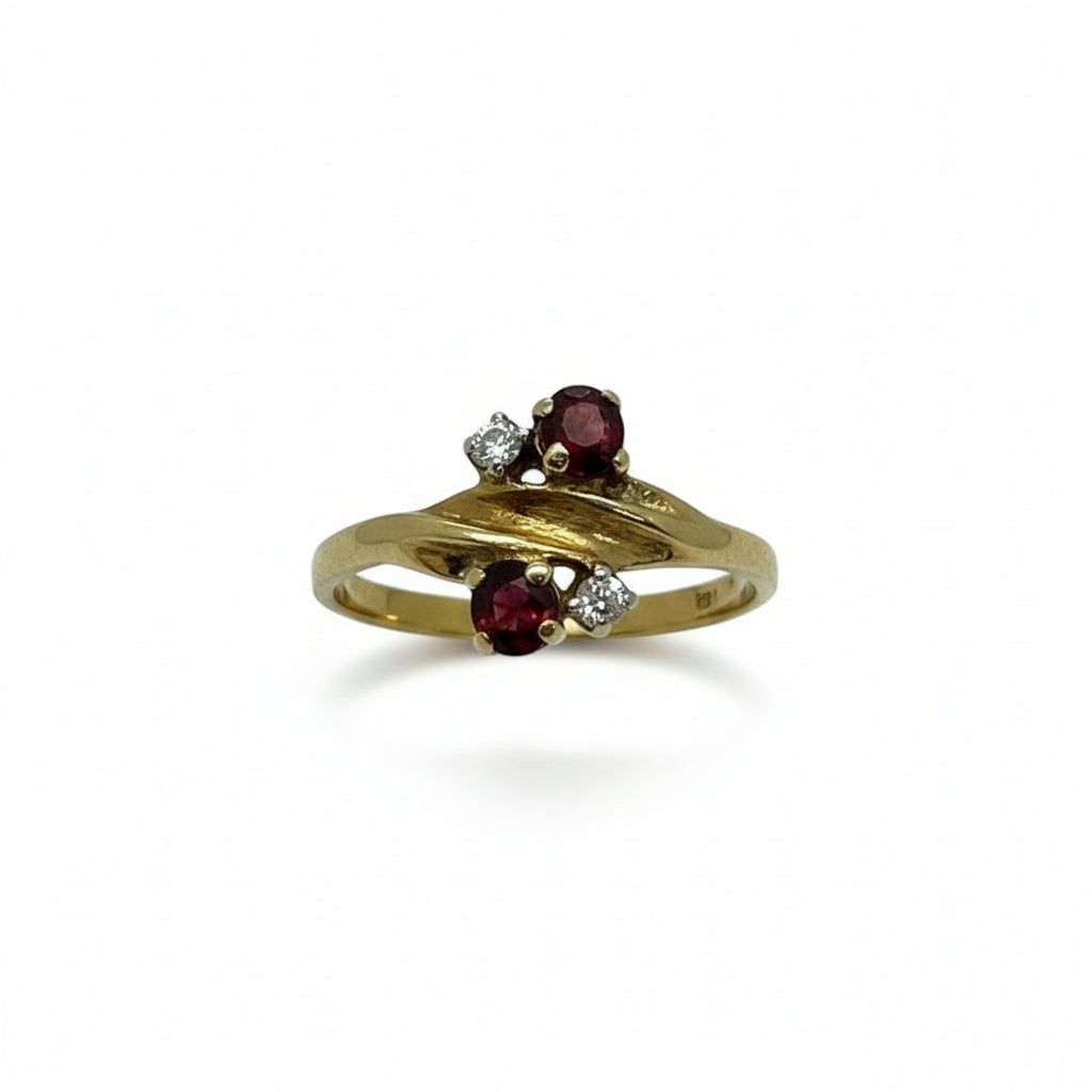 Alliance empierrée en or jaune 750/1000 (18K) sans poinçon, d’un poids de 1,70 g et de taille 49. Sertie de deux rubis de 0,05 ct et de deux oxydes de zirconium de 0,02 ct