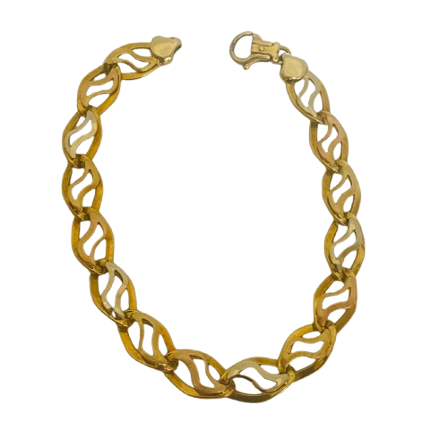 Bracelet à maillons originaux en or jaune, gris et rose 18 carats (750/1000) est en très bon état. Il pèse 7,80 grammes et mesure 19 cm de longueur, avec une largeur de 1 cm et une épaisseur de 5 mm. Monté avec un fermoir mousqueton sécurisé. Le poinçon 750 atteste de la qualité de cet accessoire raffiné.