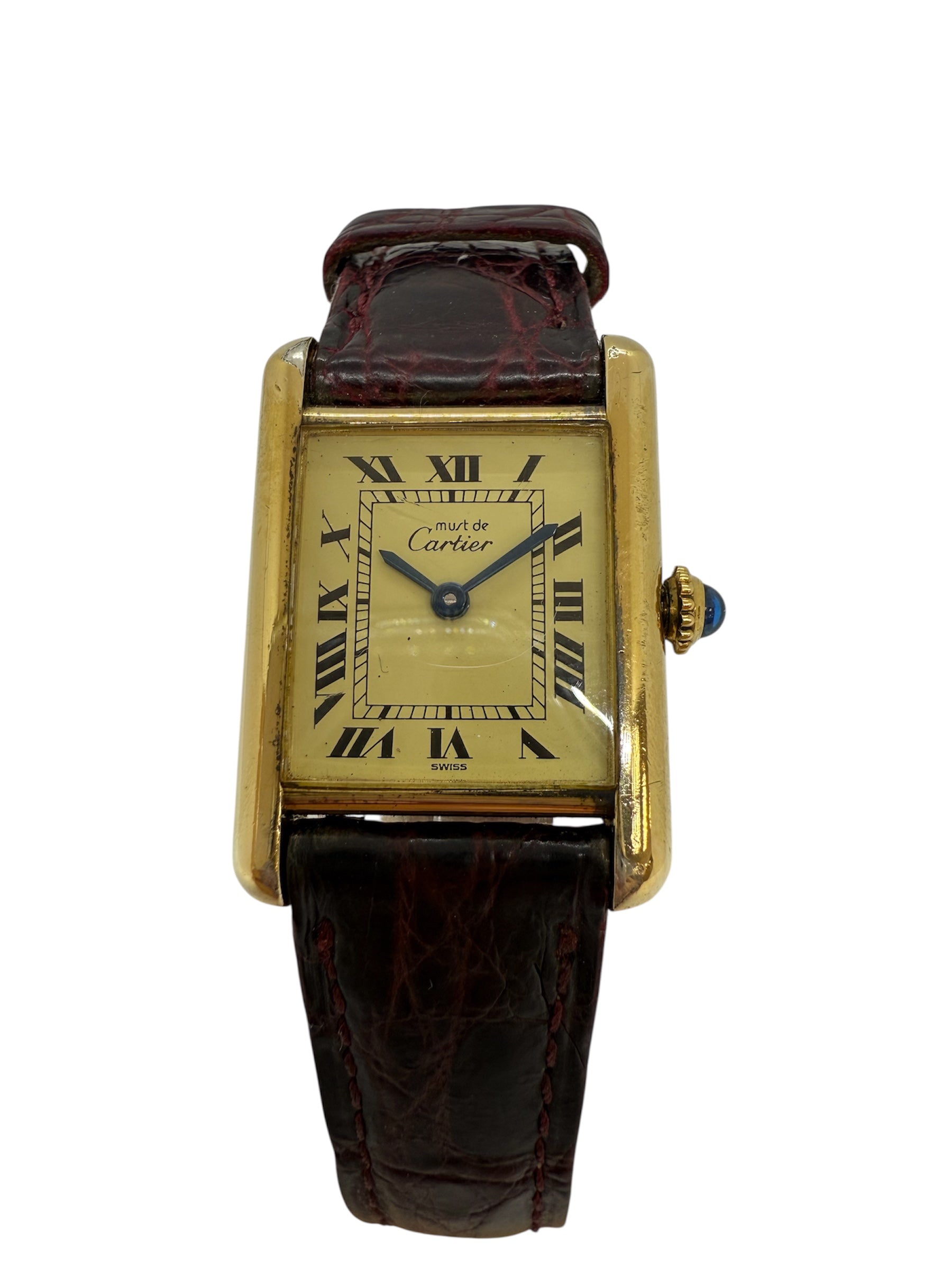 Montre Cartier, modèle Tank Must des années 1980/1990, est en très bon état. De style vintage, elle fonctionne avec un mouvement manuel et un affichage analogique. Son boîtier en vermeil doré mesure 20 mm de diamètre pour 6 mm d’épaisseur, avec un verre acrylique. Elle est montée sur un bracelet en cuir de 14 mm de largeur, fermé par une boucle ardillon, alliant élégance classique et raffinement intemporel.