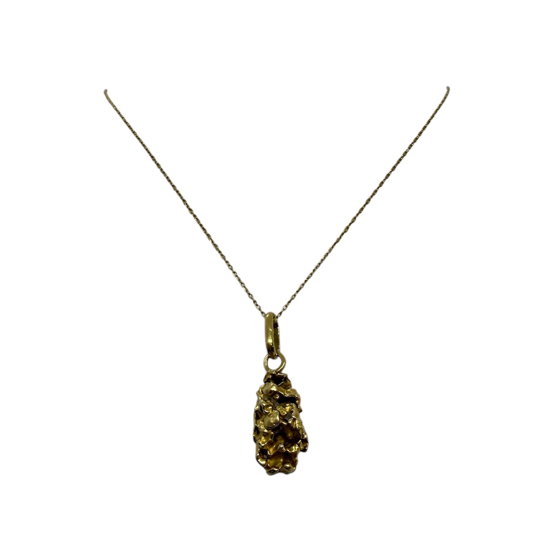 Pendentif solitaire en forme de pépite d’or en or jaune 18 carats (750/1000), sans poinçon. Il pèse 5,61 g et mesure 21 mm de hauteur, 7 mm de largeur et 8 mm d’épaisseur. Le bijou est en très bon état.