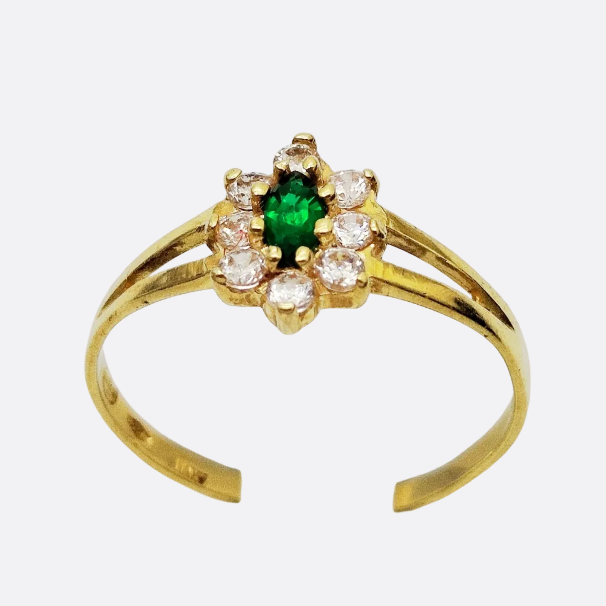 Bague empierrée en or jaune 18 carats (750/1000), poinçonnée 750, alliant finesse et éclat. Sertie d’une émeraude sublimée par des oxydes de zirconium, elle offre un jeu de lumière élégant et raffiné. Avec un poids de 1,60 g et une taille 56, cette bague en bon état.