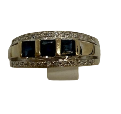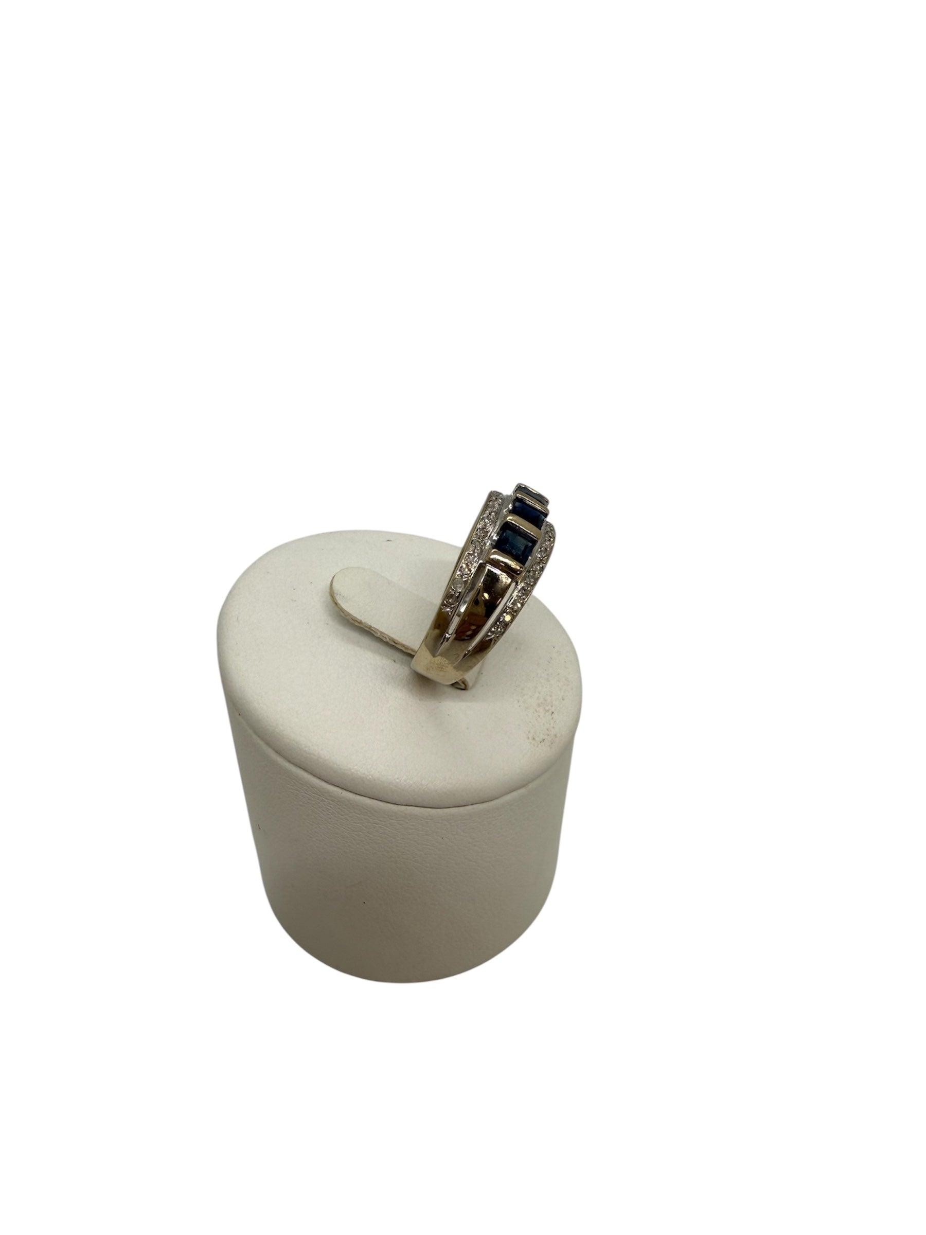 Bague demi-tour empierrée en or blanc 18 carats (750/1000), sans poinçon, d’un poids de 4,18 grammes et de taille 56. Elle est sertie de trois topazes bleues de 0,20 carat chacune, accompagnées de trente pierres incolores naturelles de 0,01 carat, disposées avec finesse sur le demi-anneau. Le bijou est en très bon état général.