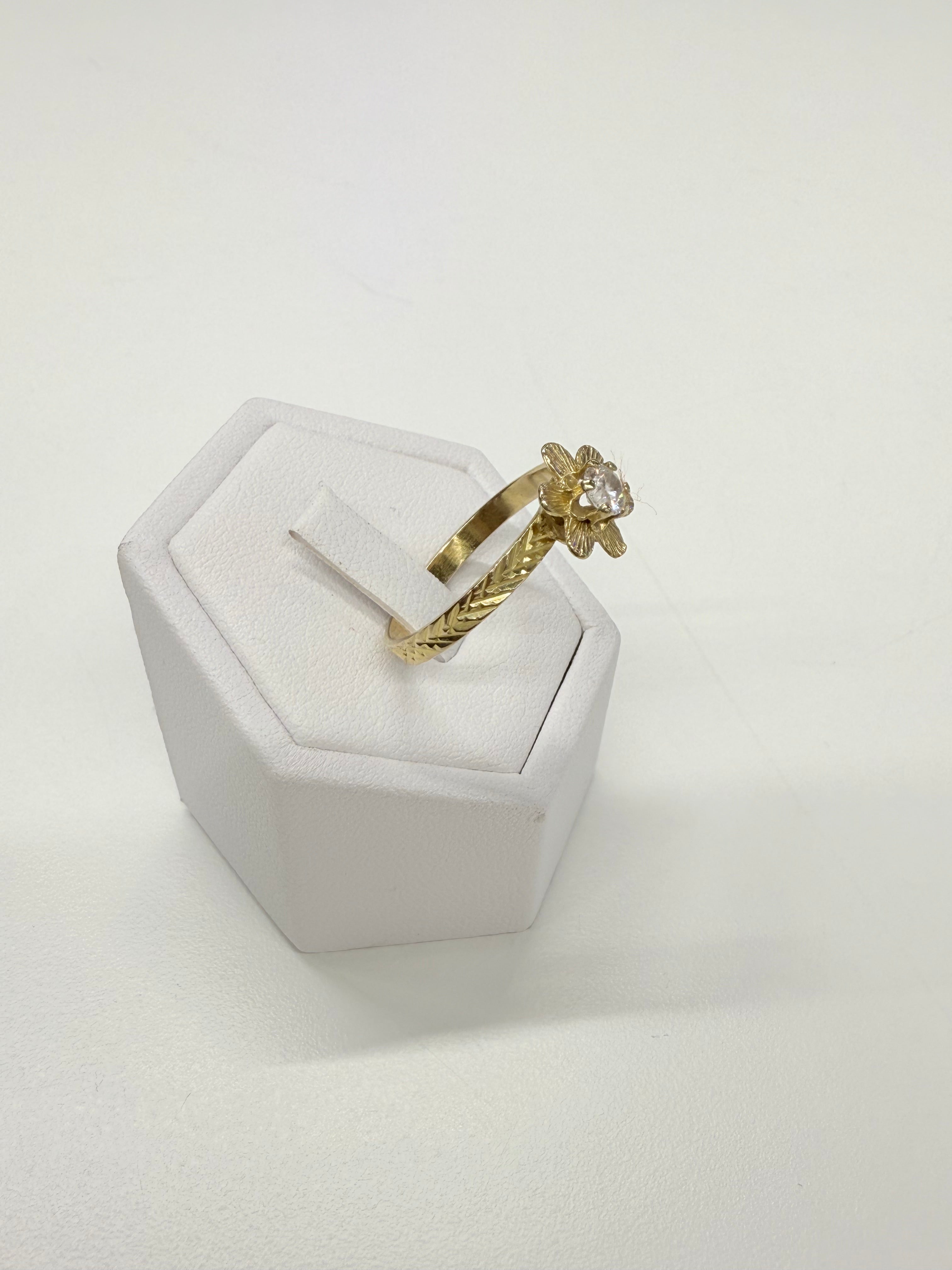 Bague fleur en or jaune 18 carats (750/1000). Pesant 2,86 grammes et de taille 61, cette pièce élégante est sublimée par un oxyde de zirconium étincelant qui rehausse son design floral sophistiqué.