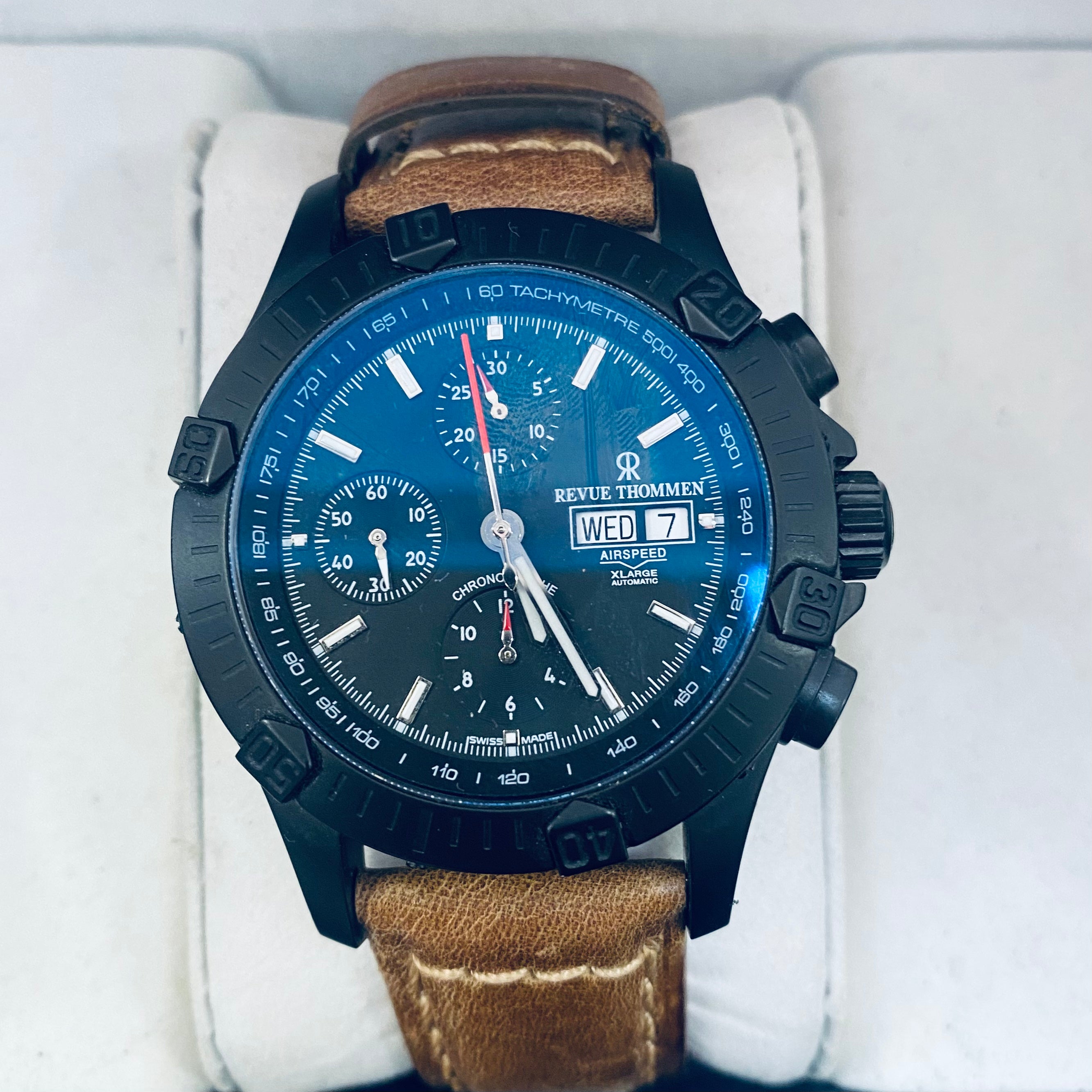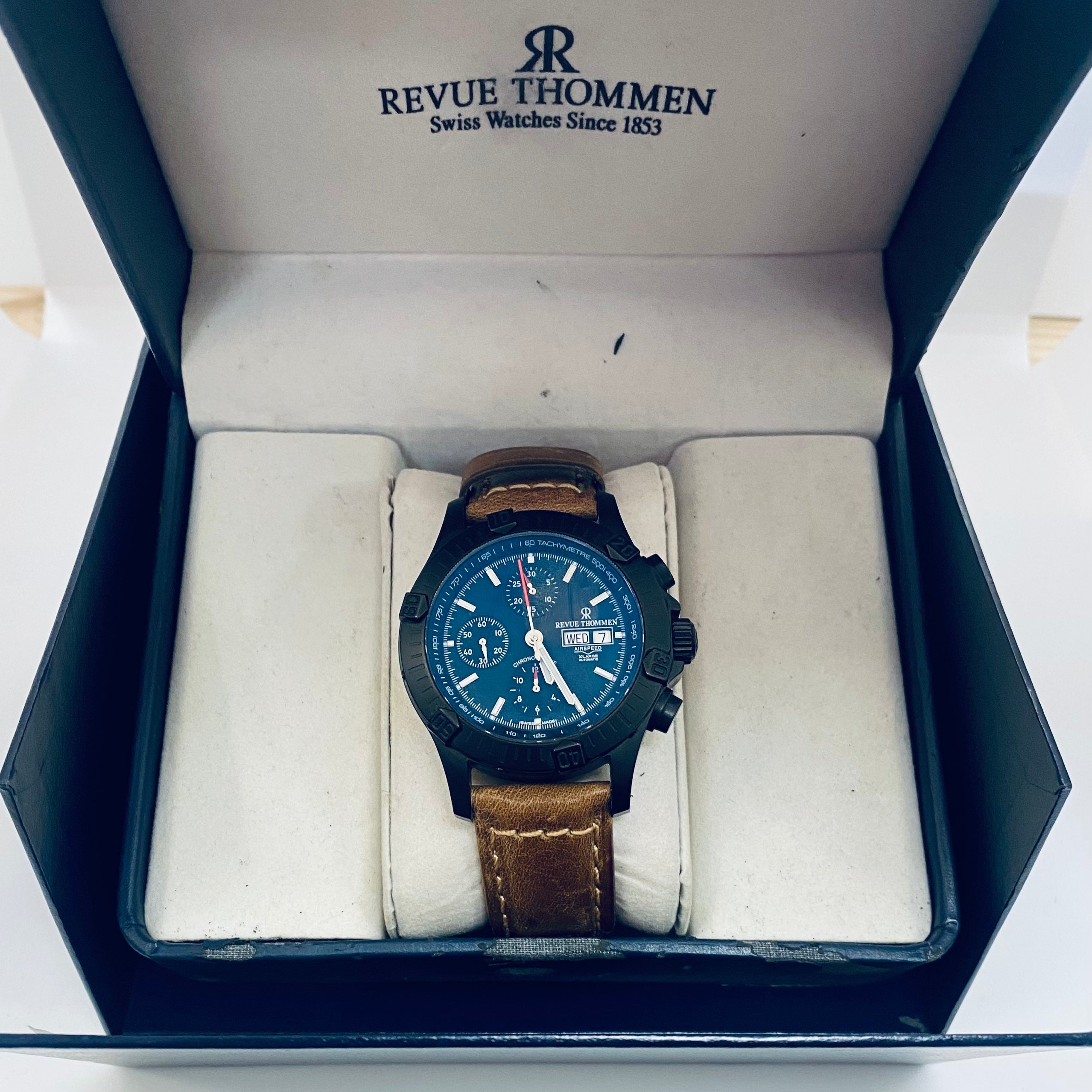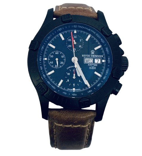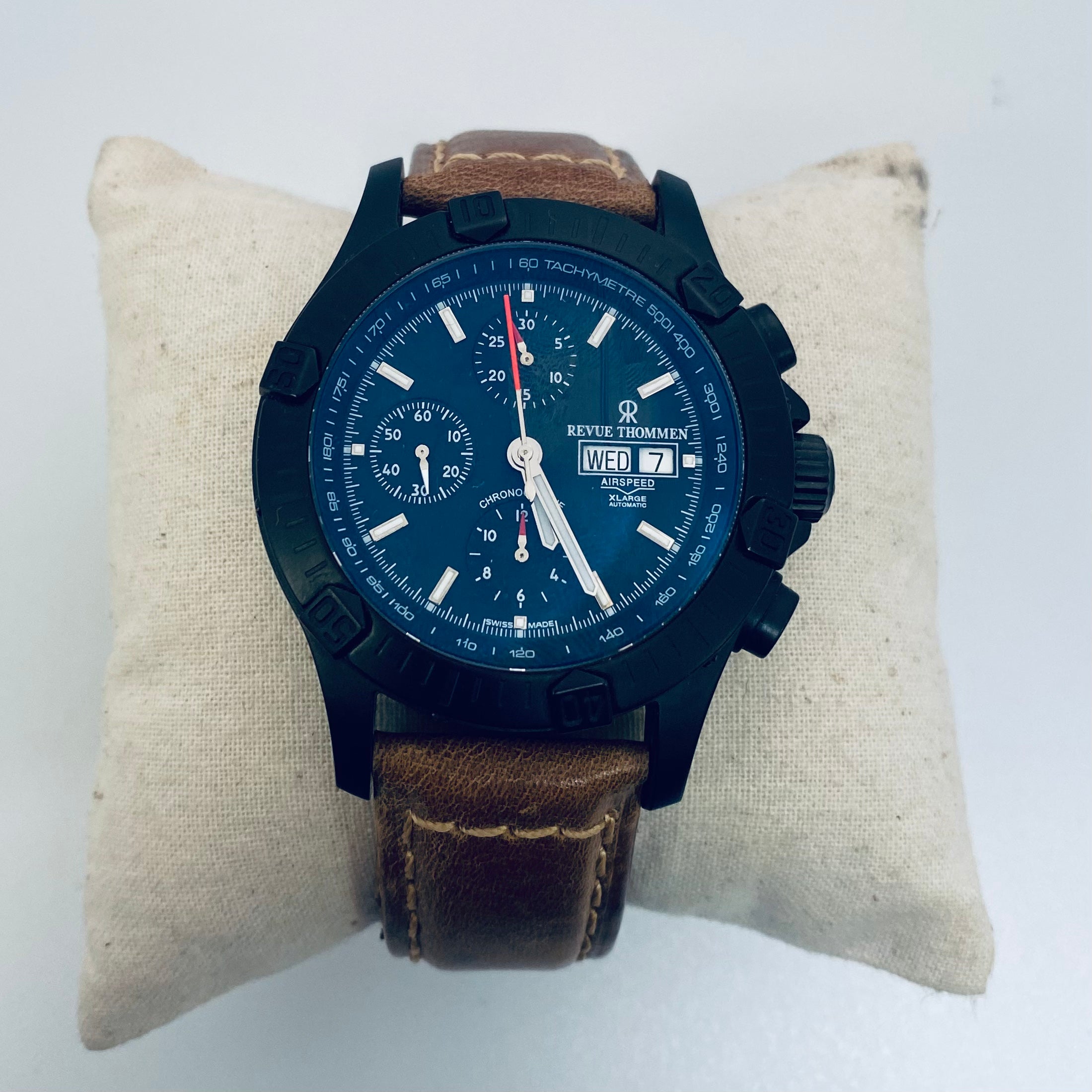 Montre Revue Thommen Air Speed 16071.6, modèle chronographe automatique de l’année 2020, en état comme neuve. Elle dispose d’un boîtier en acier noir de 43,5 mm de diamètre et 14 mm d’épaisseur, protégé par un verre saphir. L’affichage est analogique, et le bracelet en cuir noir, large de 24 mm, est équipé d’une boucle ardillon classique.