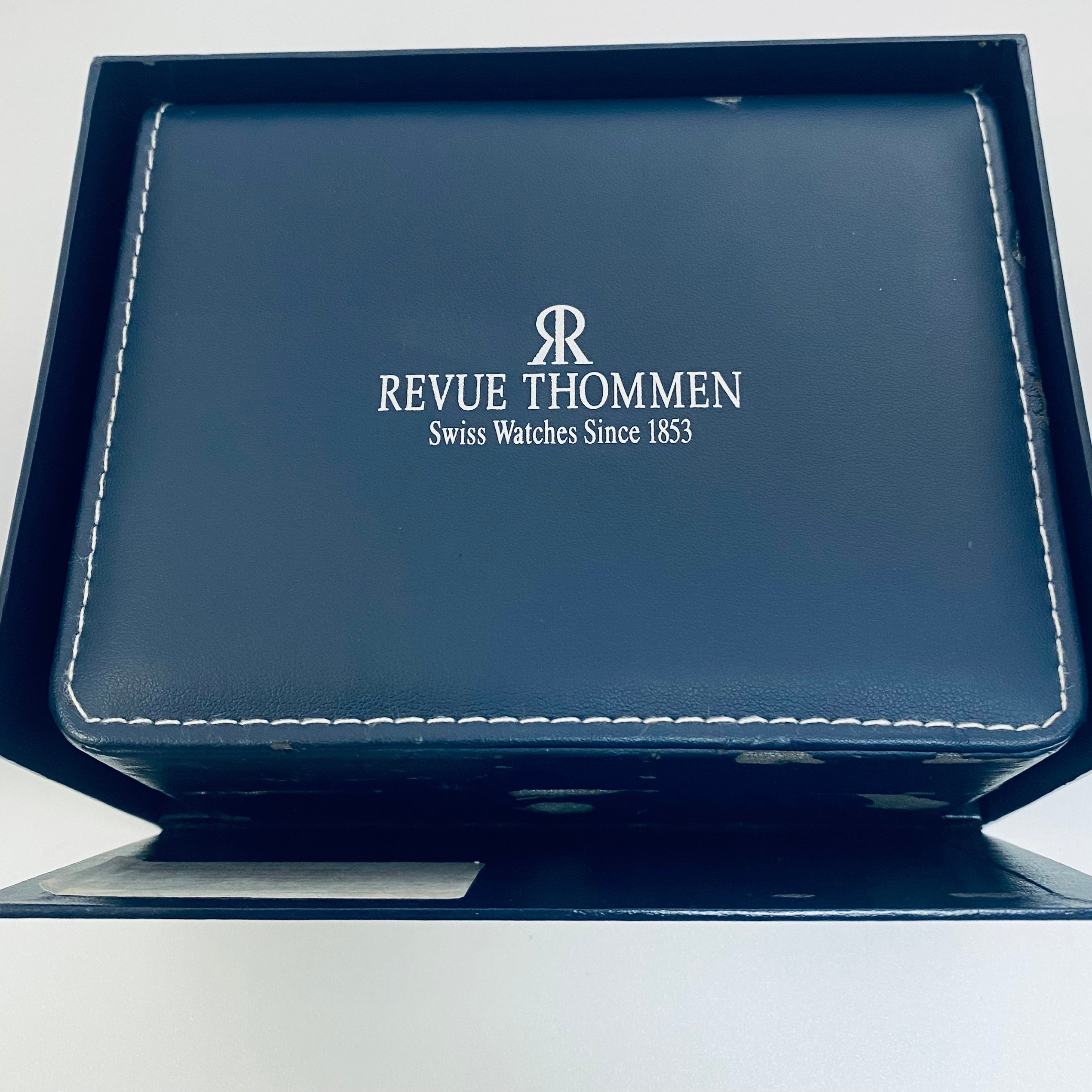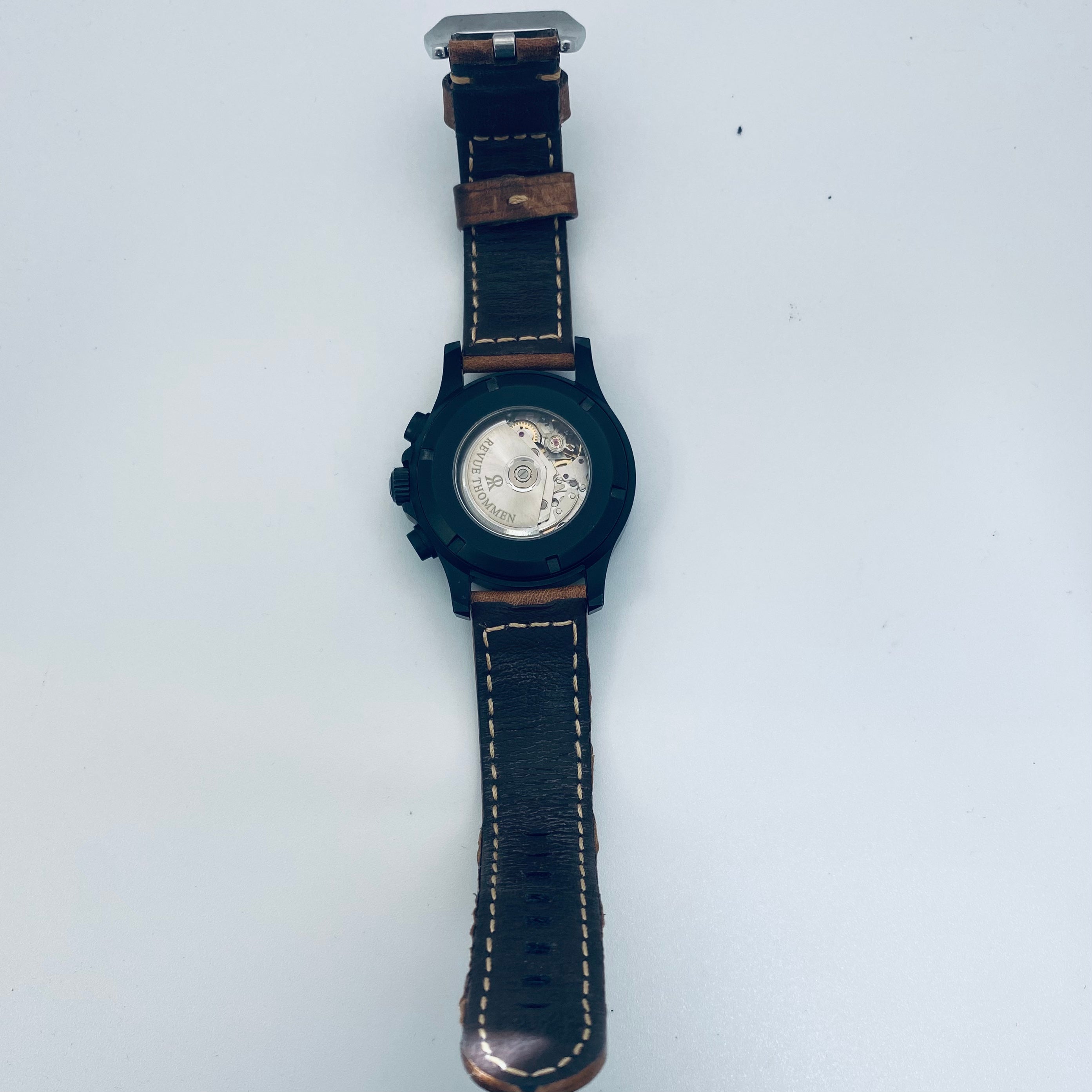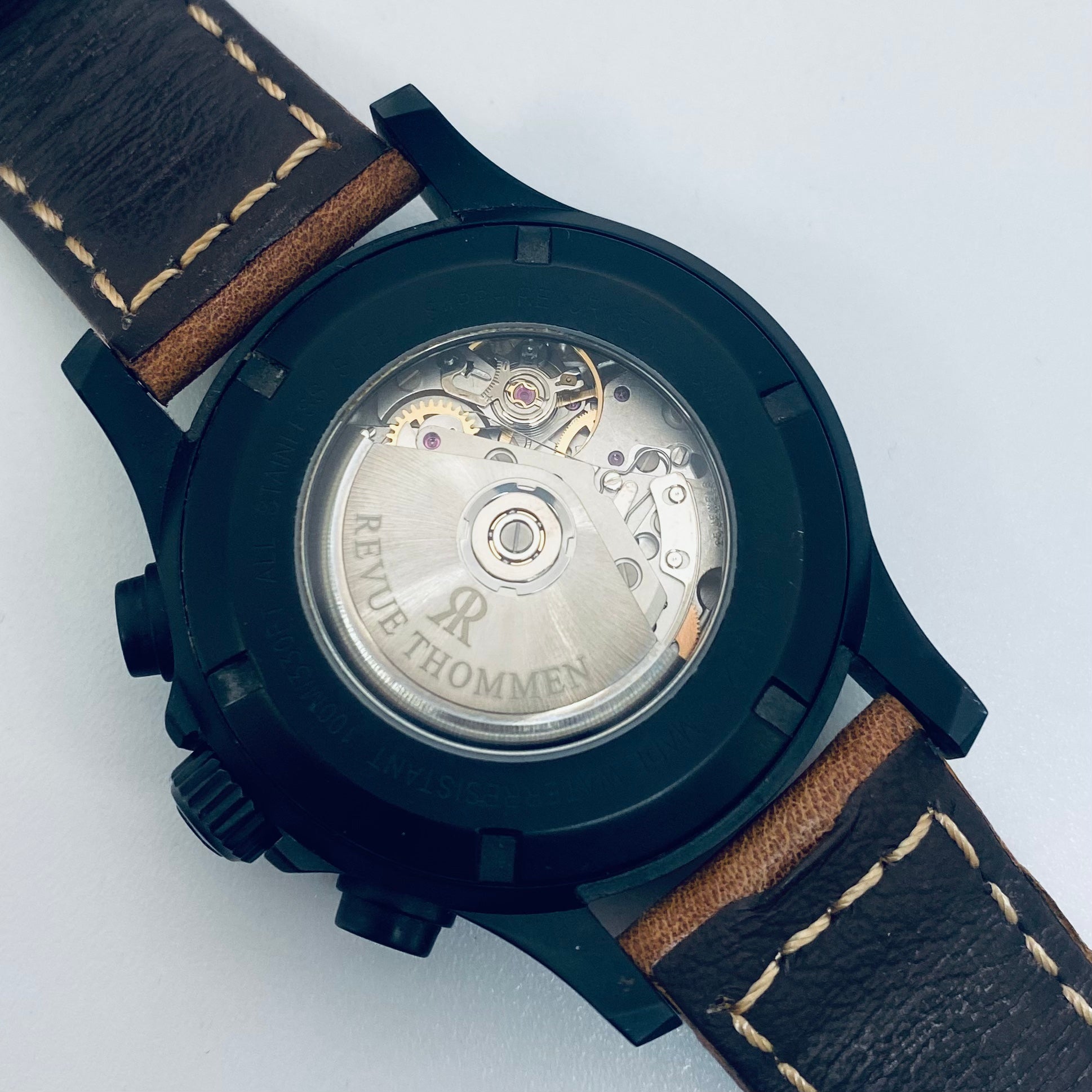 Montre Revue Thommen Air Speed 16071.6, modèle chronographe automatique de l’année 2020, en état comme neuve. Elle dispose d’un boîtier en acier noir de 43,5 mm de diamètre et 14 mm d’épaisseur, protégé par un verre saphir. L’affichage est analogique, et le bracelet en cuir noir, large de 24 mm, est équipé d’une boucle ardillon classique.