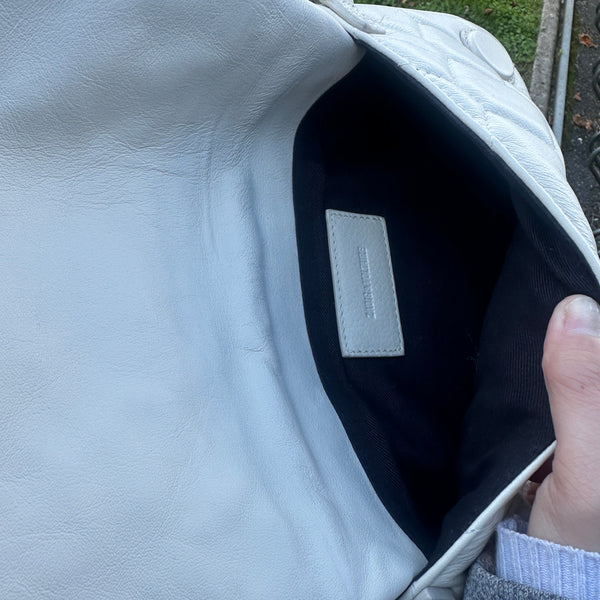 Sac à main type bandoulière, marque Zadig & Voltaire, modèle Rock Nano XL MatScale, coloris blanc cassé, 100 % cuir de vachette, dimensions 16 × 27 × 5 cm, profondeur 11 cm, état avec traces d’usure importantes, sans accessoire fourni.