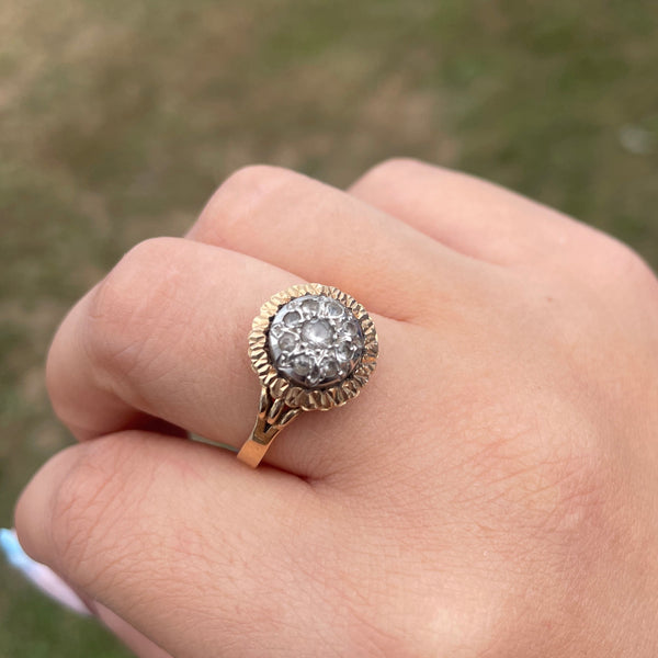 Bague ancienne de type demi-tour en or jaune et or blanc 18 carats (750/1000), poinçonnée avec une tête d’aigle. Elle pèse 4,20 grammes et est proposée en taille 56. Le bijou est orné de plusieurs oxydes de zirconium, ajoutant une touche d’éclat. Il est en bon état général.