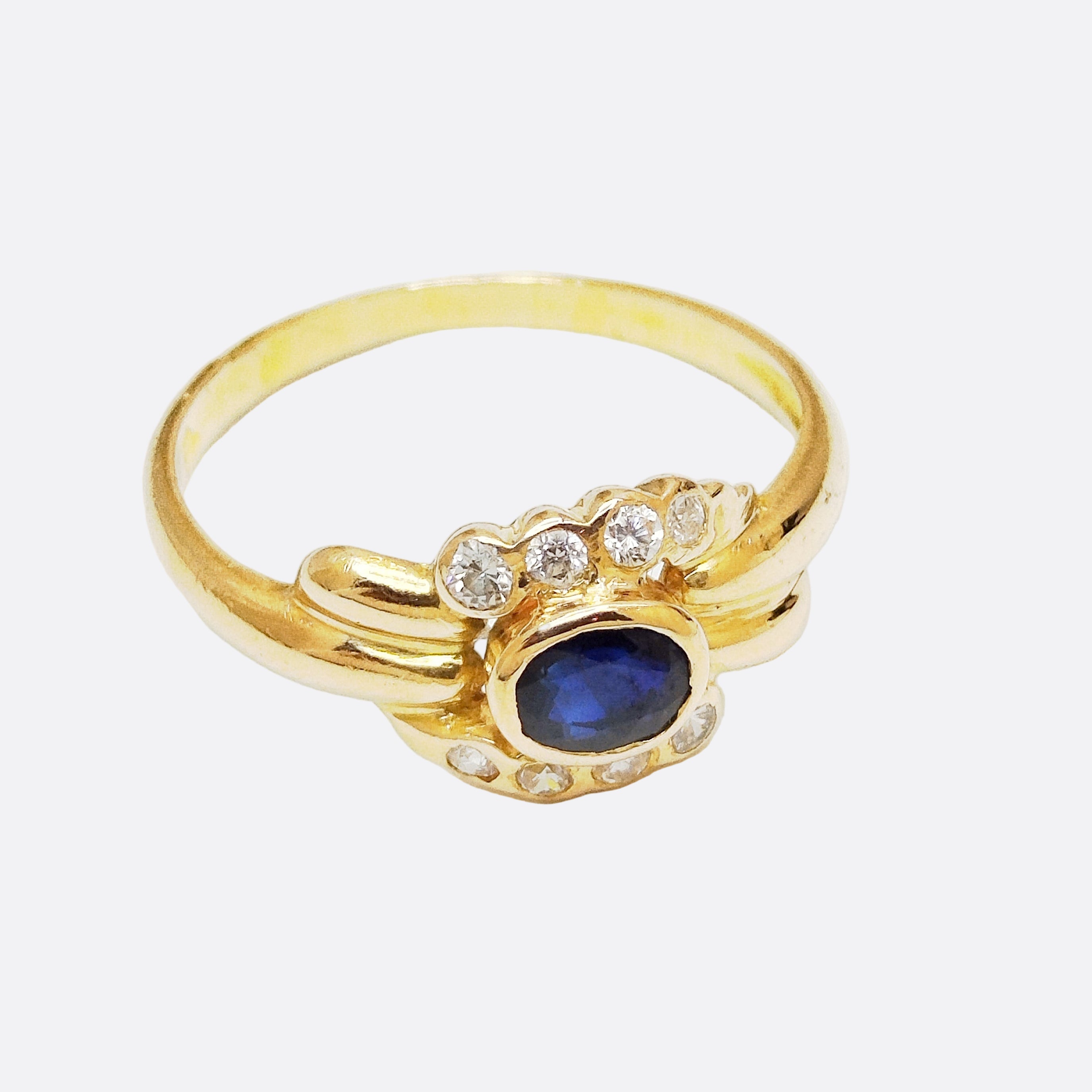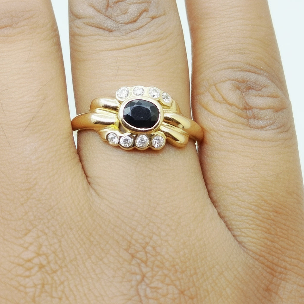 Bague empierrée en or jaune 750/1000 (18 carats), poinçon Tête d’Aigle, d’un poids de 2,80 g et taille 54. Sertie de saphirs et d’oxydes de zirconium, elle offre un contraste élégant entre profondeur et brillance. Proposée en bon état, c’est un bijou raffiné et durable, idéal pour compléter une collection de qualité.