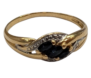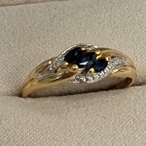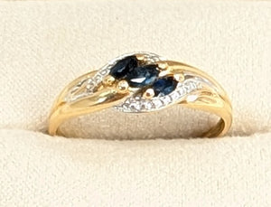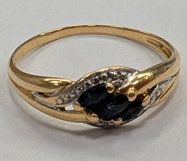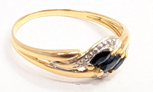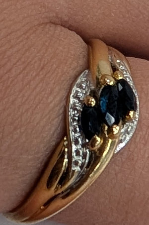 Bague empierrée en or jaune 18 carats (750/1000), sans poinçon. Sertie de 3 saphirs naturels bleus de 0,02 carat chacun. Taille 55, poids : 1,80 g. En très bon état. Un bijou fin et coloré, idéal pour une touche d'élégance discrète.