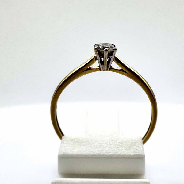 Raffinement absolu : cette bague en or jaune 750/1000, ornée d'une pierre blanche lumineuse, est une ode à l'élégance et à la pureté.