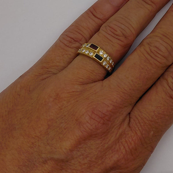 Bague empierrée en or jaune 18 carats (poinçon tête d’aigle 916/1000), poids 4,69 grammes, taille 56. Elle est ornée d’oxydes de zirconium et se trouve en bon état.