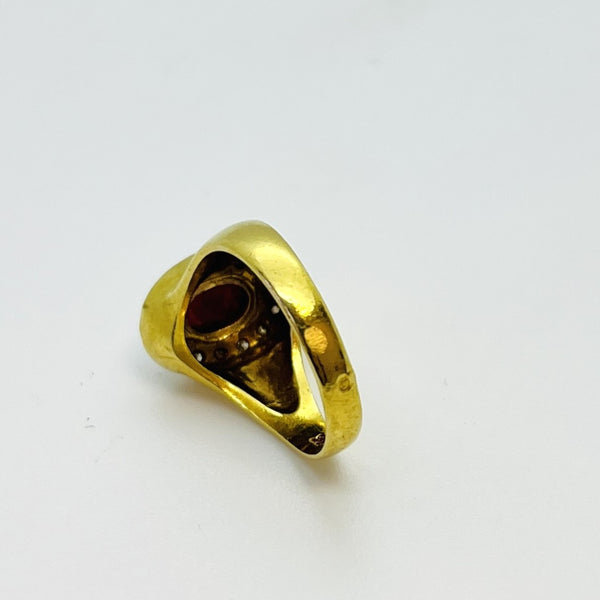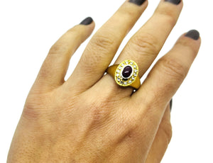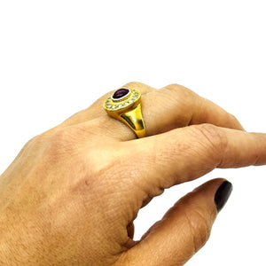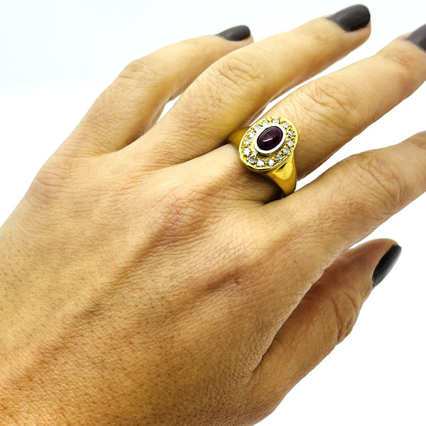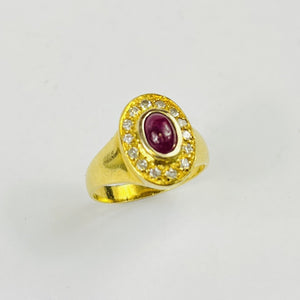 Etat : Bon Etat Belle bague en or jaune 750/1000 à chaton ovale ornée d'un cabochon de racine de rubis dans un entourage de diamant