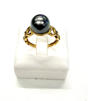 Bague en perle de Tahiti en or jaune 18 carats (750/1000), poinçonnée tête d’aigle. Elle est sertie d'une perle de Tahiti d'environ 0,8 cm et pèse 4,09 grammes. Taille 50. Très bon état.