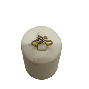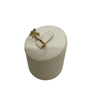 Bague empierrée en or jaune et or blanc 18 carats (750/1000), sans poinçon, d’un poids de 1,57 gramme et de taille 52. Elle est sertie de trois éclats de diamants de 0,01 carat chacun, apportant une touche de brillance discrète. Le bijou est en très bon état général.