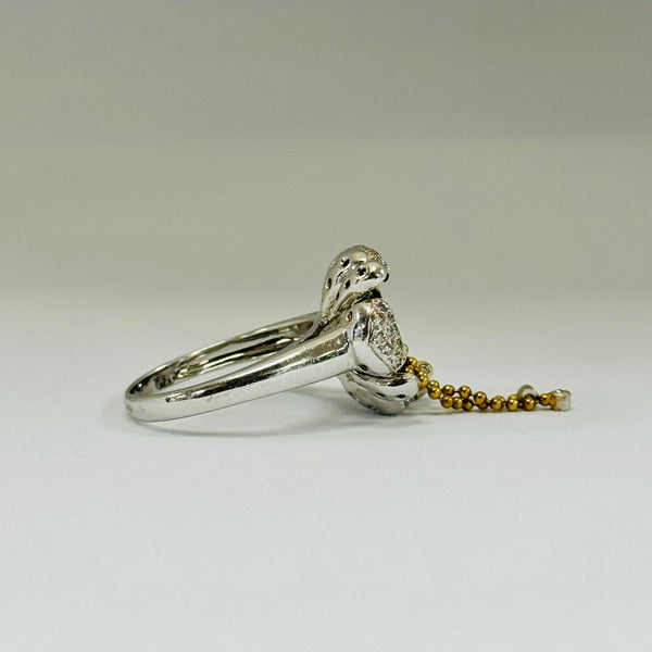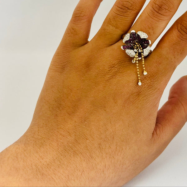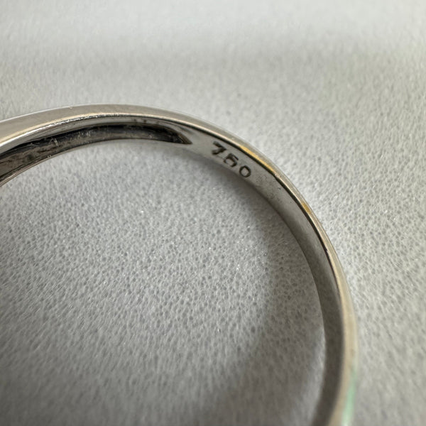 Bague en or blanc 18 carats (750/1000), poinçonnée 750, d’un poids de 8 grammes et proposée en taille 54. Le type de modèle ainsi que la nature des pierres ne sont pas connus, mais l’ensemble présente une belle finition et est en très bon état.