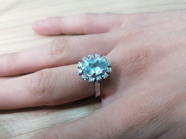 Bague marguerite en or blanc 18 carats (750/1000), poinçonnée tête d'aigle, pèse 4.91 grammes. De taille 58, elle est sertie d'une aigue-marine accompagnée de 12 diamants de 0.02 cts chacun. En très bon état, elle combine raffinement et éclat.
