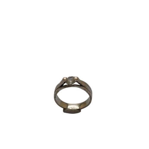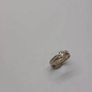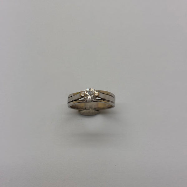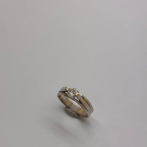 Bague solitaire en or blanc 18 carats (750/1000), d’un poids de 3,15 grammes. Elle est de taille 48 et ne présente pas de poinçon. La bague est sertie d’un oxyde de zirconium unique. Elle est en bon état général.