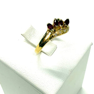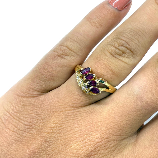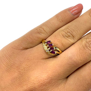 Bague empierrée en or jaune 18 carats (750/1000), poinçonnée 18K. Elle pèse 3,49 grammes et est de taille 54. Le bijou est serti de 4 rubis et de 5 éclats de diamants, offrant un contraste élégant entre les pierres. La bague est en très bon état général.