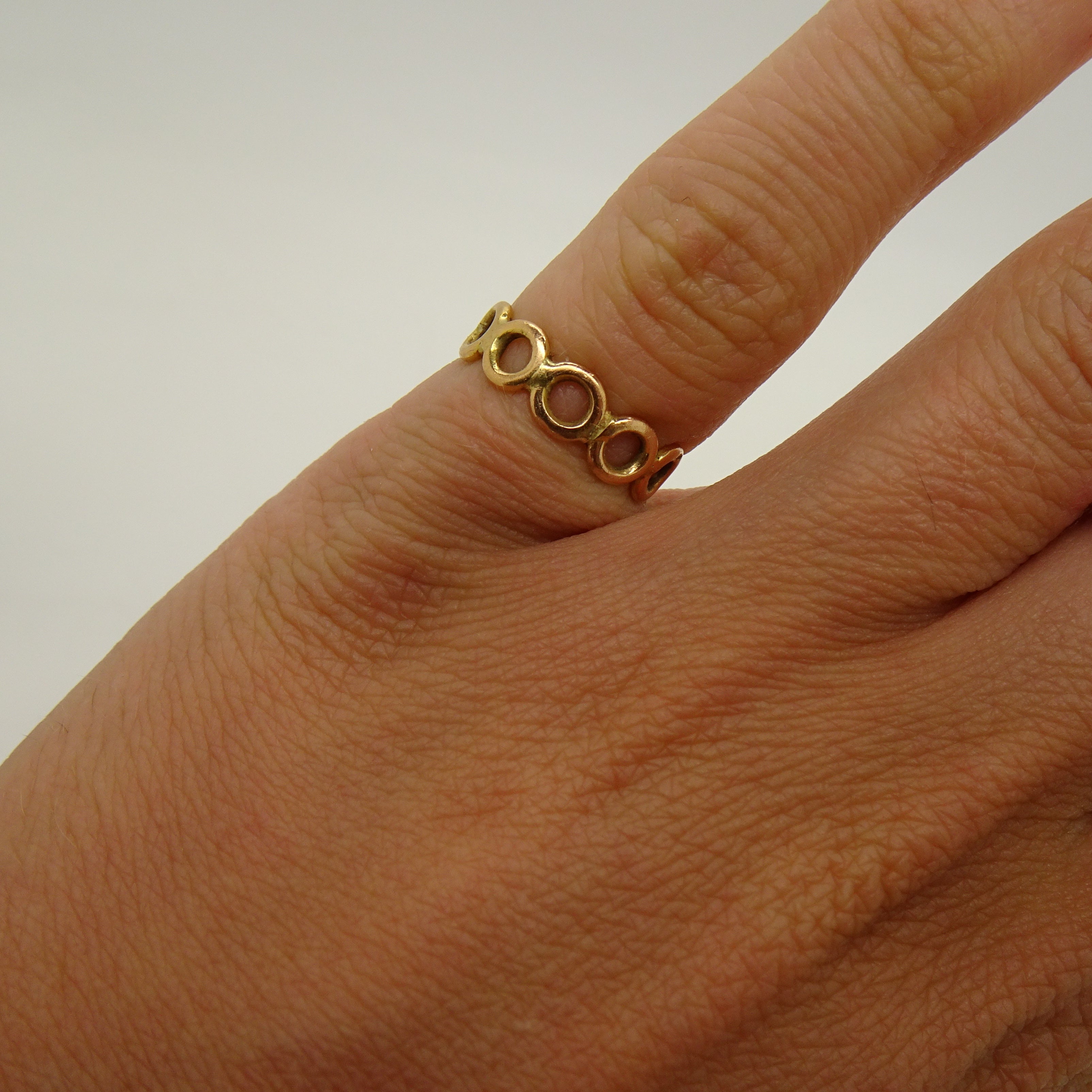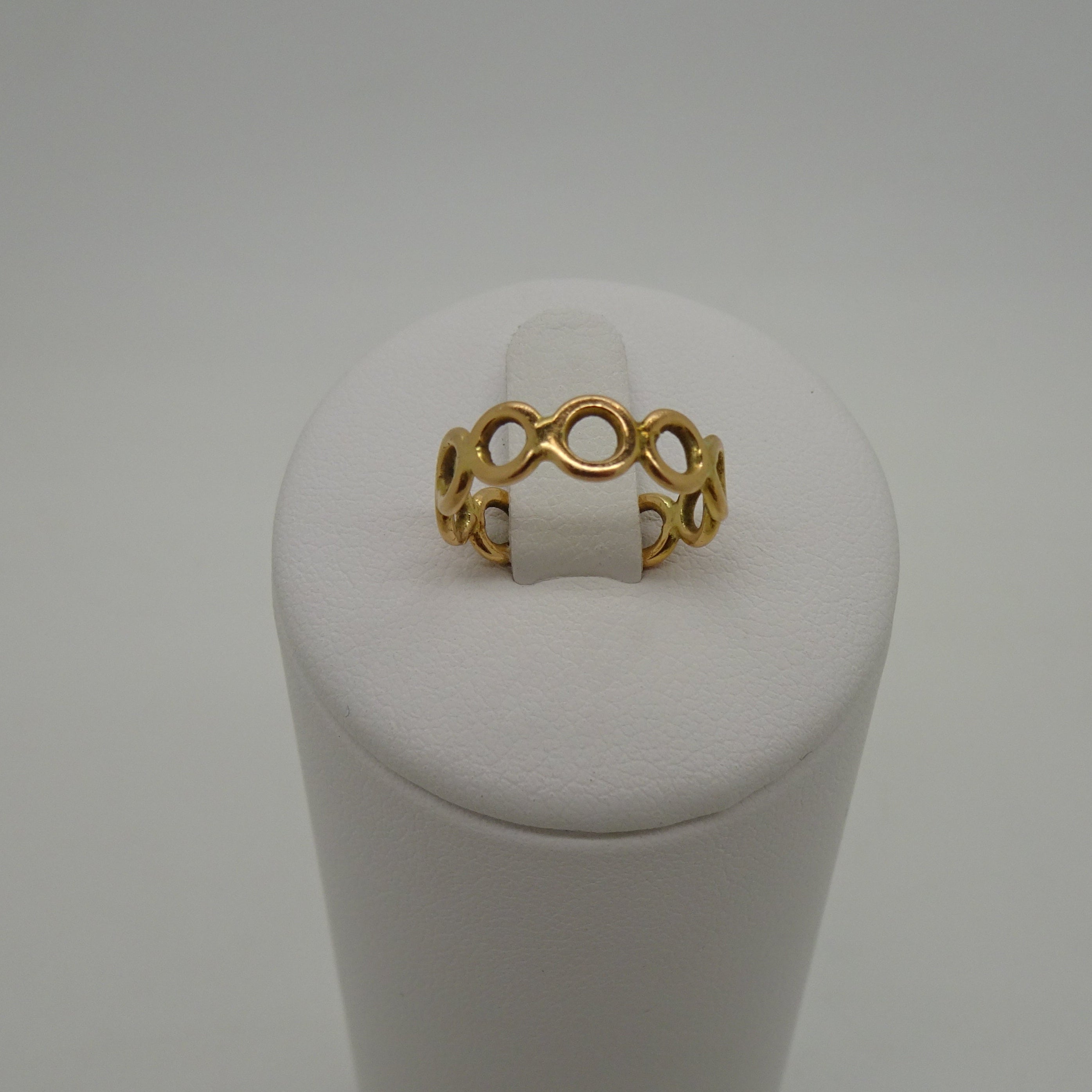 Anneau en or jaune 18 carats (750/1000), poinçonné tête d’aigle. D’un poids de 1,89 gramme et de taille 45, il se distingue par son design épuré, sans pierres. L’ensemble est en très bon état.