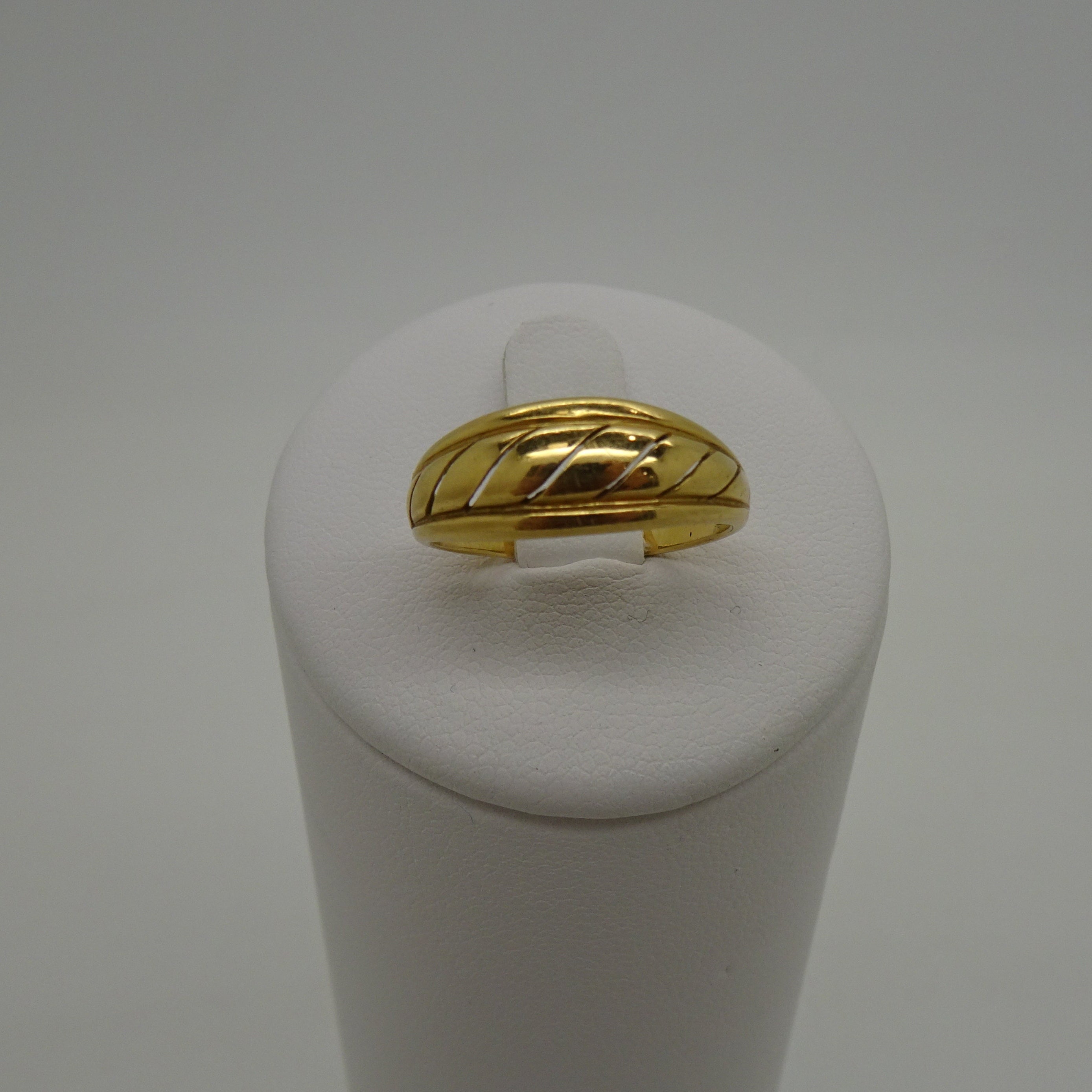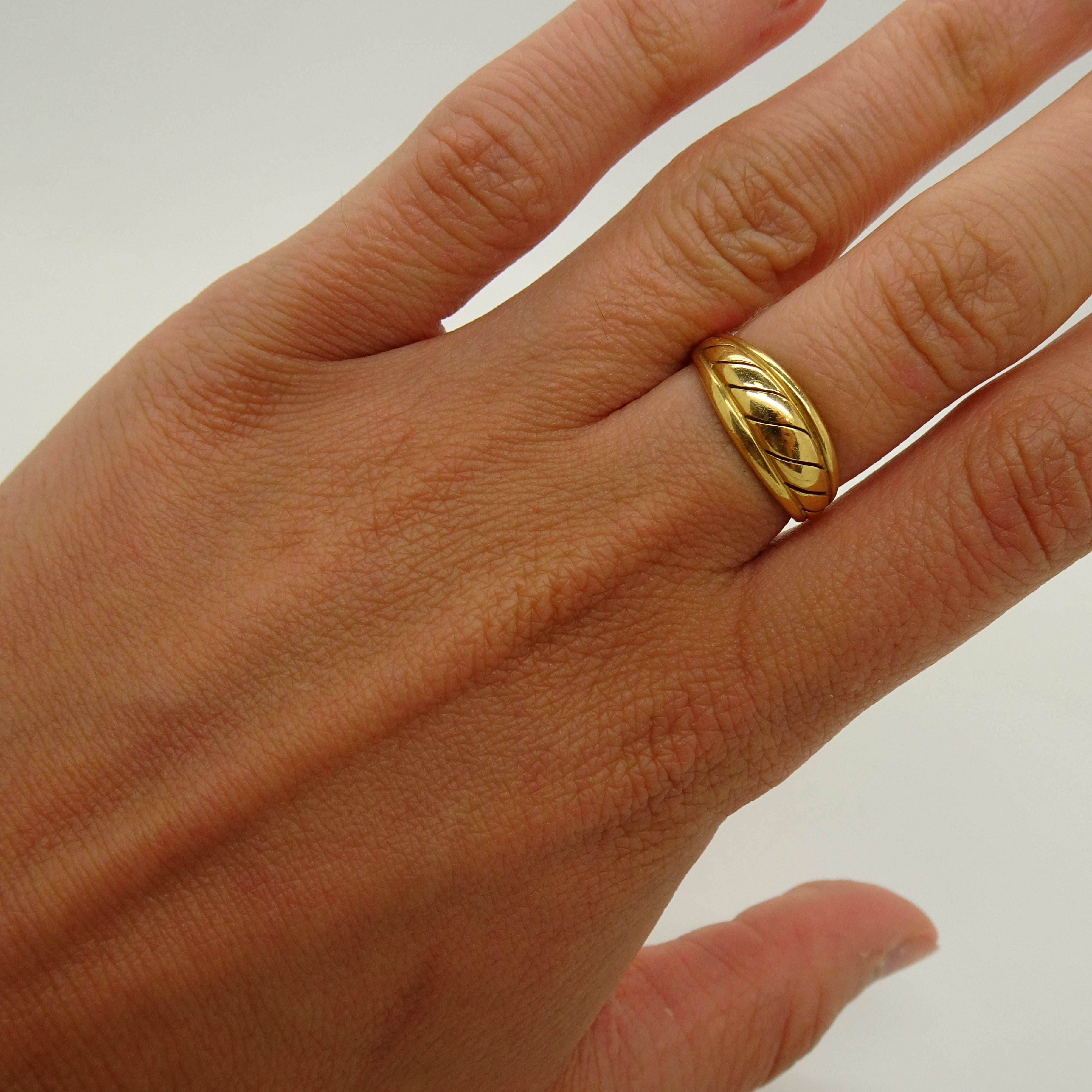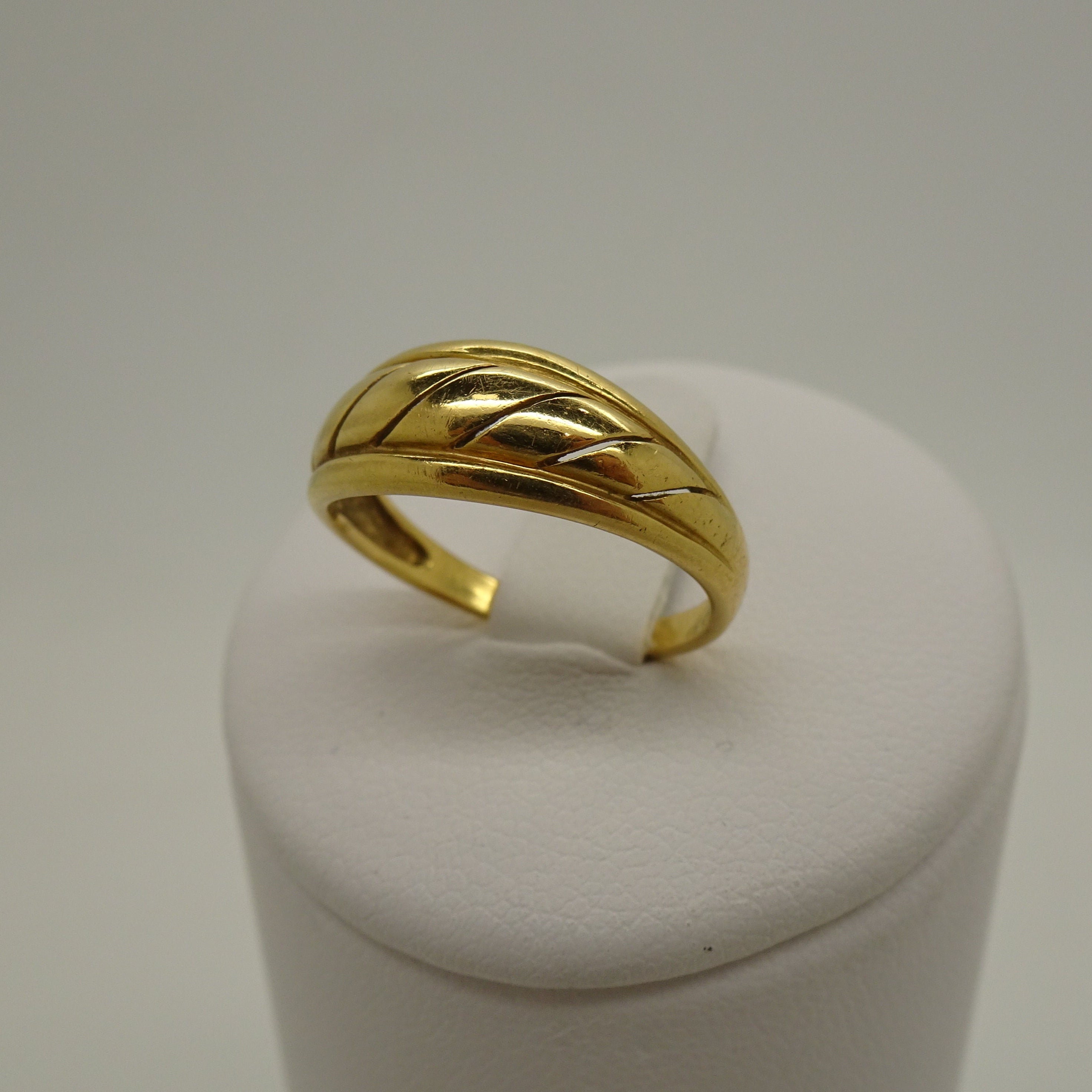 Anneau en or jaune 18 carats (750/1000), poinçonné tête d’aigle. Il pèse 2,68 grammes et est de taille 52. Ce modèle sans pierre se distingue par sa sobriété et est en très bon état.