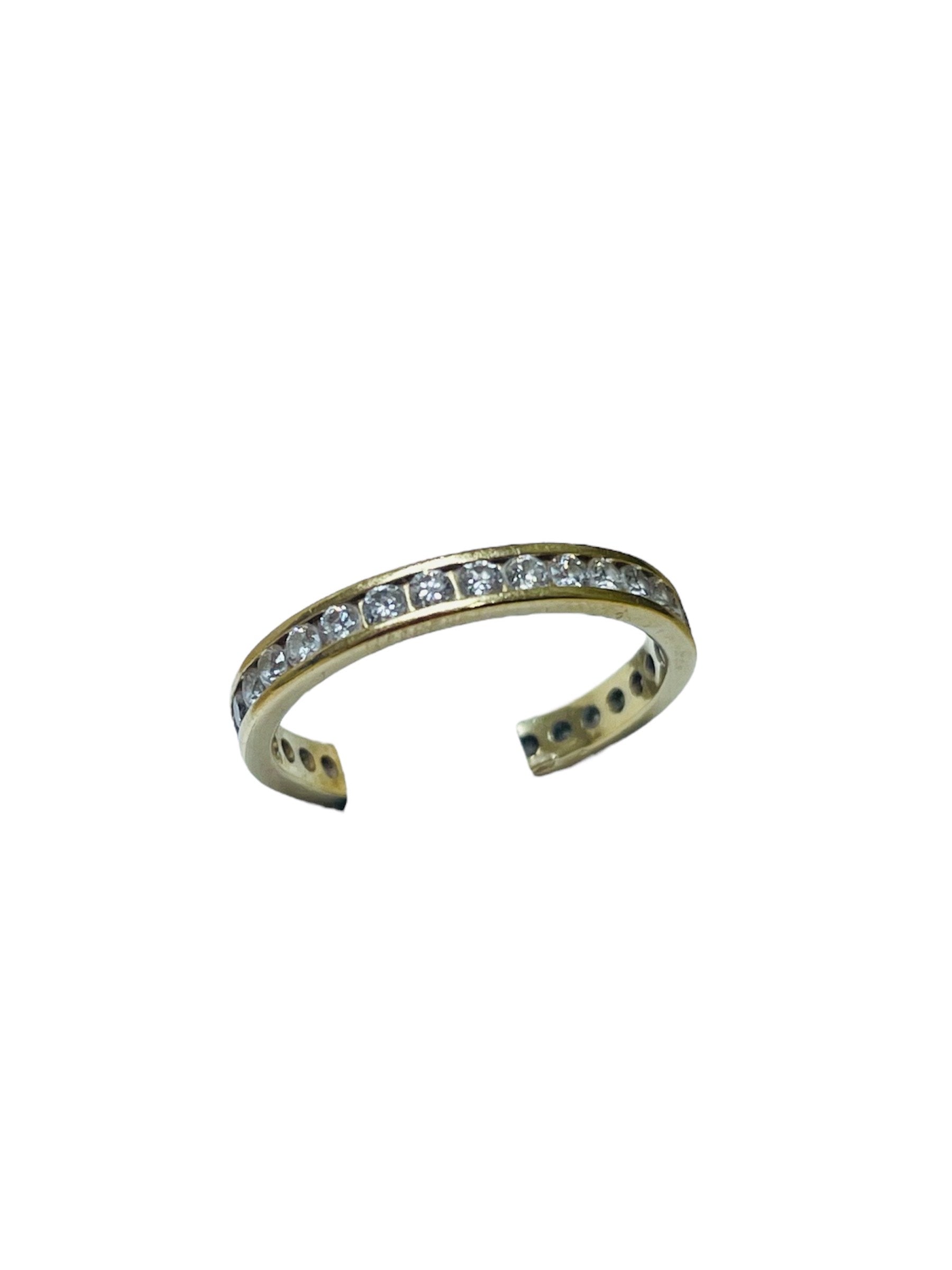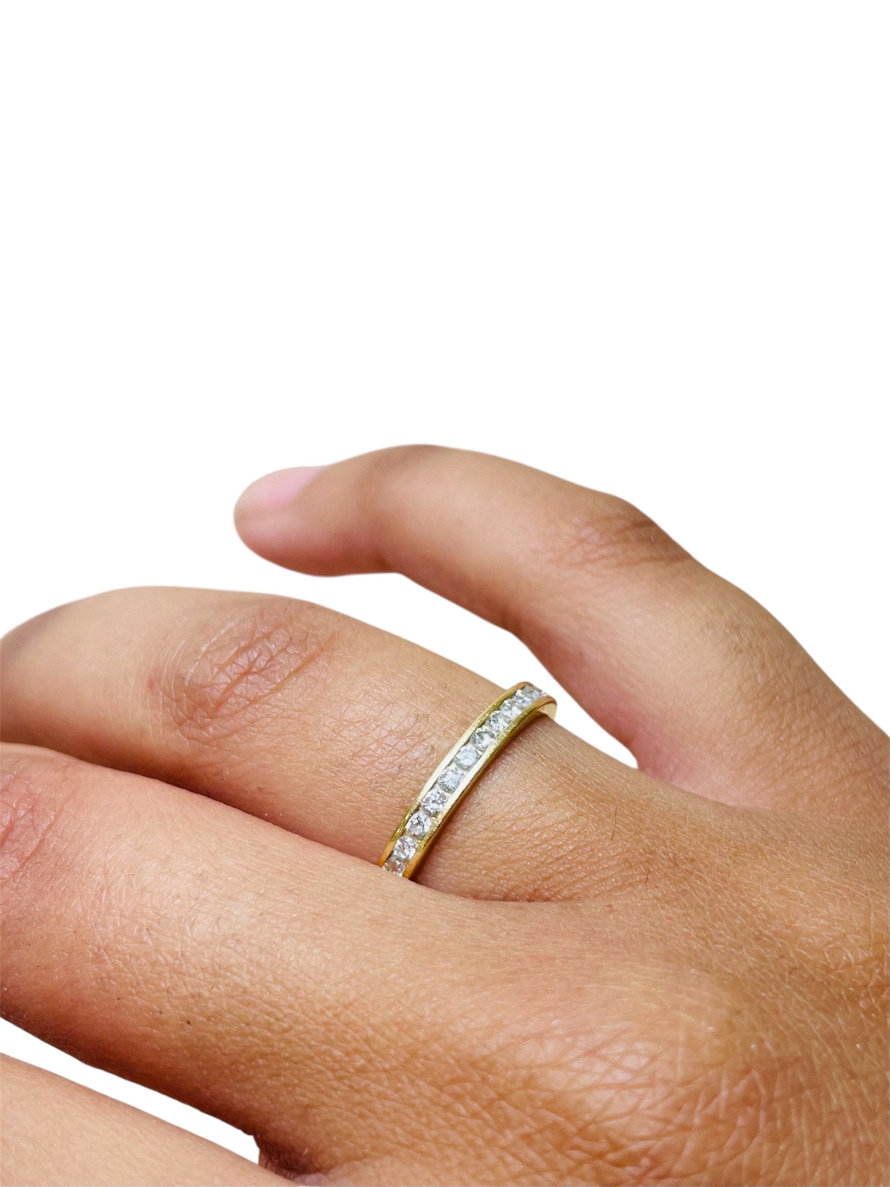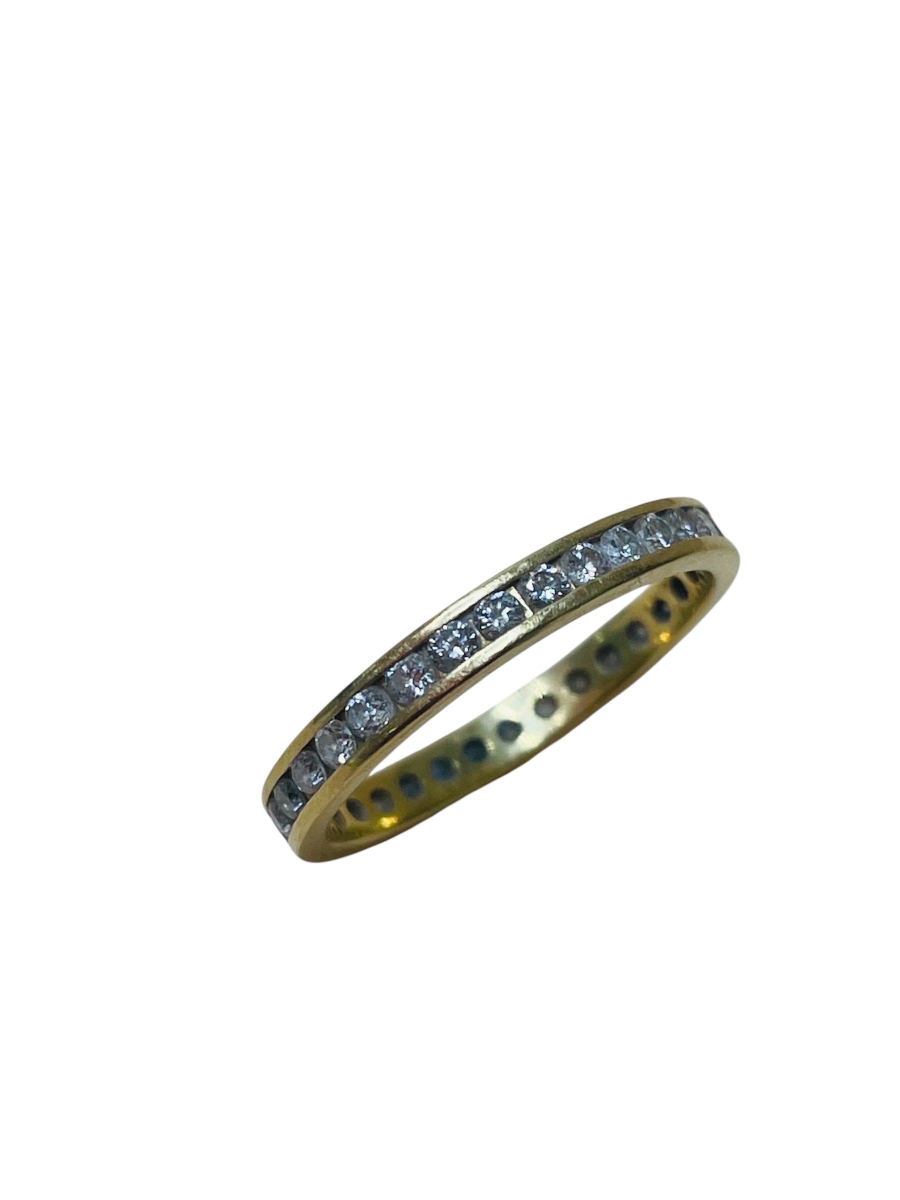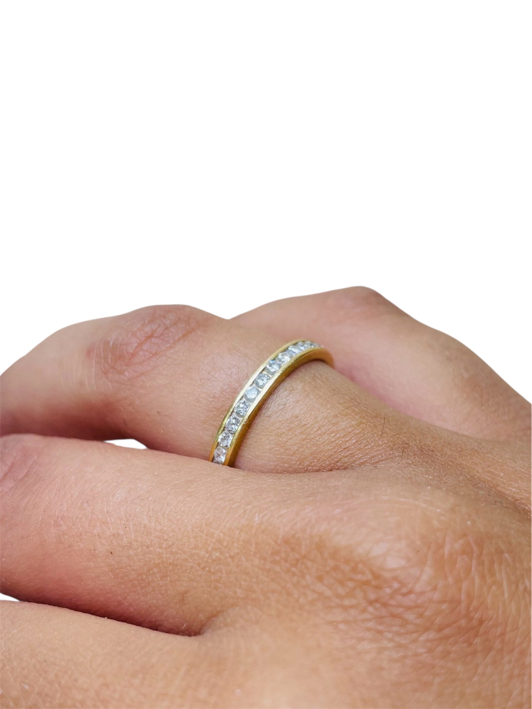 Alliance tour complet en or jaune 18 carats (750/1000), sans poinçon. Elle pèse 1,97 gramme et est de taille 50. Le modèle est serti de 34 diamants de 0,01 carat chacun, offrant un éclat discret et élégant. La bague est en bon état.