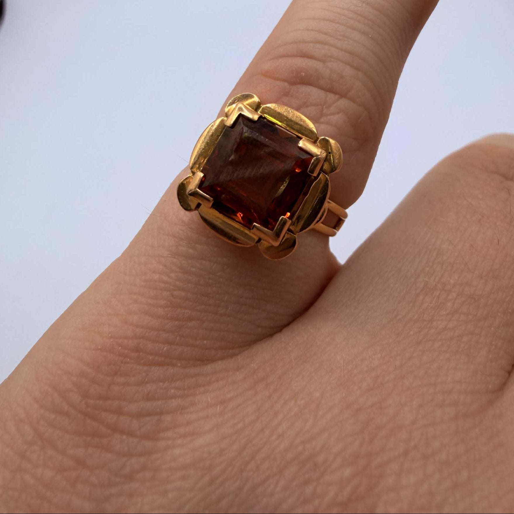 bague empierrée en or jaune 18 carats (750), 4,97 g, taille 51,5, ornée d’une pierre d’ambre. Bon état, poinçon tête d’aigle.