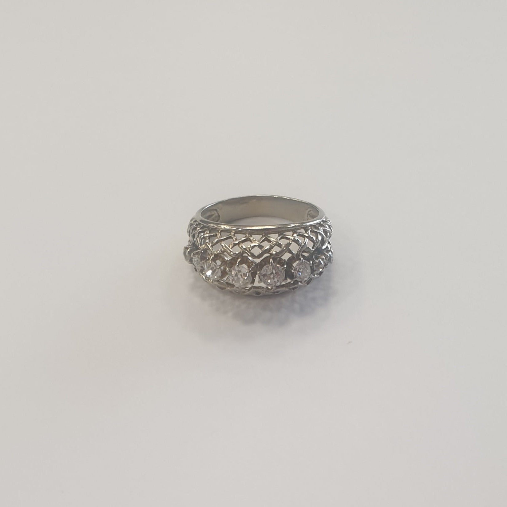 Charmante bague ancienne en or gris 18 carats, poinçonnée Tête d’Aigle, sertie de 8 diamants de tailles variées. D’un poids de 6,08 g, taille 57. Bon état.