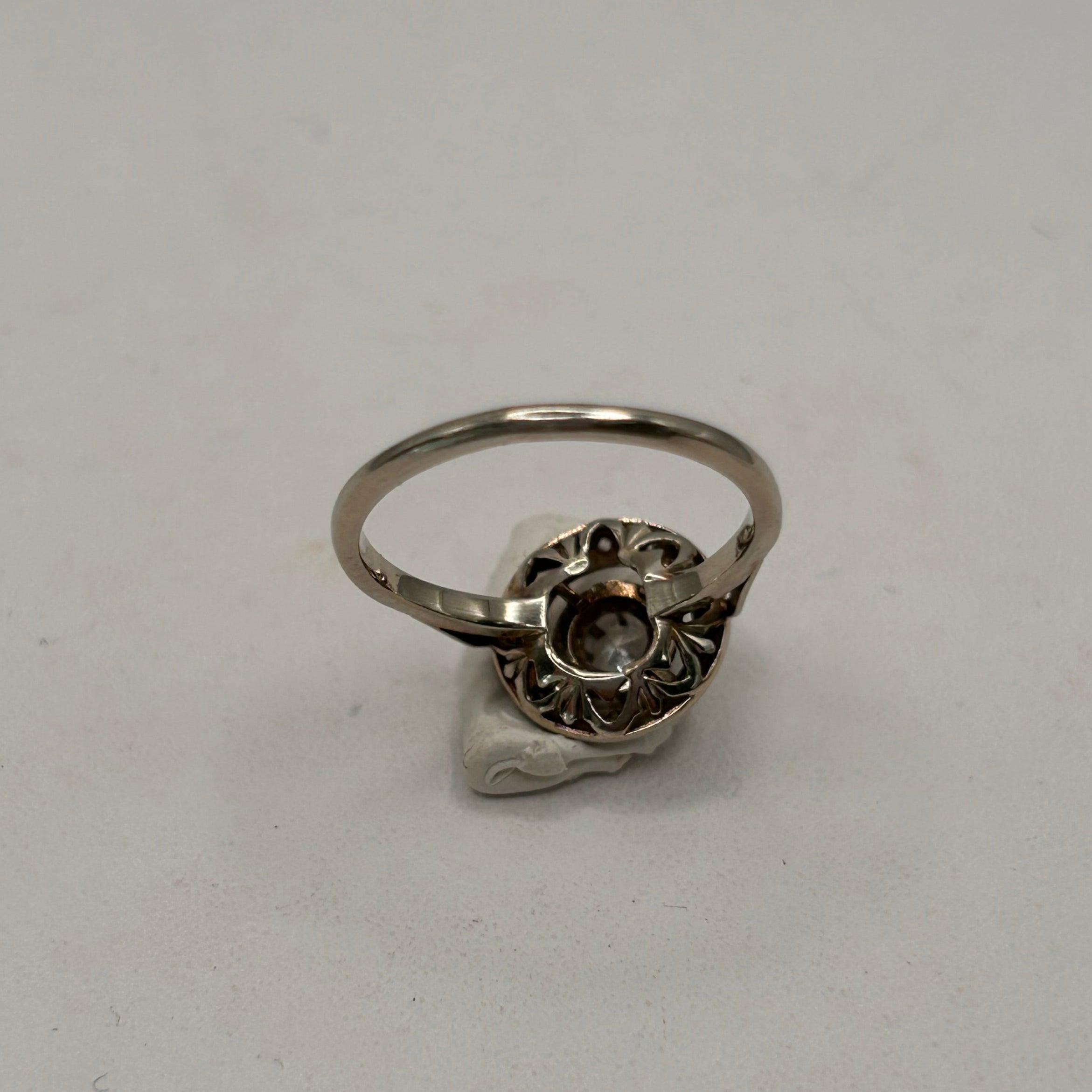 Bague ancienne en or blanc 18 carats (750/1000), sans poinçon visible, d’un poids de 2,30 grammes. Elle est ornée d’un diamant central de 0,09 carats, entouré de petites roses de diamants. Taille 49. À noter : la bague présente des traces d’usure importantes, avec un dessous accidenté.