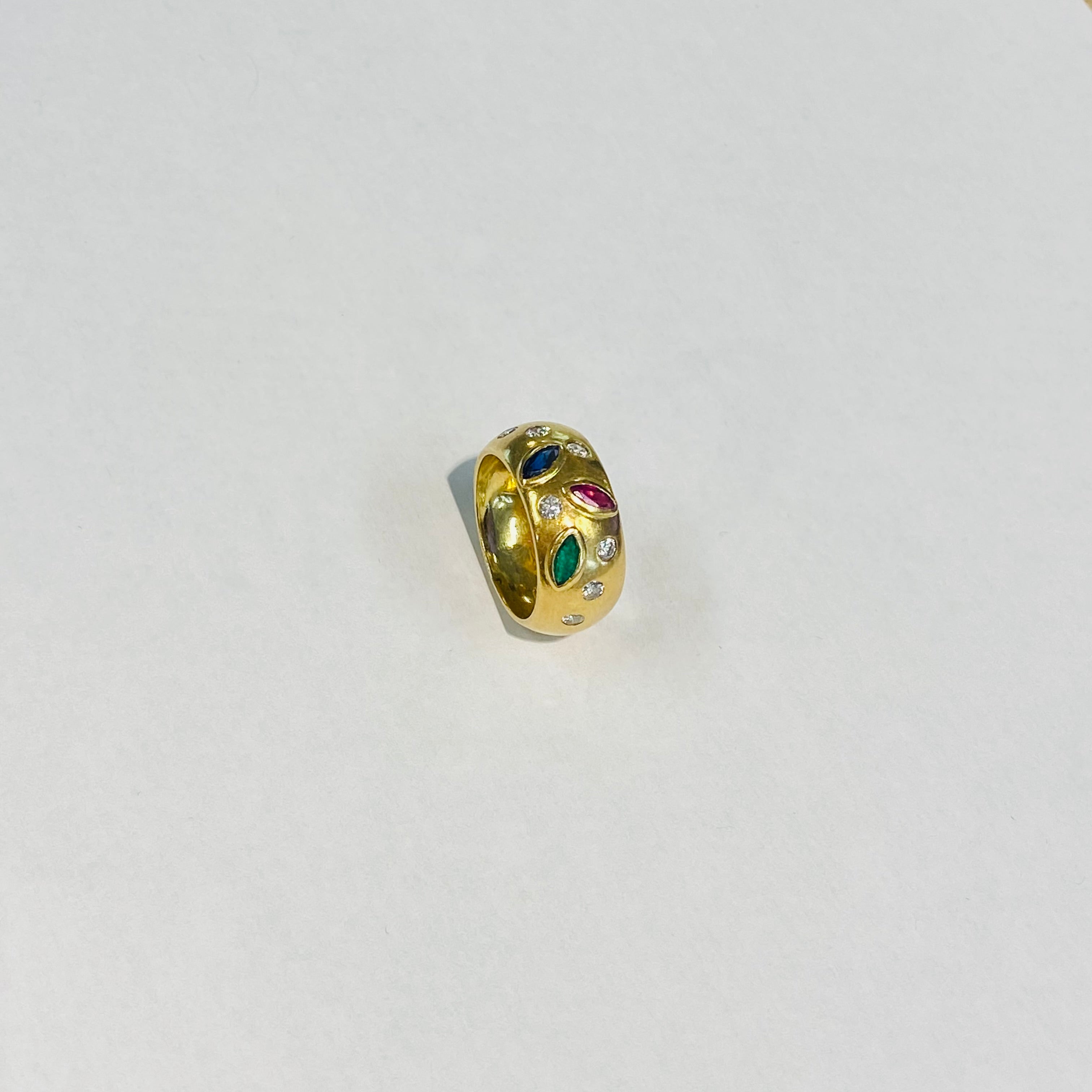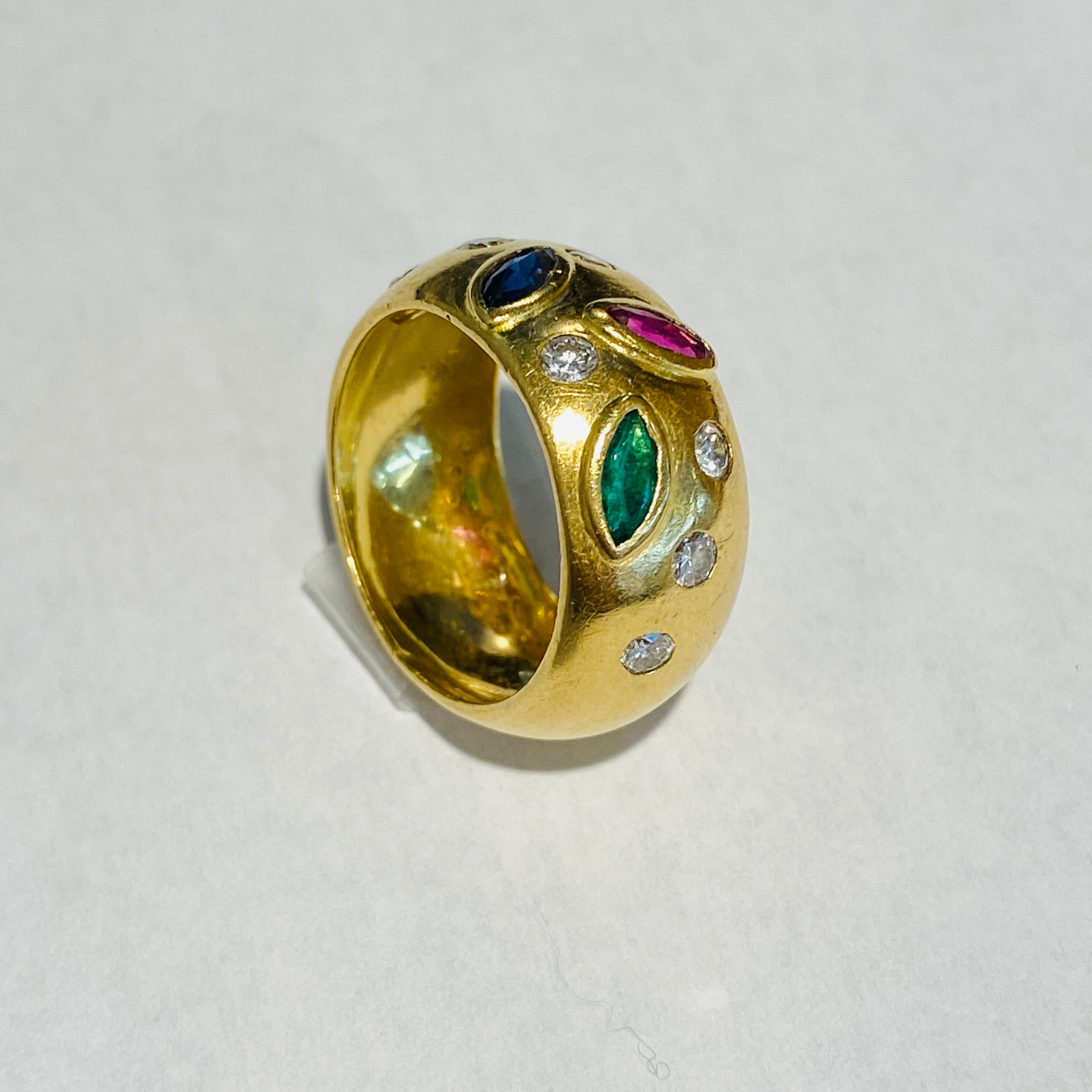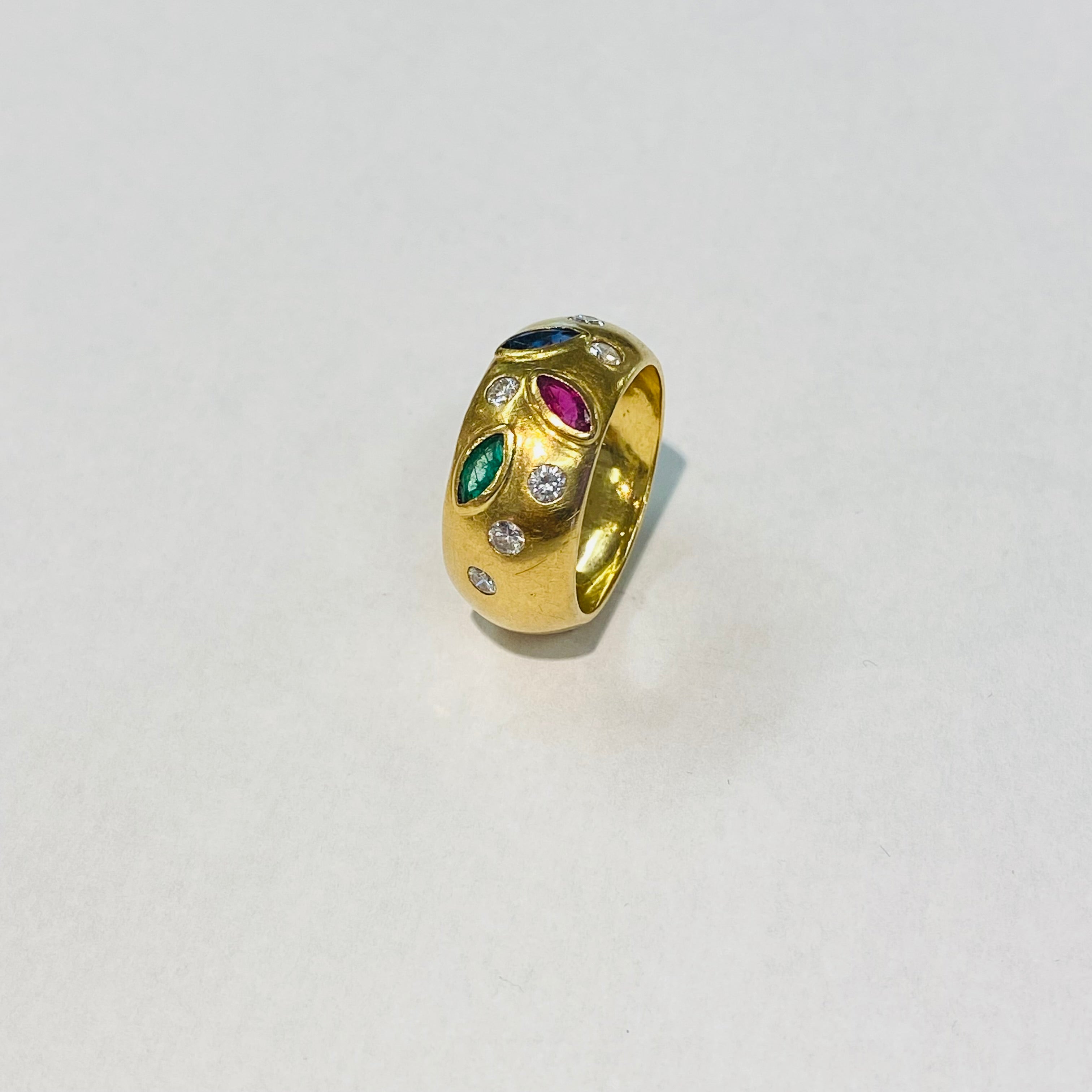 Bague empierrée en or jaune 18 carats (750/1000), poinçonnée maître. Poids : 7,20 g. Taille : 52. Sertie de sept oxydes de zirconium (chacun ~0,05 ct) et de trois autres pierres incrustées. État : bon.