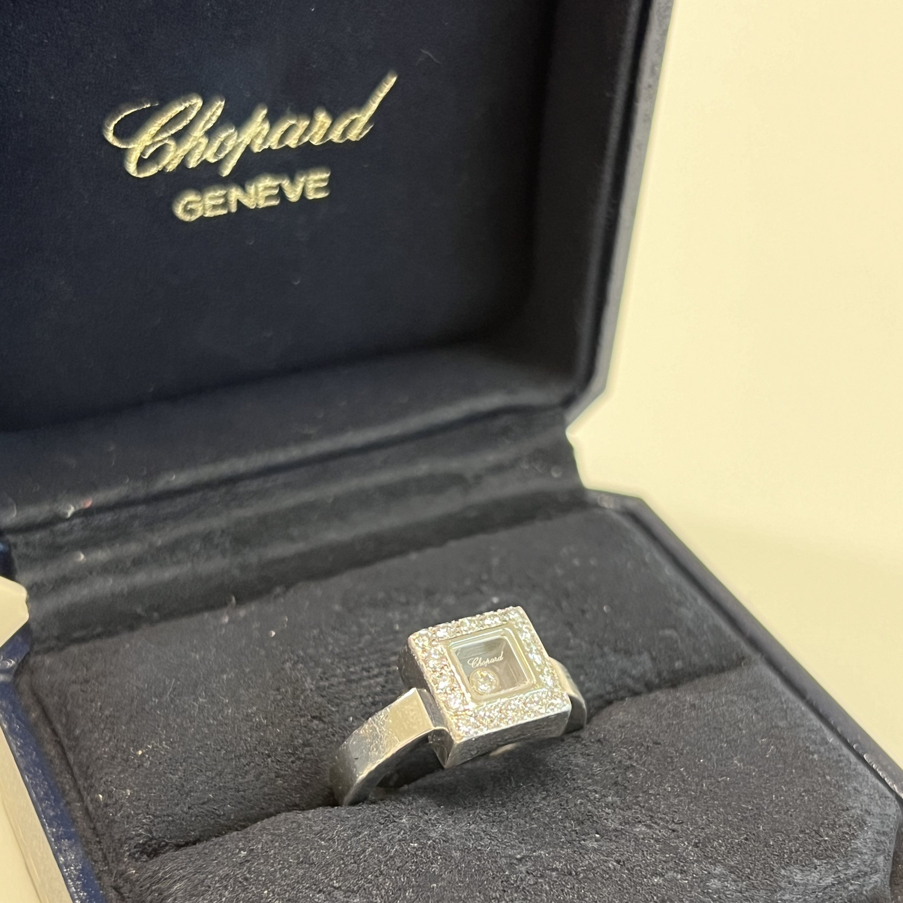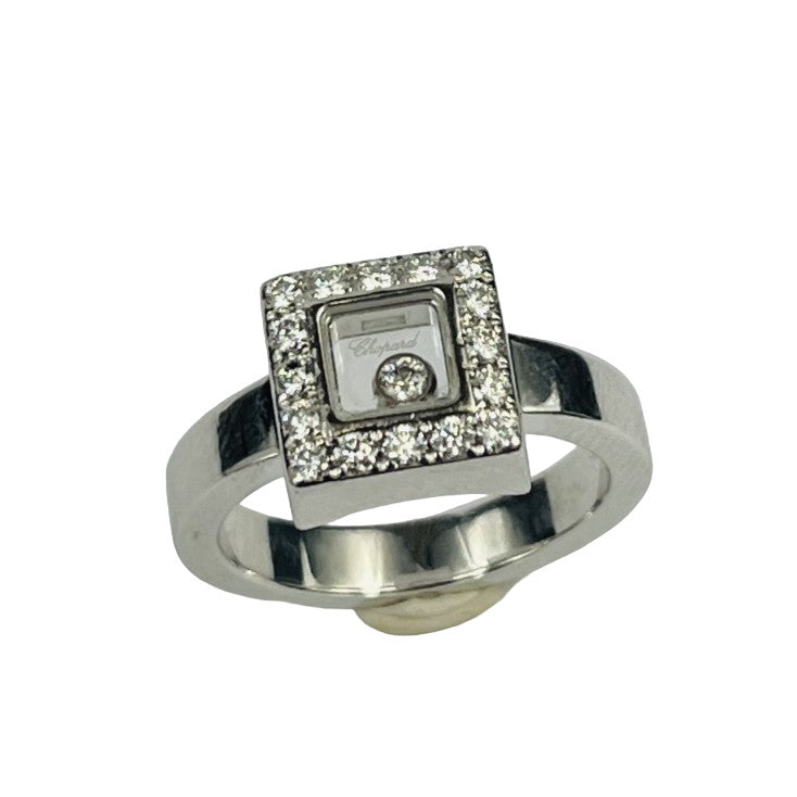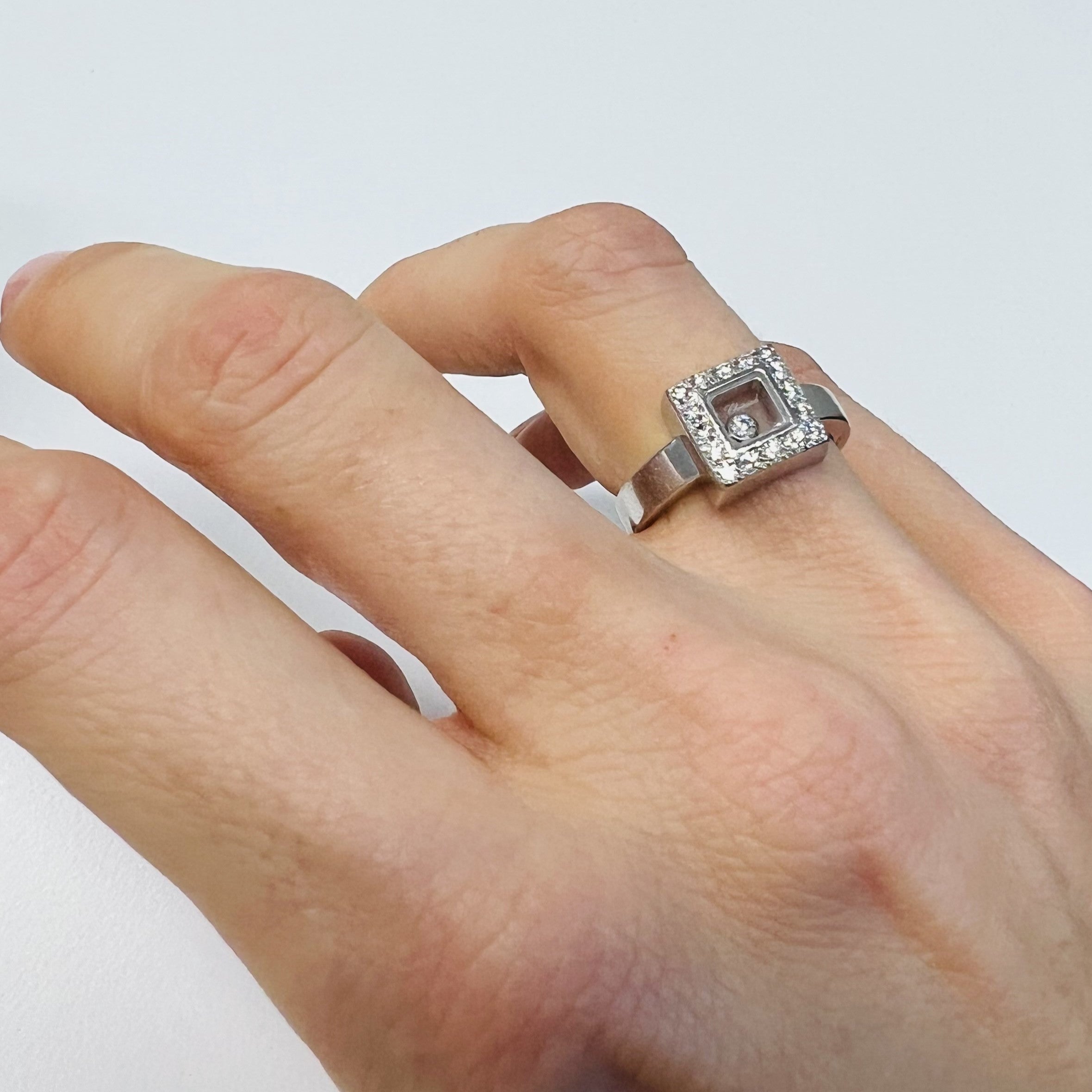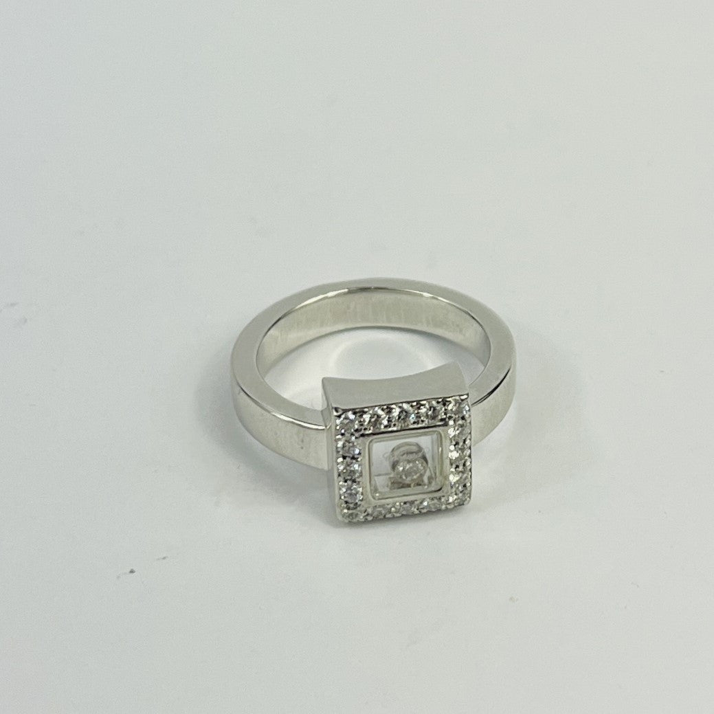 Belle bague bague Chopard Happy Diamond or blanc 750/1000 ornée d'un diamant mobile 0.48ct et 16 diamants 0.02ct