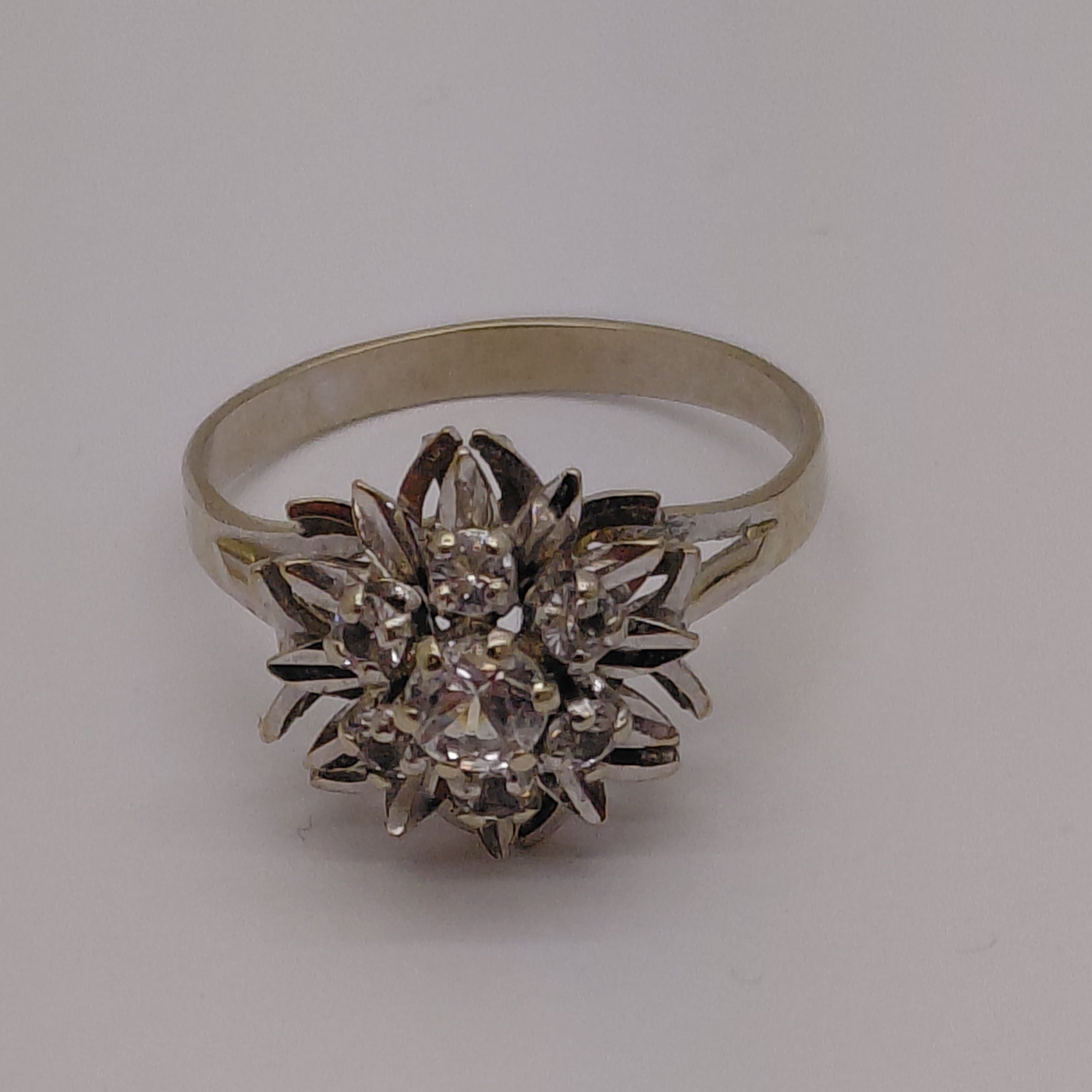 Bague type chou en or blanc 18 carats (750/1000), poinçonnée à l’étranger. Elle est sertie d’oxydes de zirconium et pèse 3,49 grammes. Taille 56. État : bon.