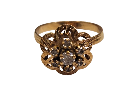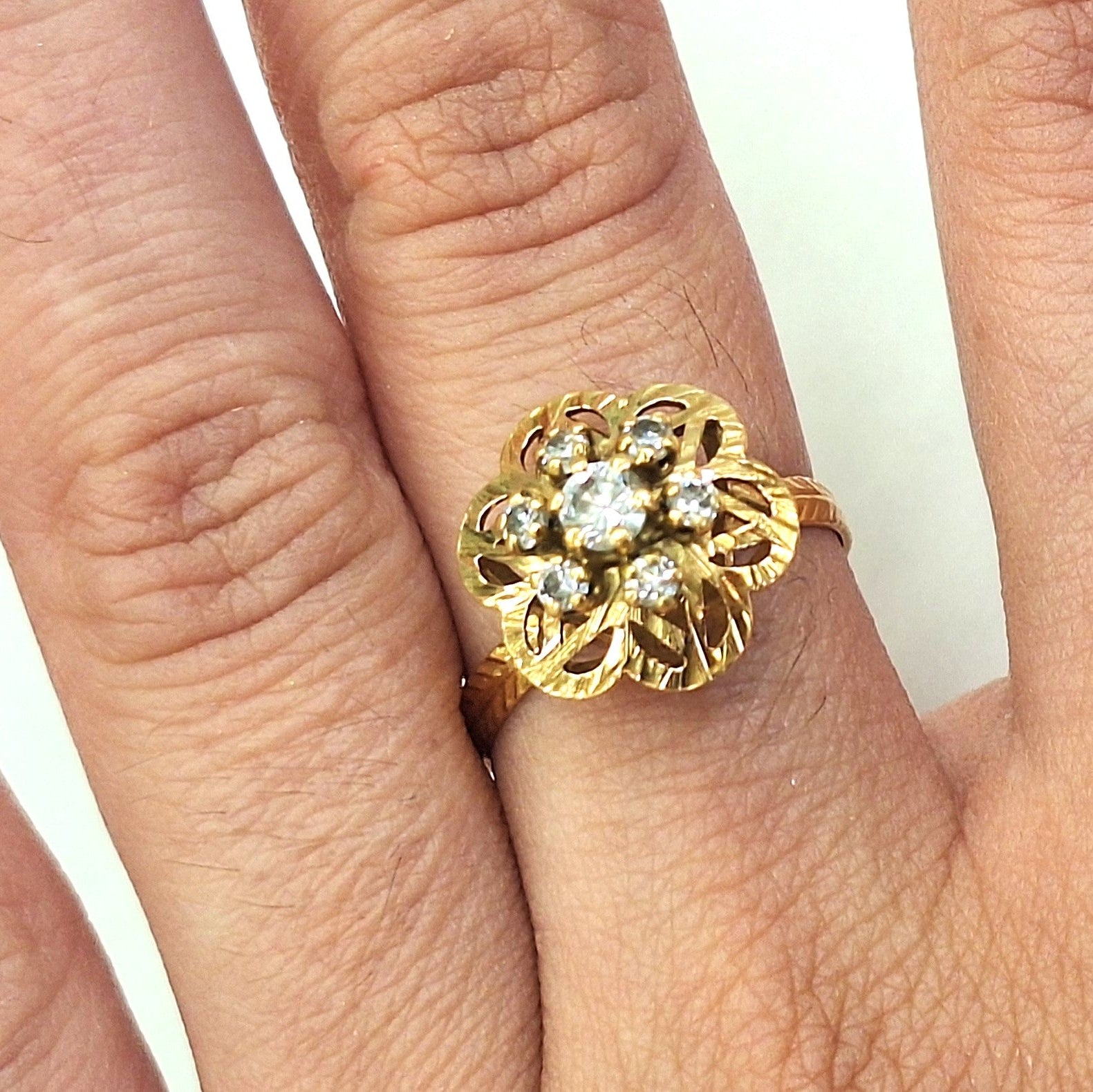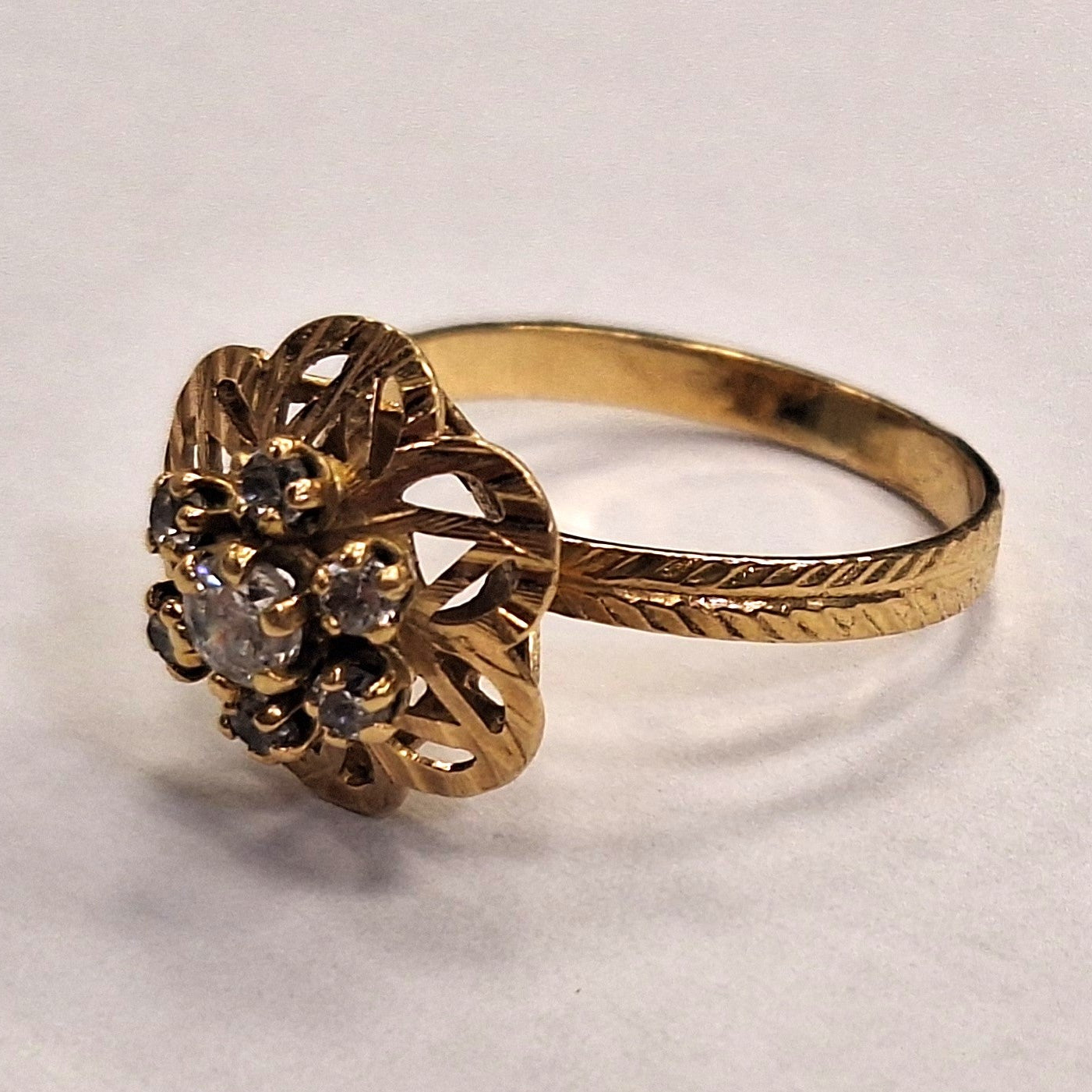 Bague de type chou est en or jaune 18 carats (750/1000) et porte le poinçon tête d’aigle. Elle est sertie de six oxydes de zirconium, pèse 2,99 grammes et correspond à une taille 52. L’ensemble est en très bon état.
