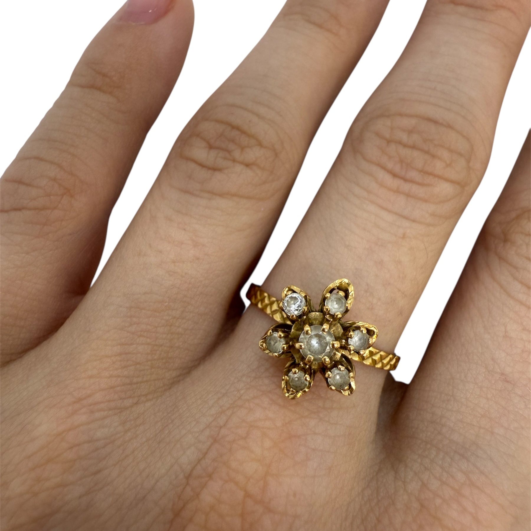 Bague chou en or jaune 18 carats (750/1000), sans poinçon, sertie de 7 oxydes de zirconium de 0,02 carat chacun. Taille 59, poids total de 2,50 grammes. Présentée en très bon état.