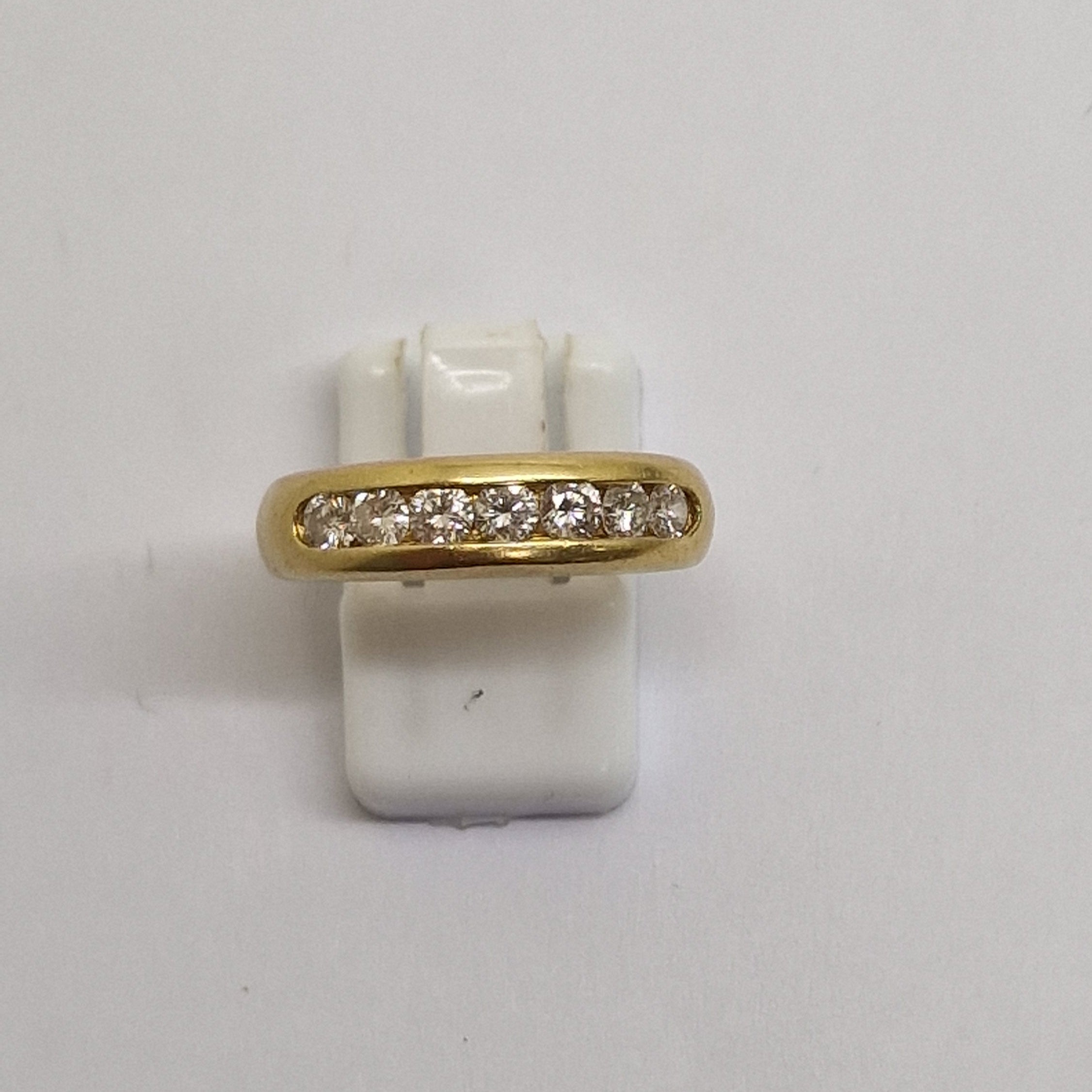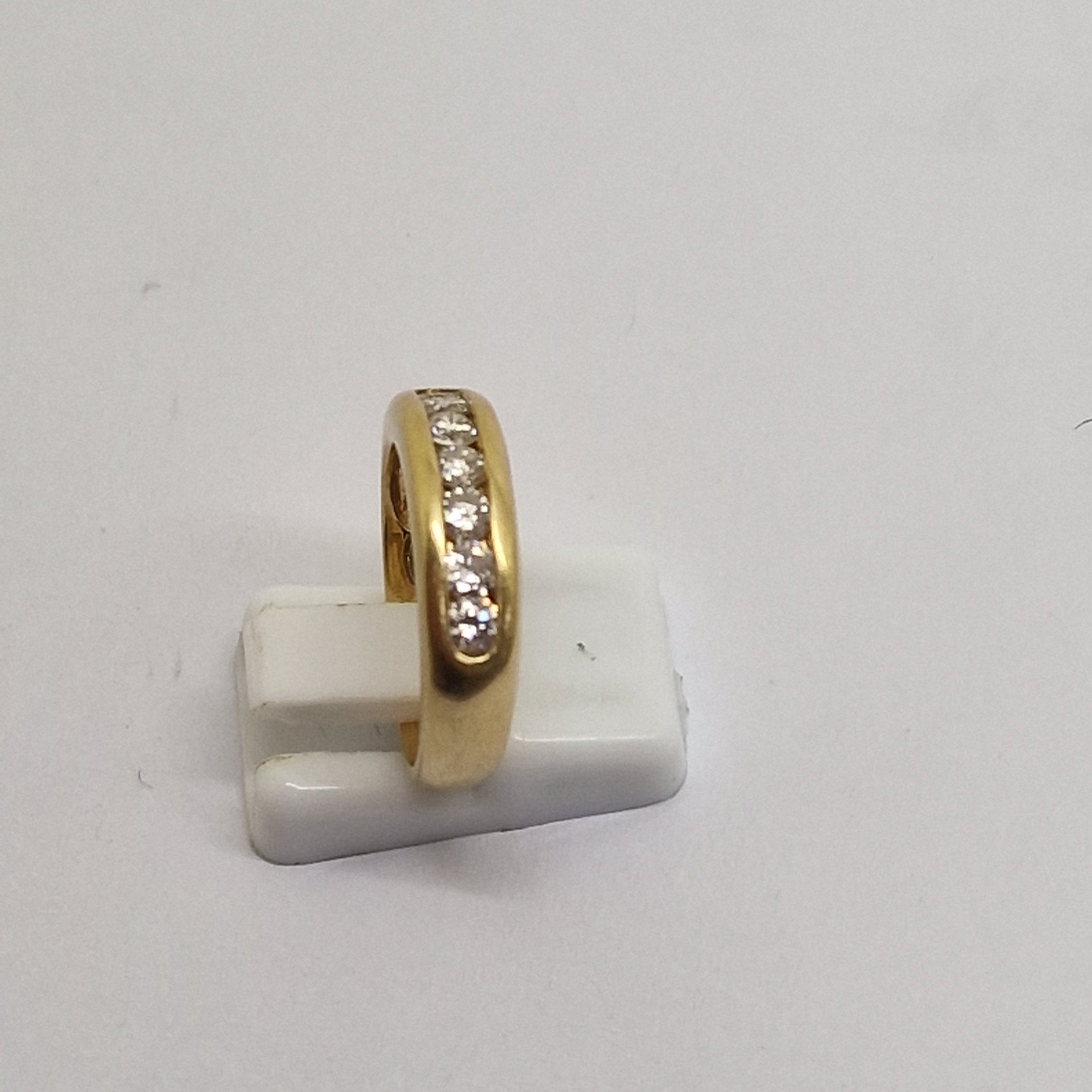 Bague demi-tour en or jaune 18 carats (750/1000) pèse 5.43 grammes et est de taille 54. Elle est sertie de 7 diamants de taille moyenne et porte les poinçons 750 et Tête d'Aigle. En très bon état, elle combine élégance et raffinement.