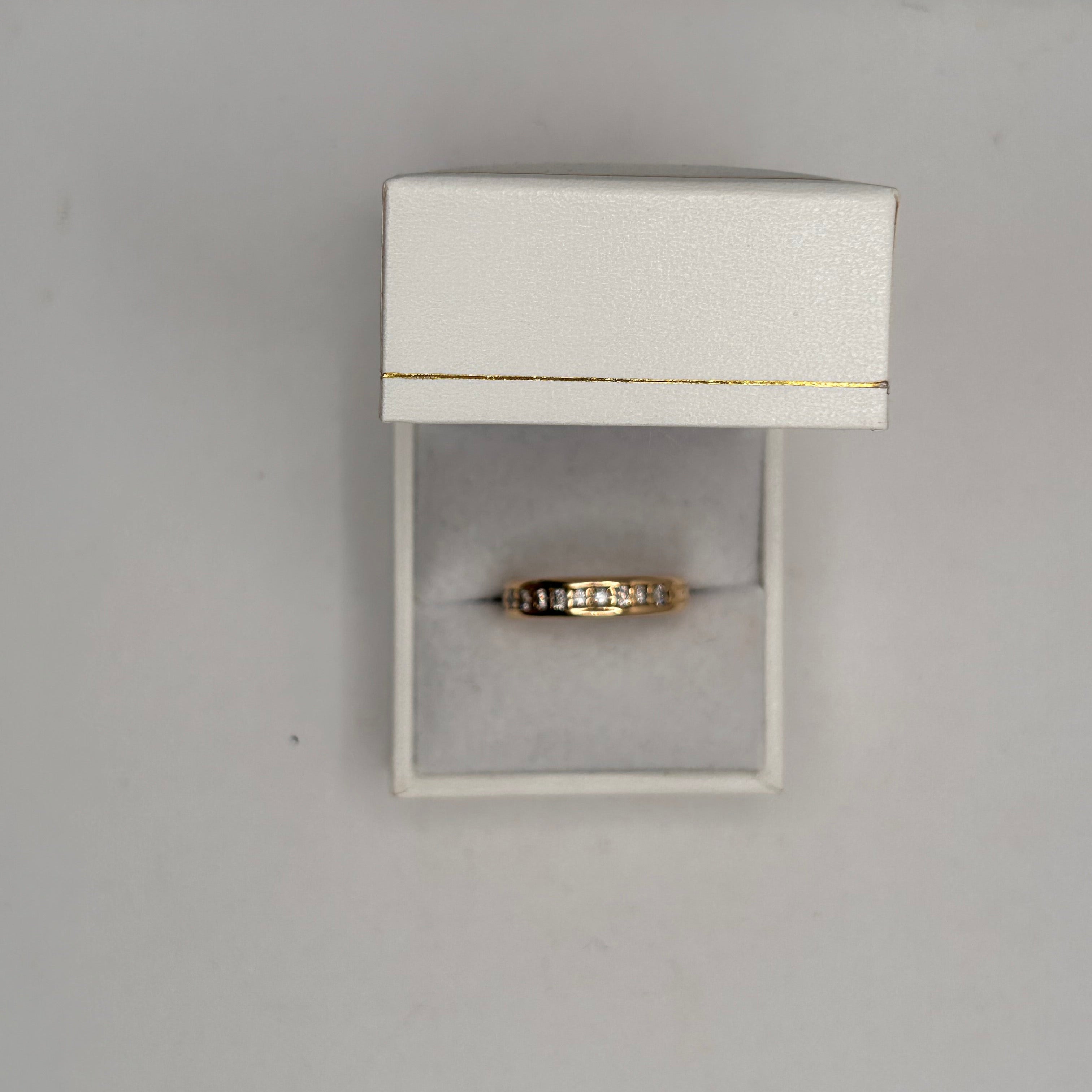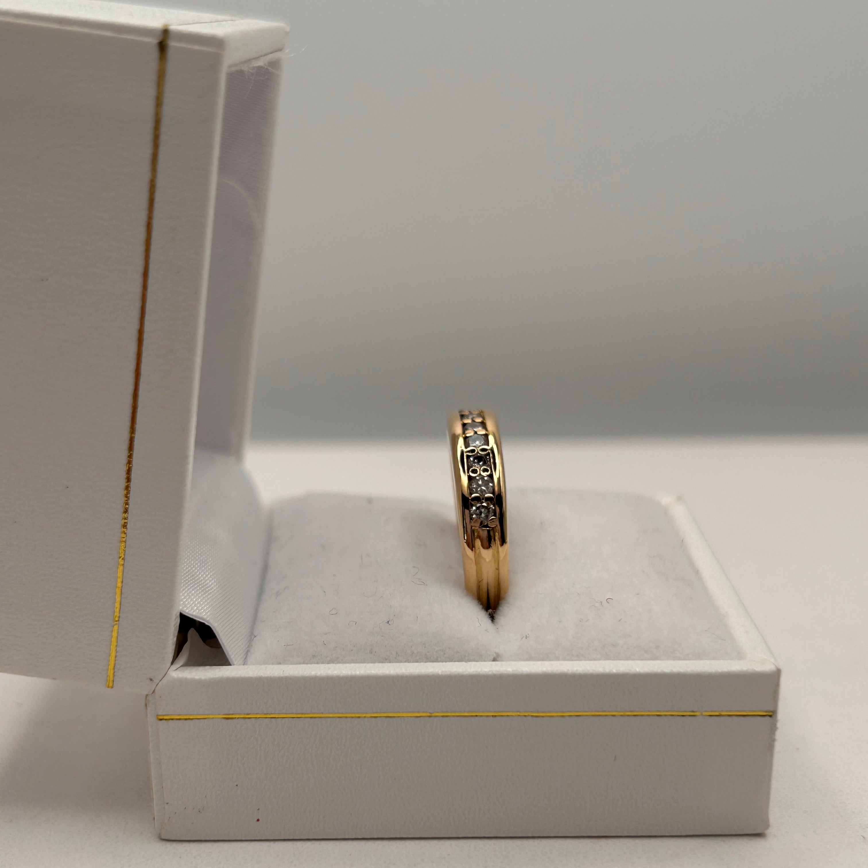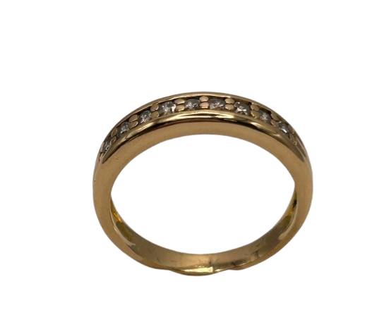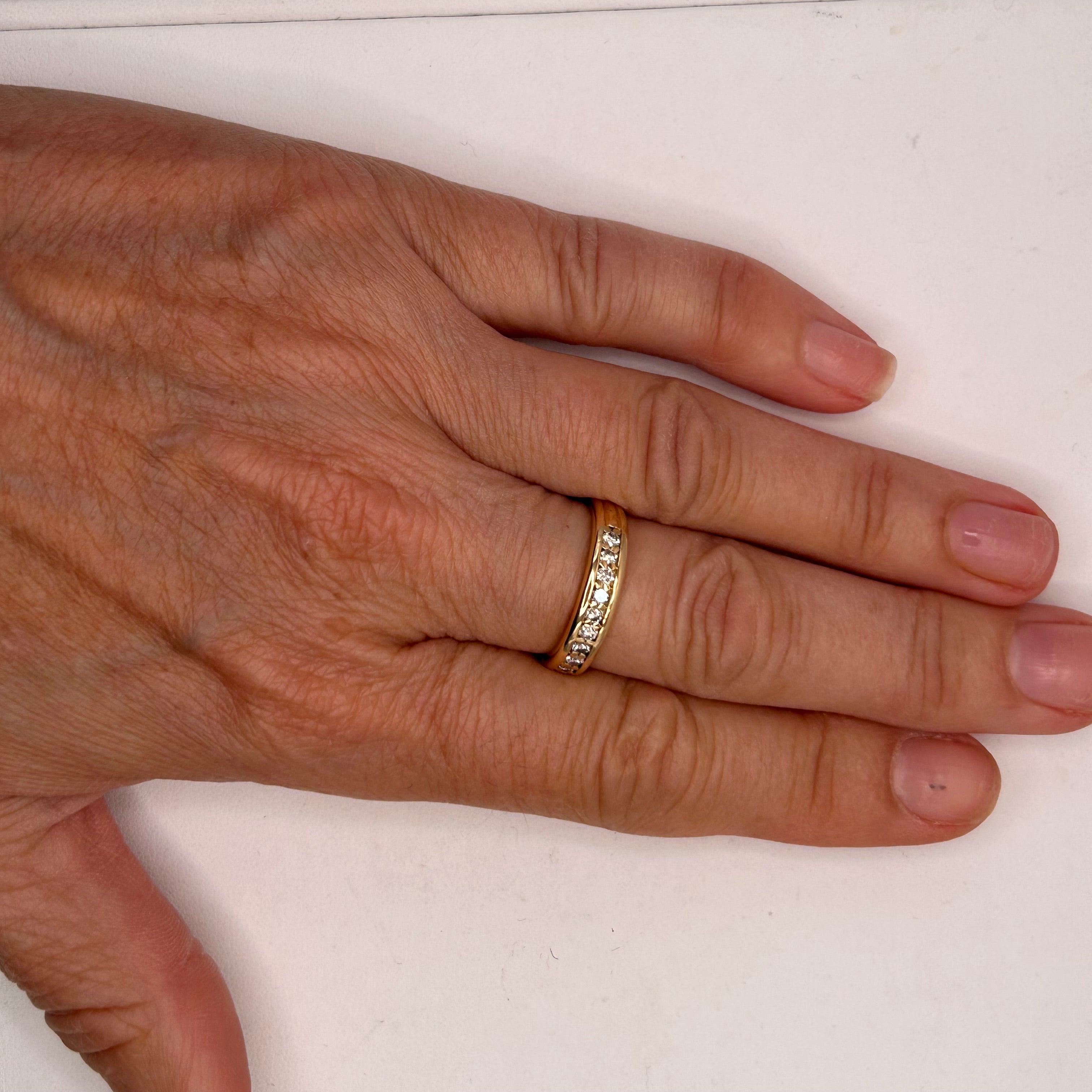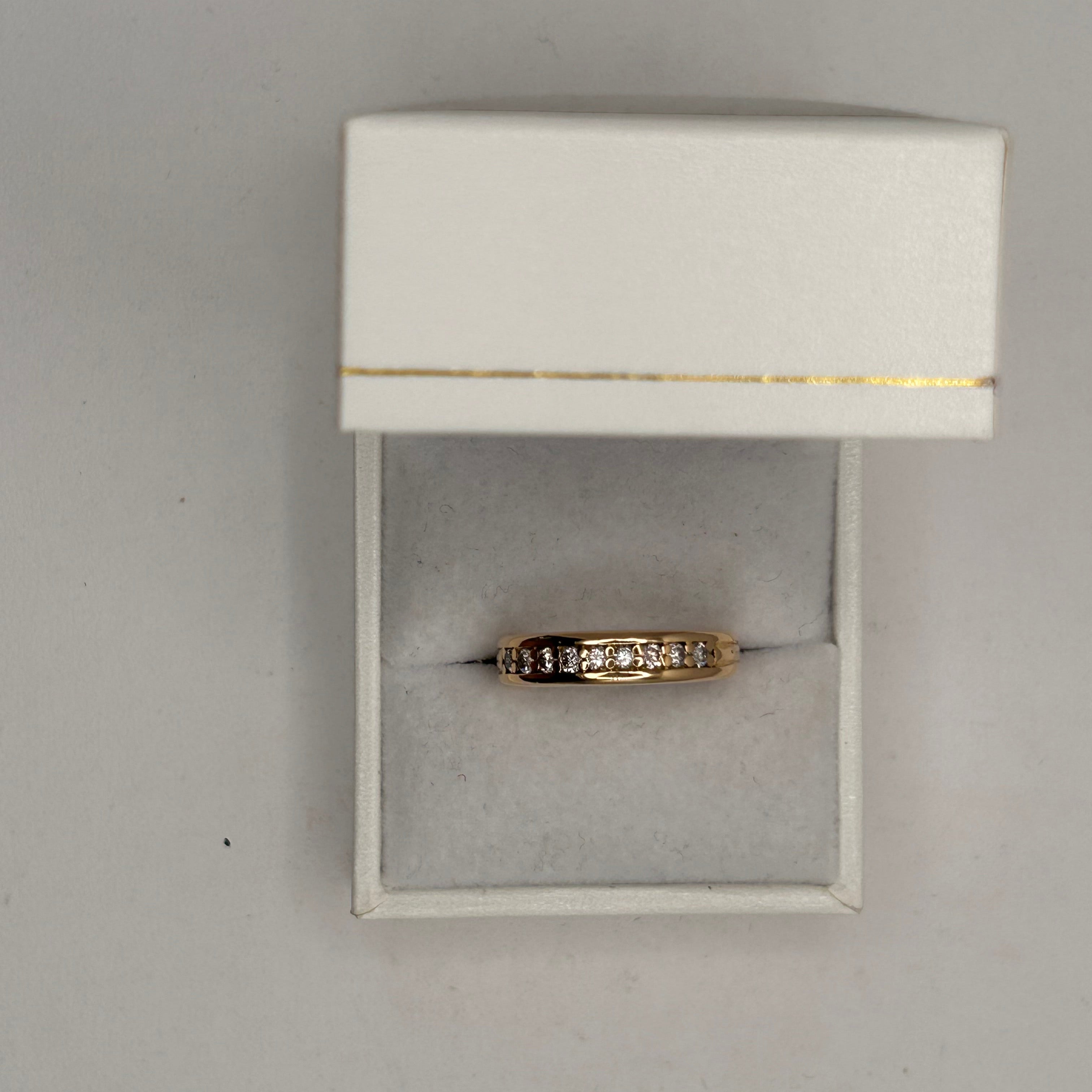 Bague demi-tour en or jaune 18 carats, sertie de 9 diamants brillants pour une touche d’éclat discret et raffiné. Avec son design classique et sa belle brillance, elle se porte aussi bien au quotidien que pour les grandes occasions. En très bon état, c’est un bijou élégant et intemporel.