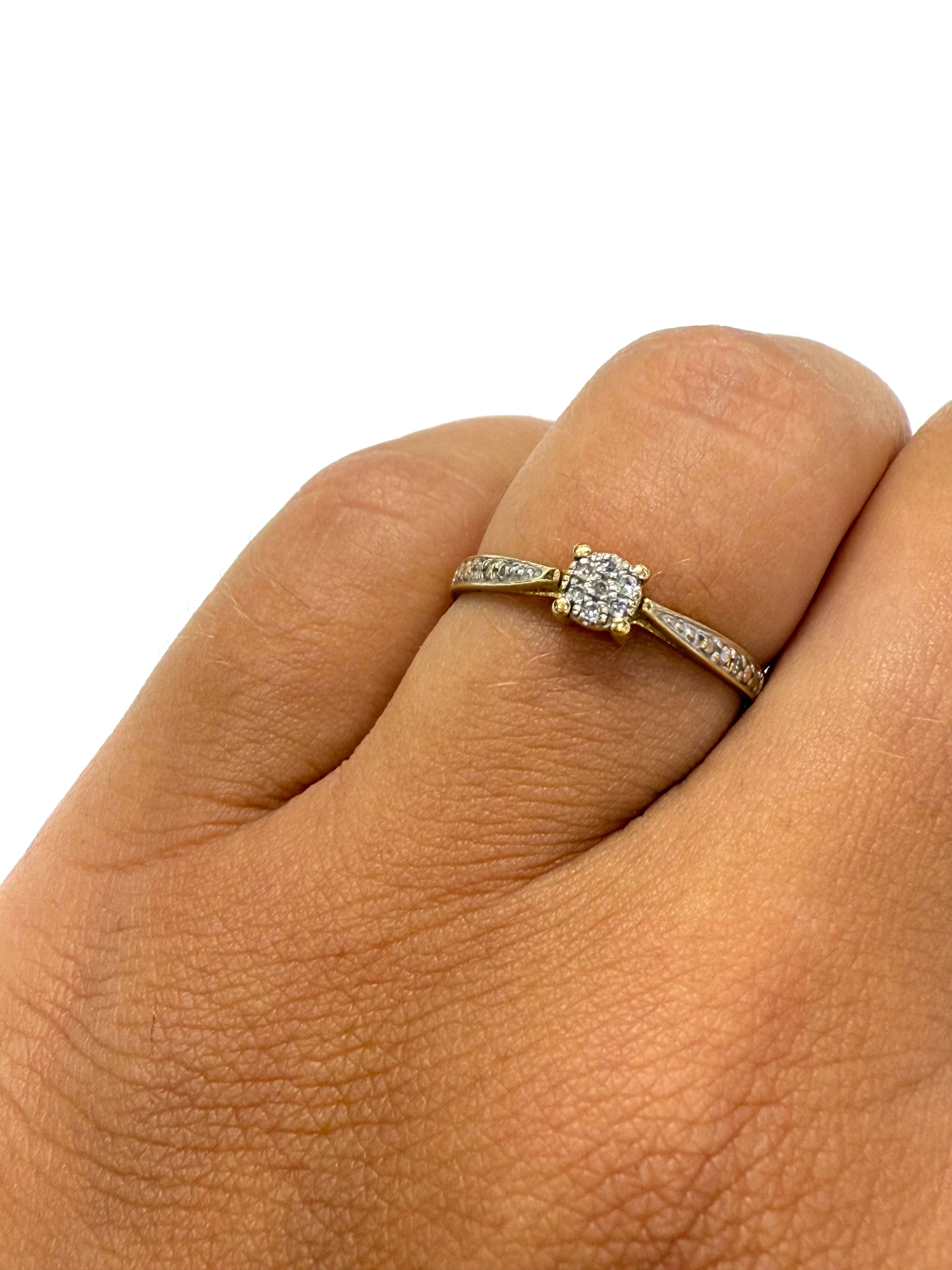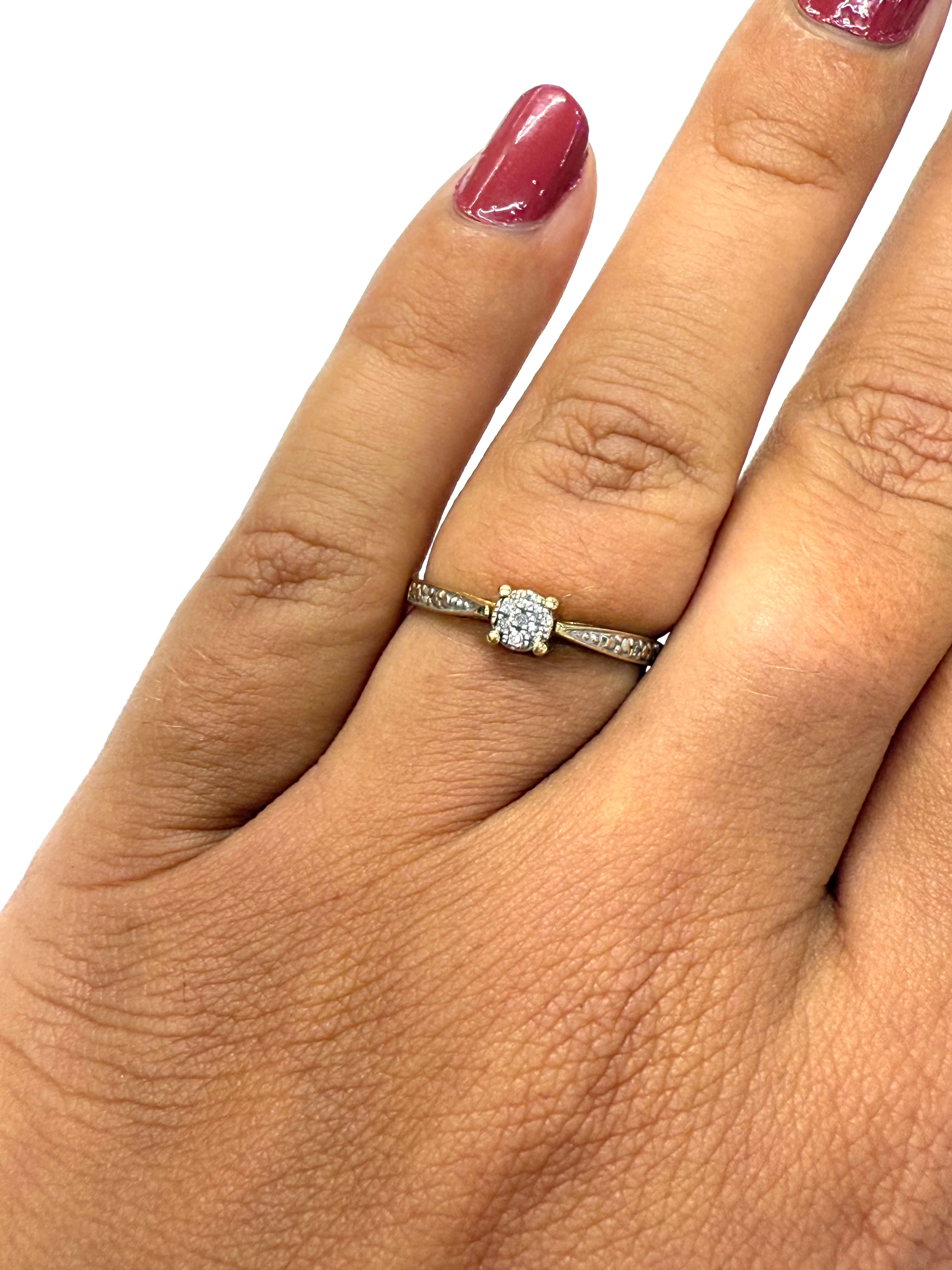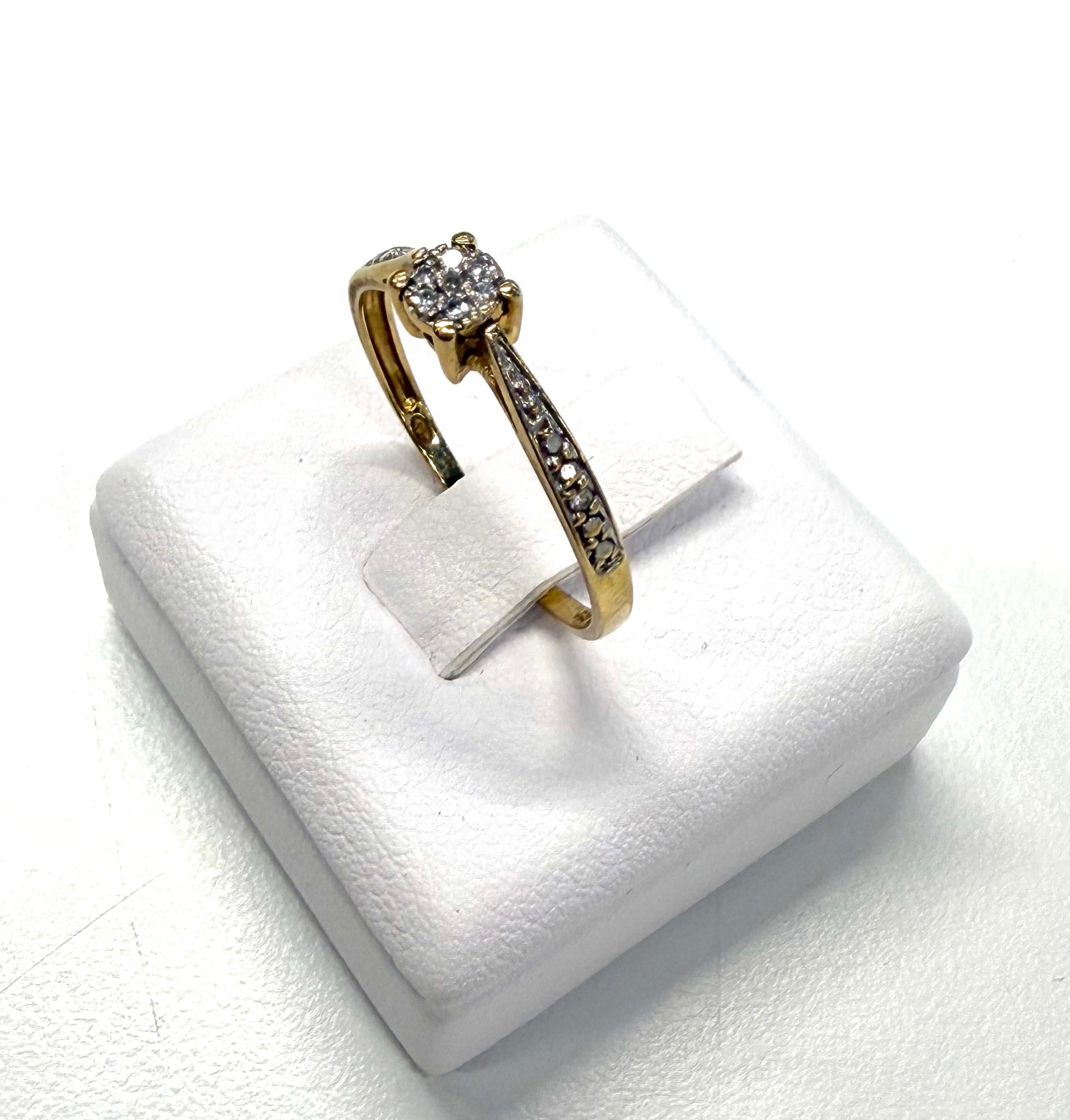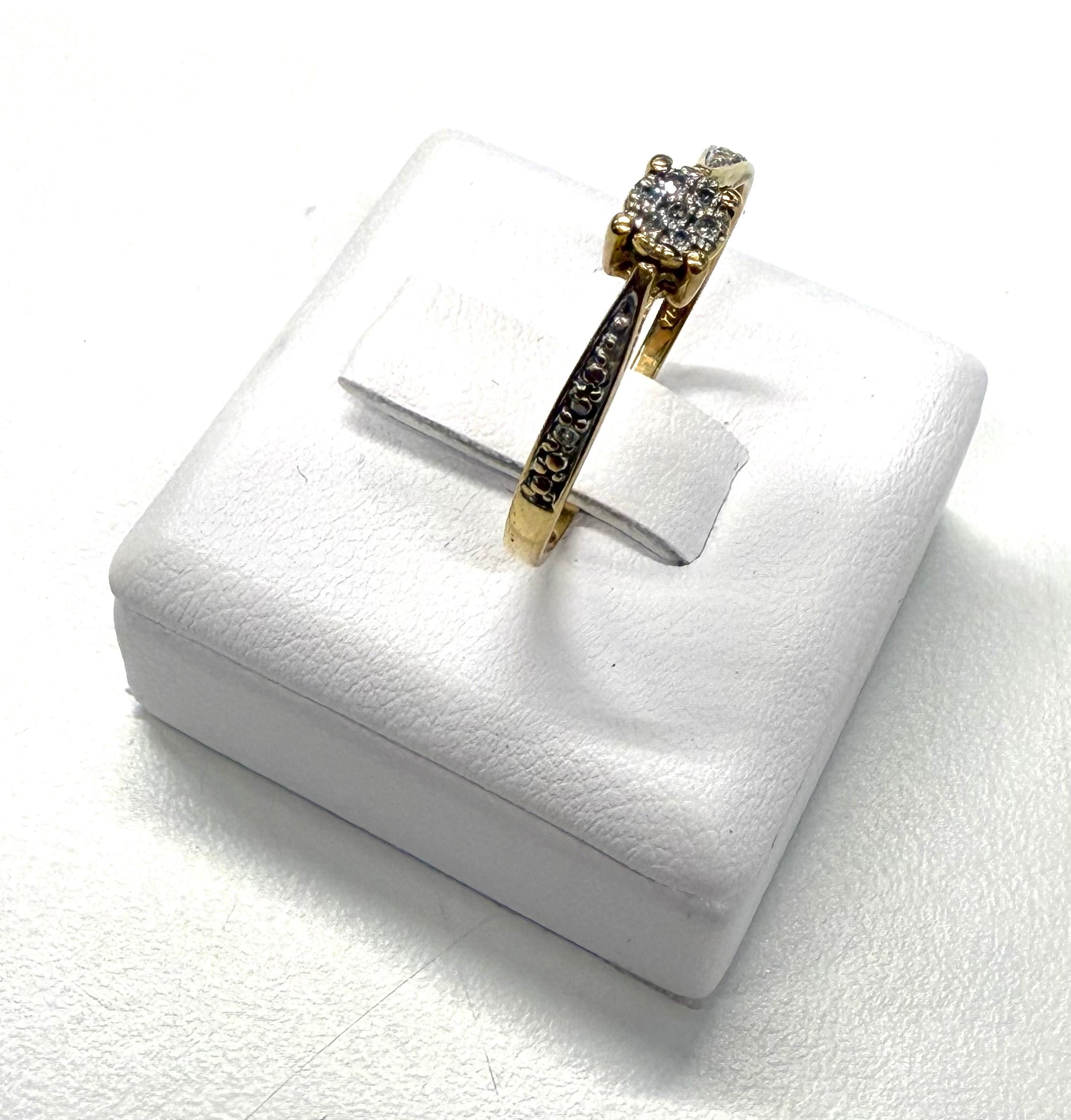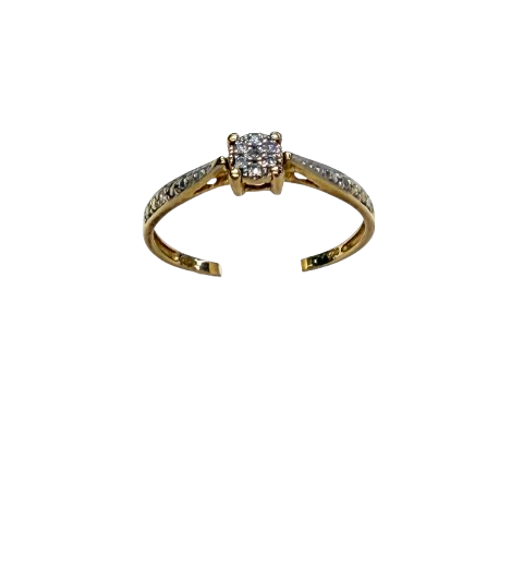 Bague empierrée en or jaune 18 carats (750/1000), poinçonnée 750, est en très bon état. Elle est sublimée par un pavage de diamants qui lui confère éclat et raffinement. D’un poids de 1,34 gramme et proposée en taille 54, elle séduit par son design délicat et sa brillance discrète.
