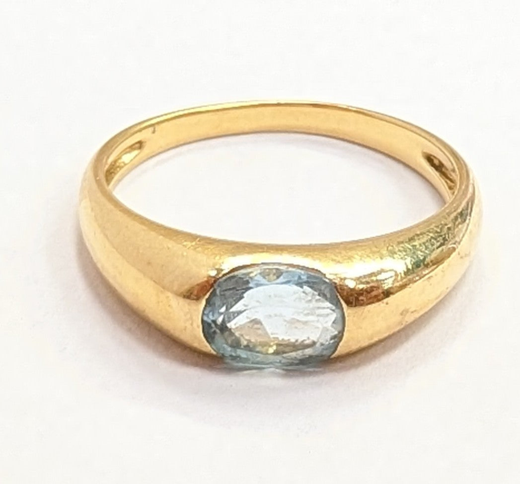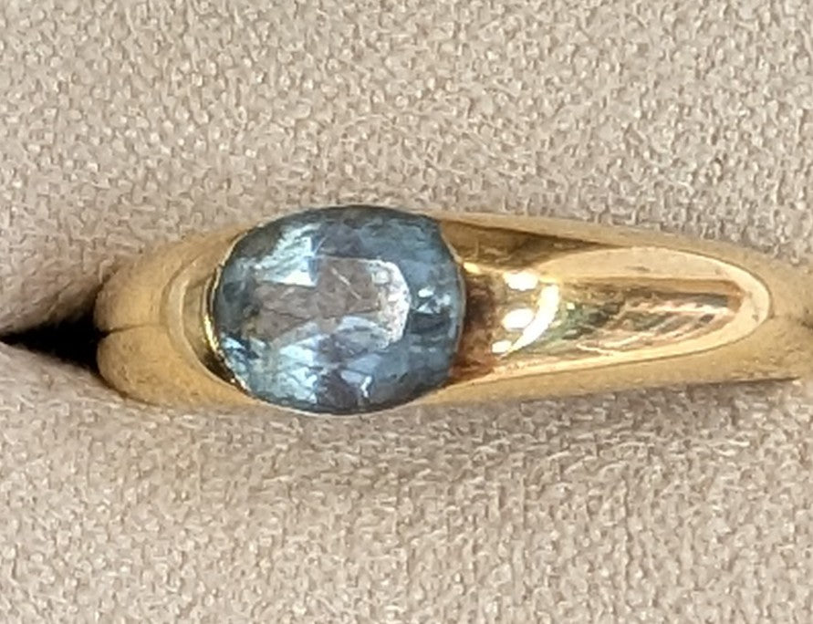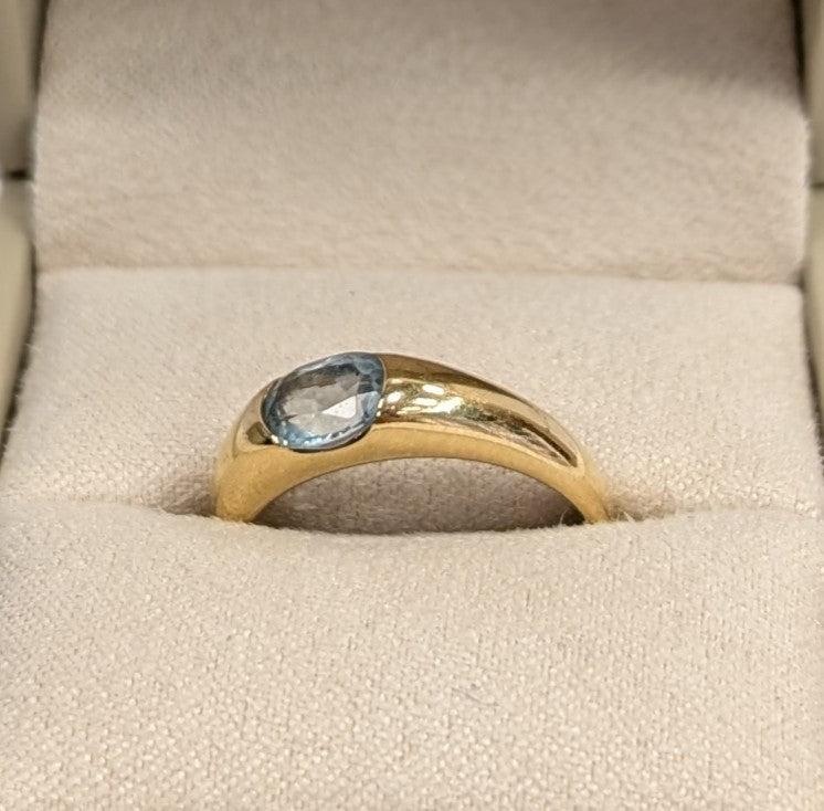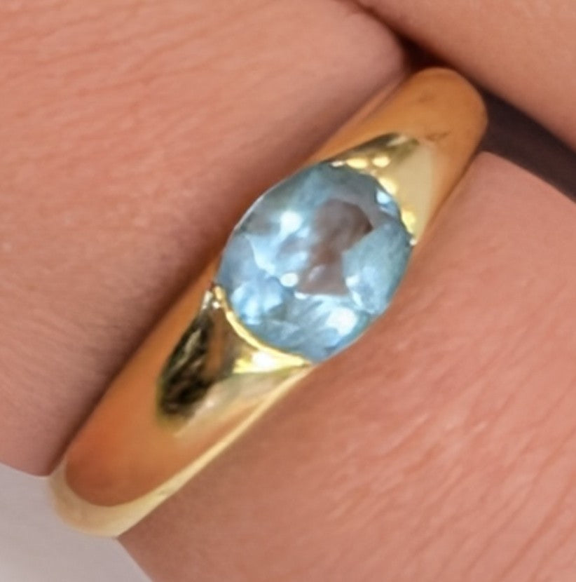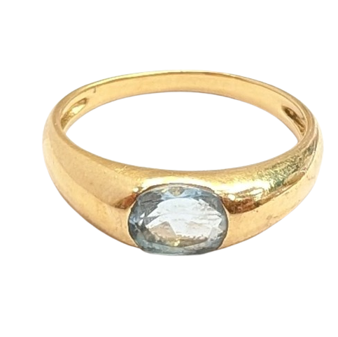 Bague empierrée en or jaune 18 carats (750/1000), poinçonnée tête d’aigle (et sans poinçon visible). Sertie d'une aigue-marine, elle affiche un poids de 2,37 g et une taille 52,5. En très bon état, elle offre une touche de couleur subtile et élégante.