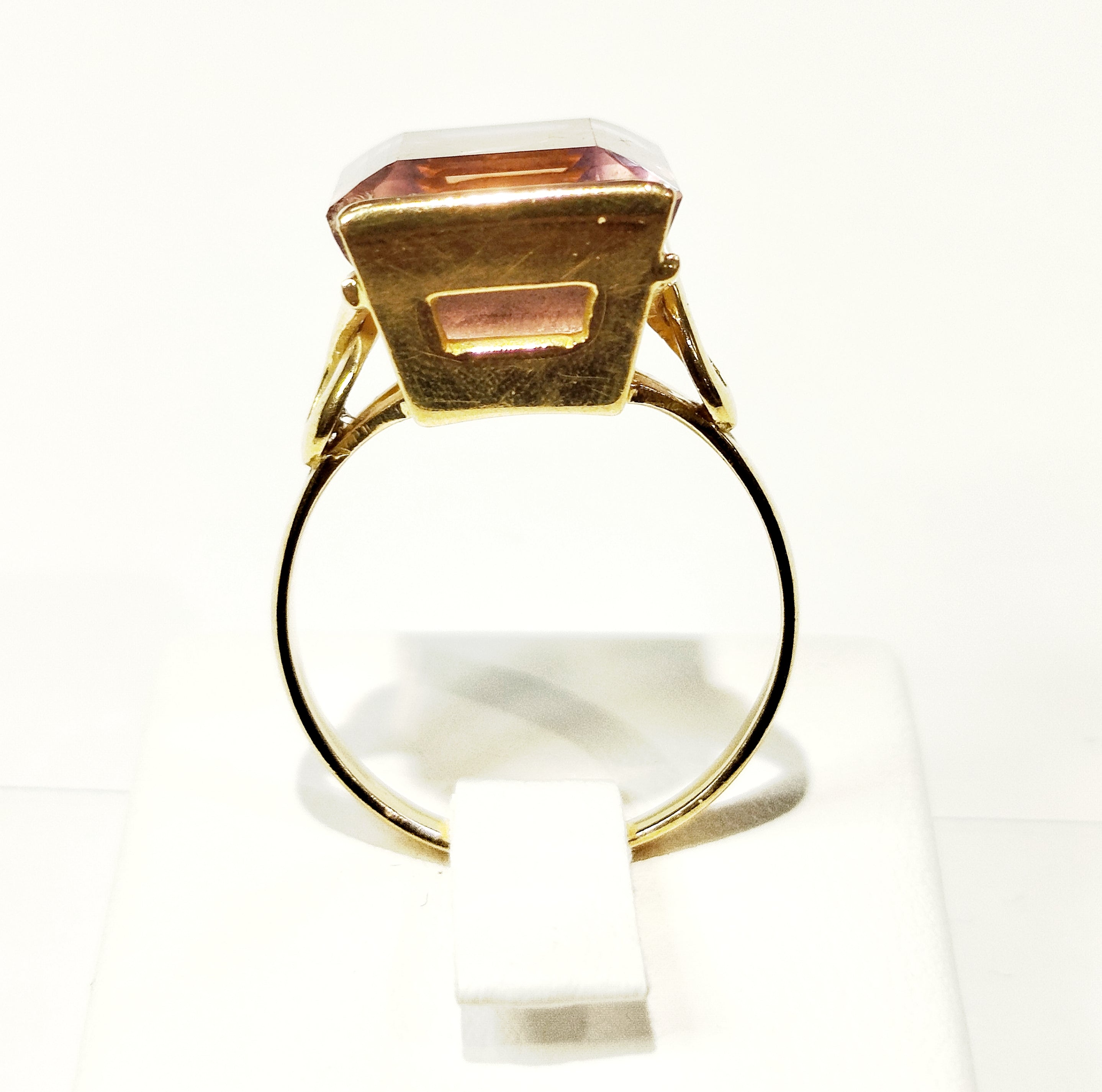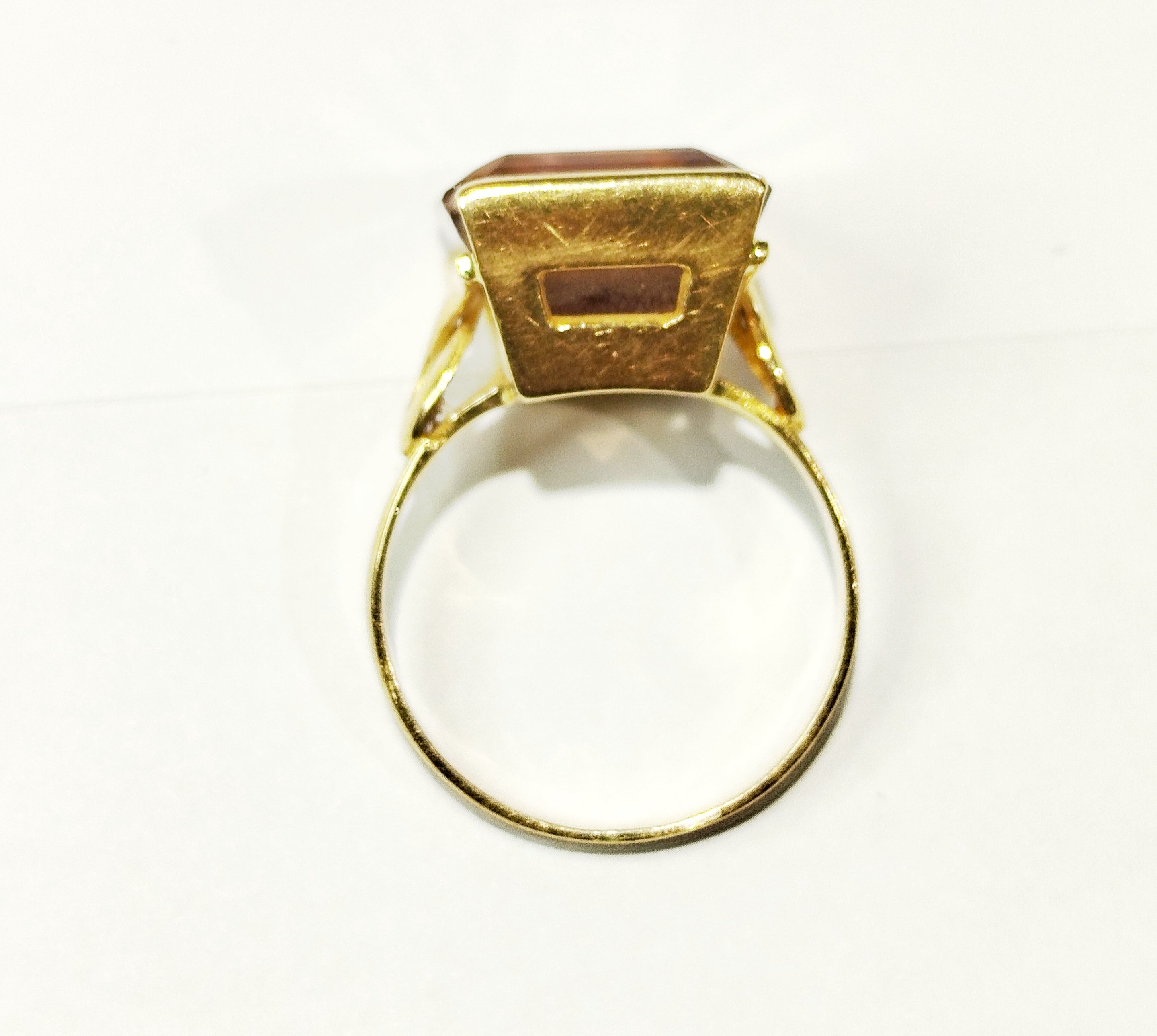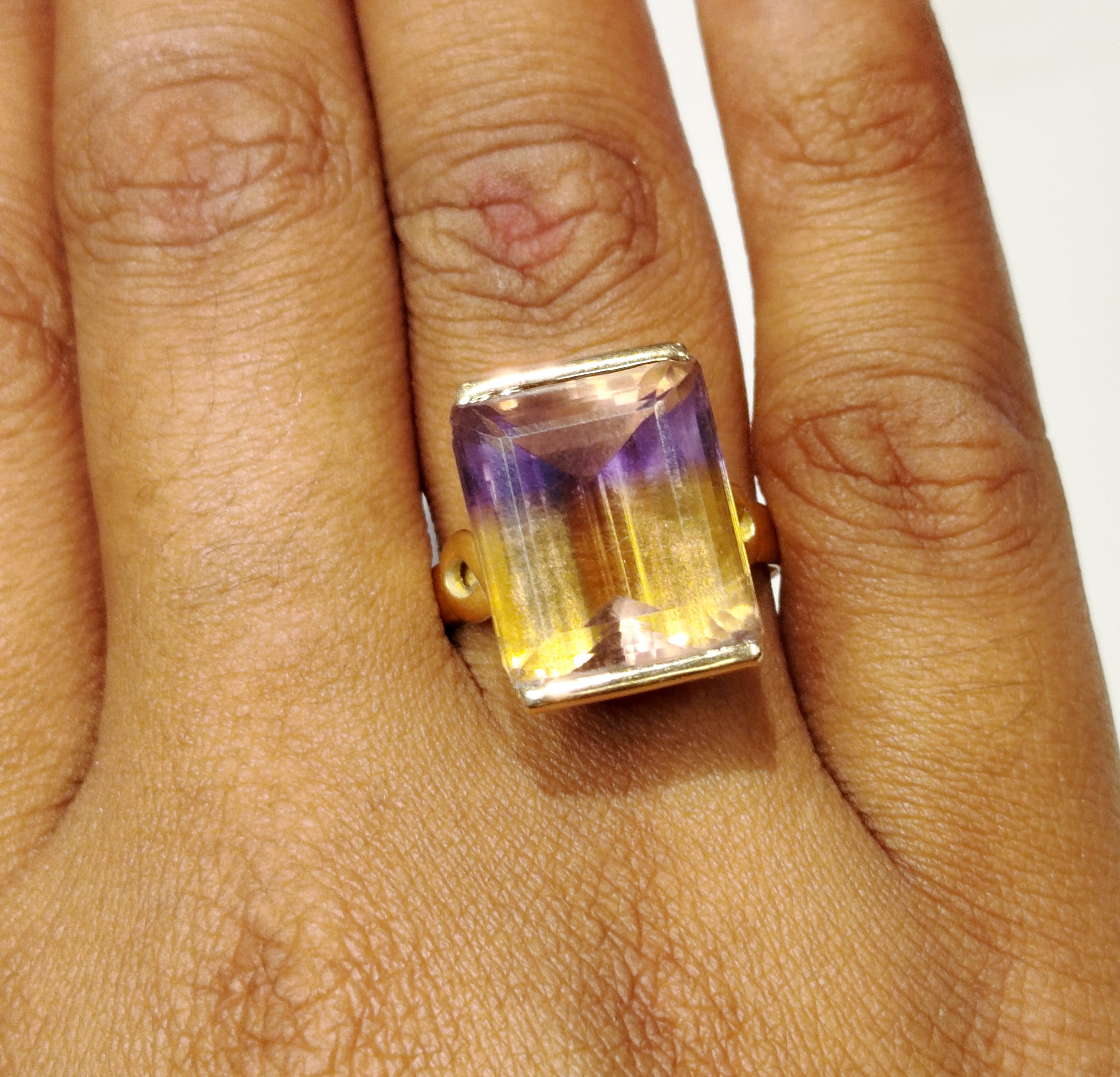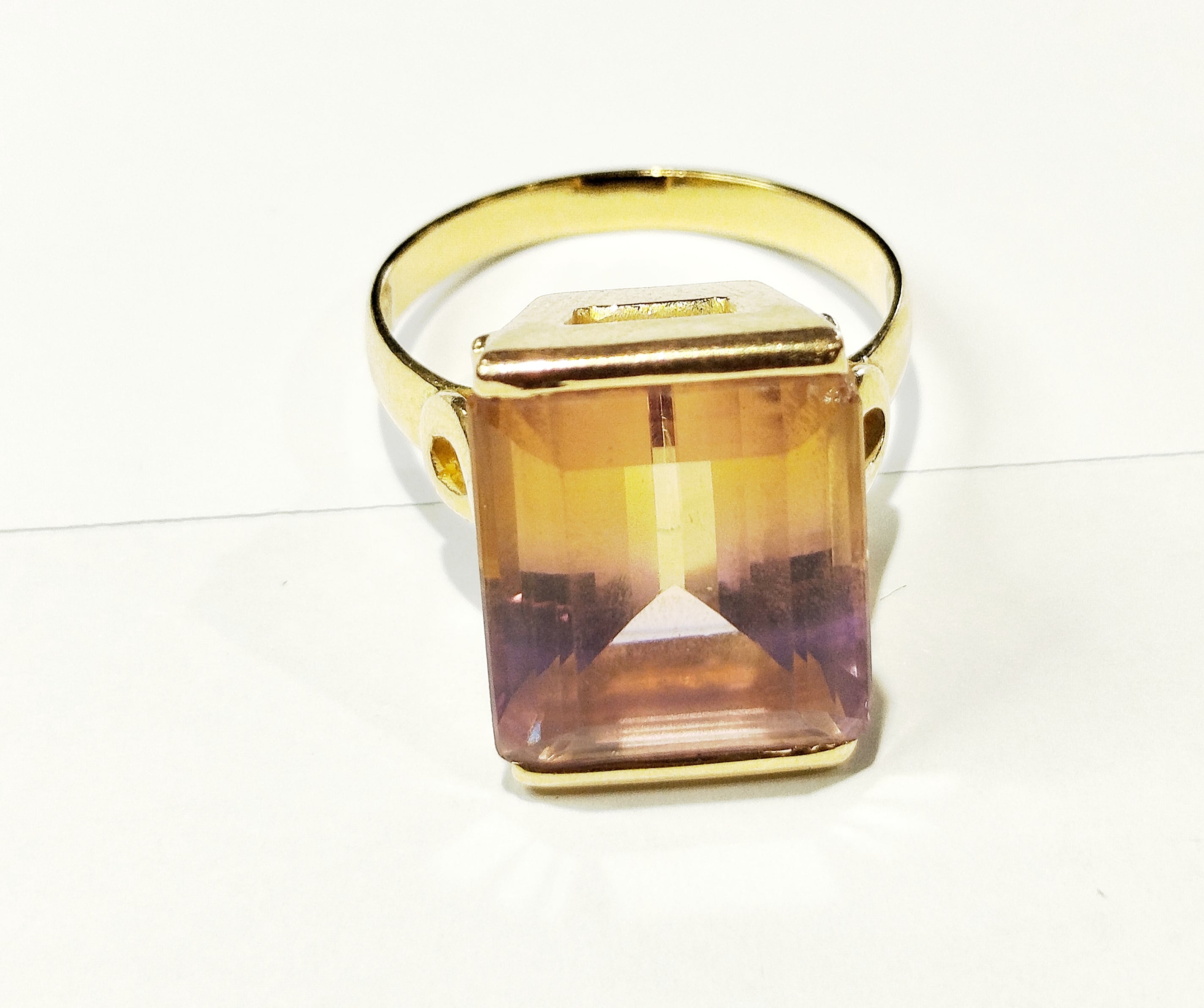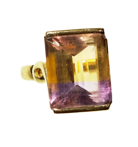 Bague empierrée en or jaune 750/1000 (18 carats), sans poinçon, d’un poids de 7,74 g et de taille 57. Elle est ornée de pierres fines : améthyste et citrine, qui lui apportent couleur et éclat. La bague est en très bon état.