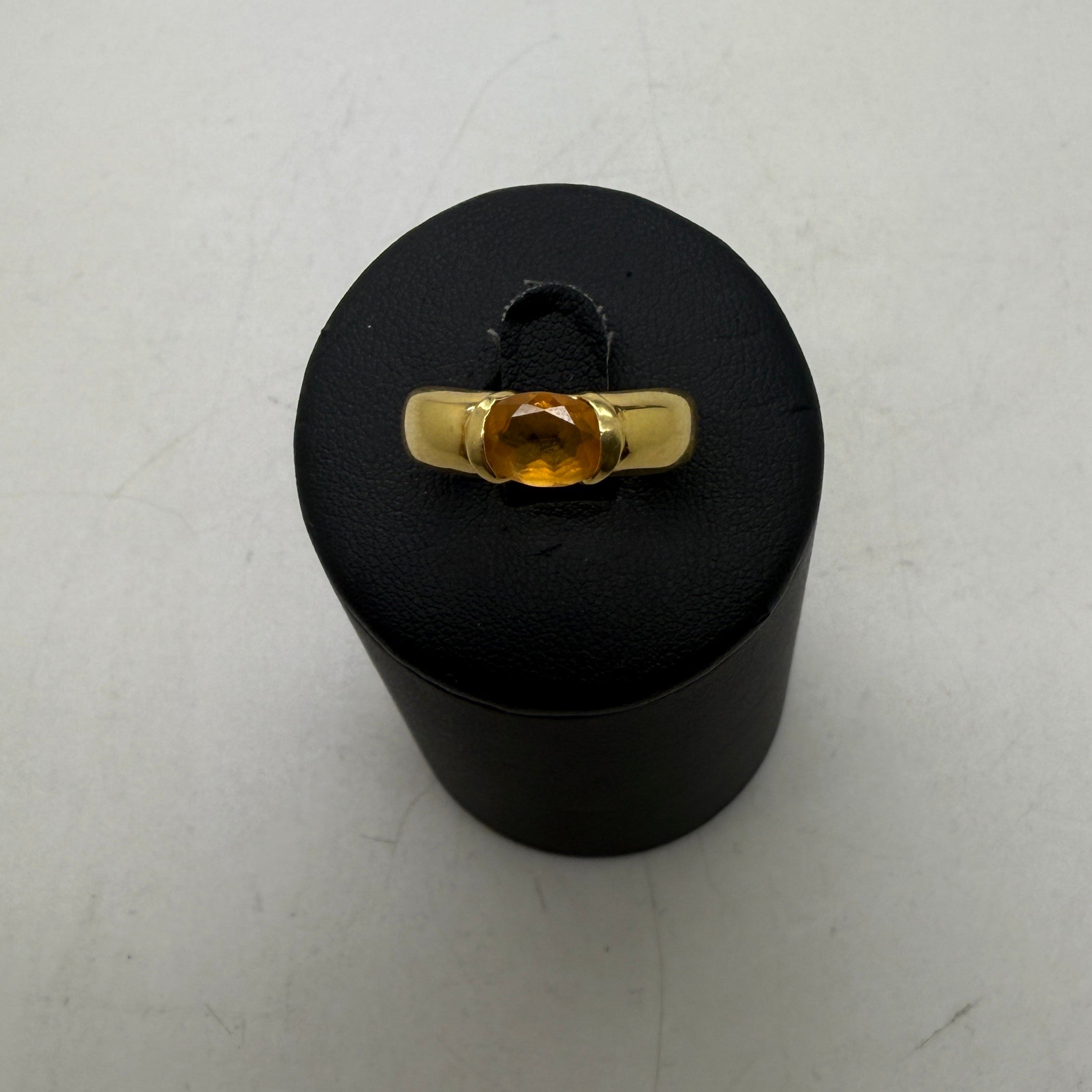 Bague empierrée en or jaune 18 carats (750/1000), poinçonnée tête d’aigle. Sertie d’une citrine lumineuse, elle pèse 4,54 g et est de taille 52. Élégante et éclatante, en état comme neuf.