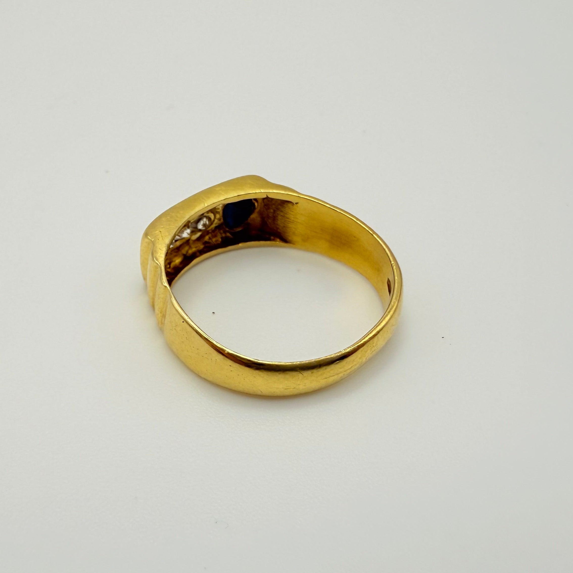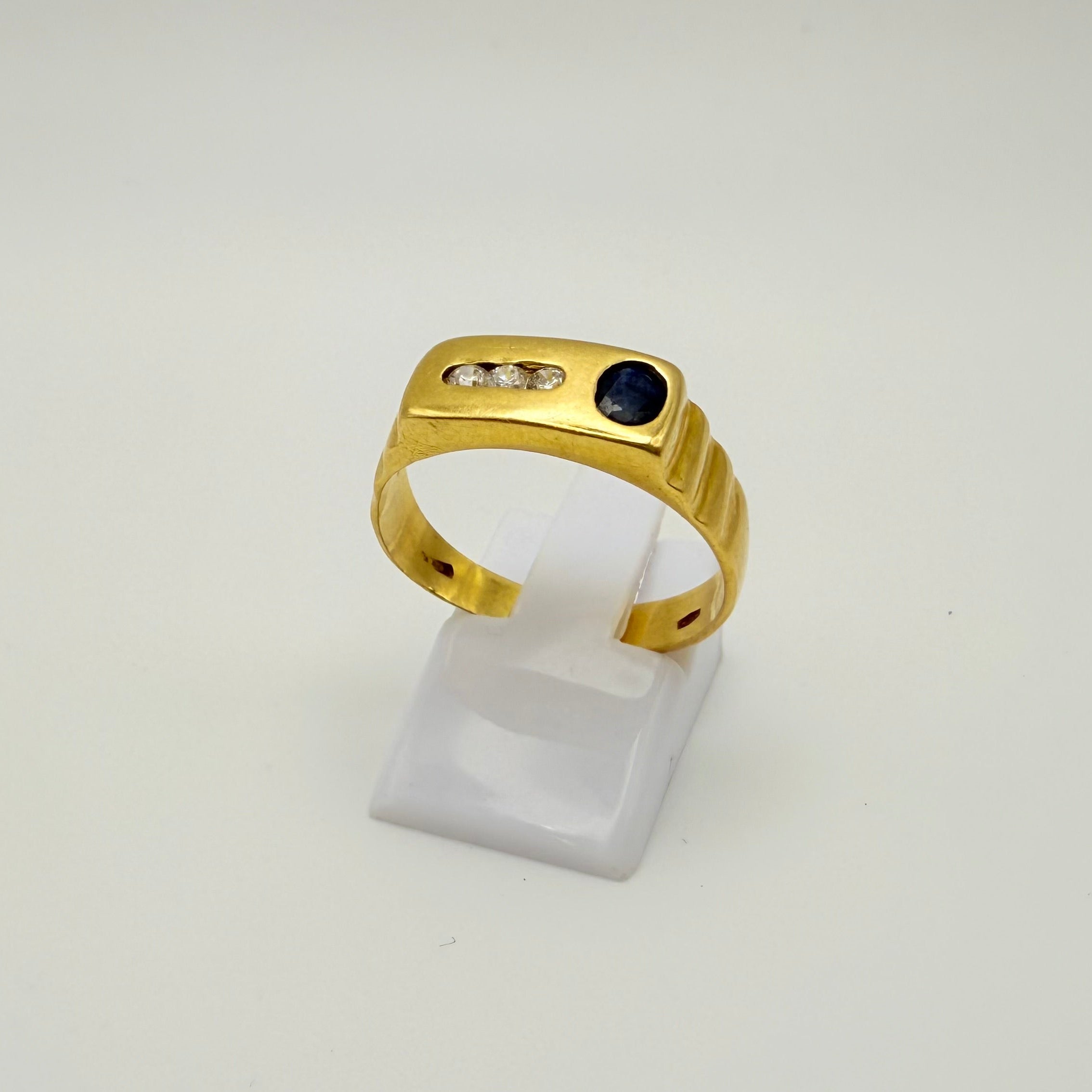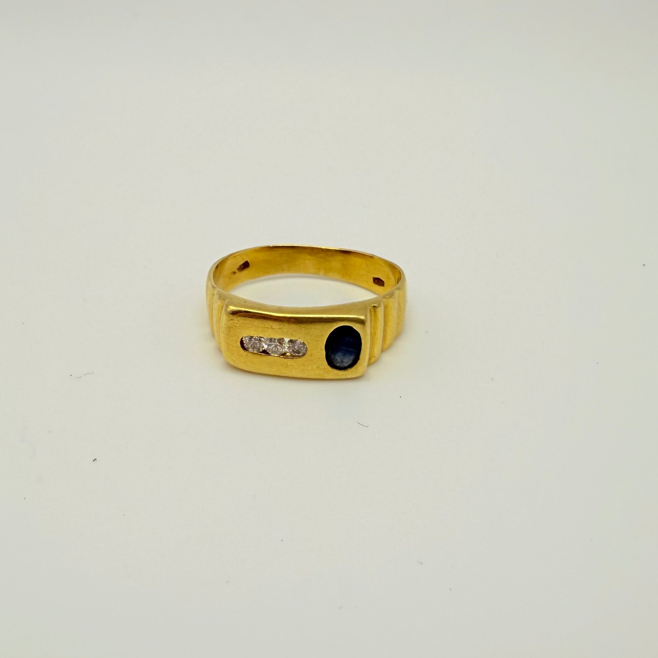 Bague empierrée en or jaune 18 carats (750/1000), poinçonnée 750, d’un poids de 7,73 g et de taille 58. Elle est sertie de 4 pierres précieuses : diamants et saphir, qui lui donnent un éclat raffiné. En bon état, c’est une pièce élégante au charme classique.