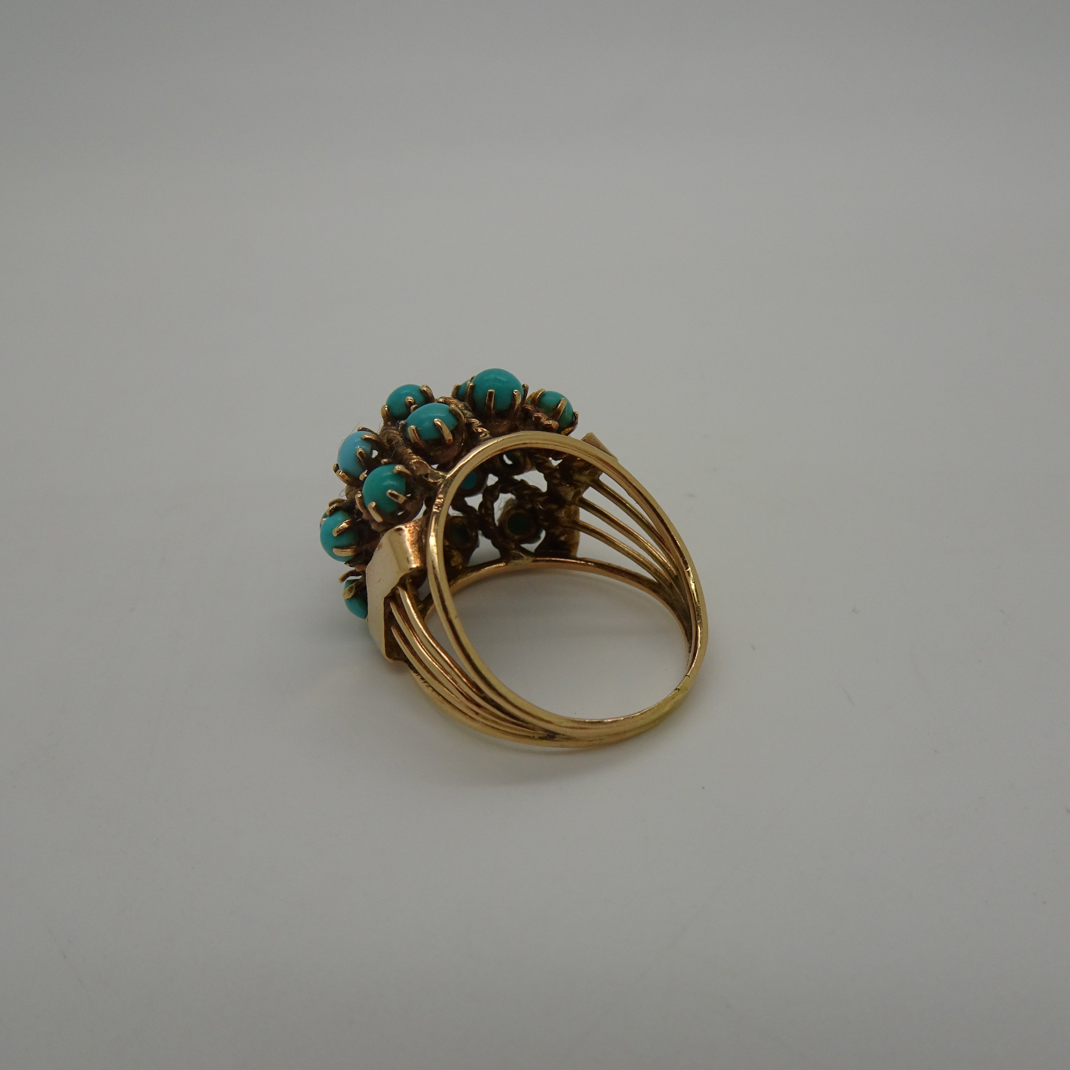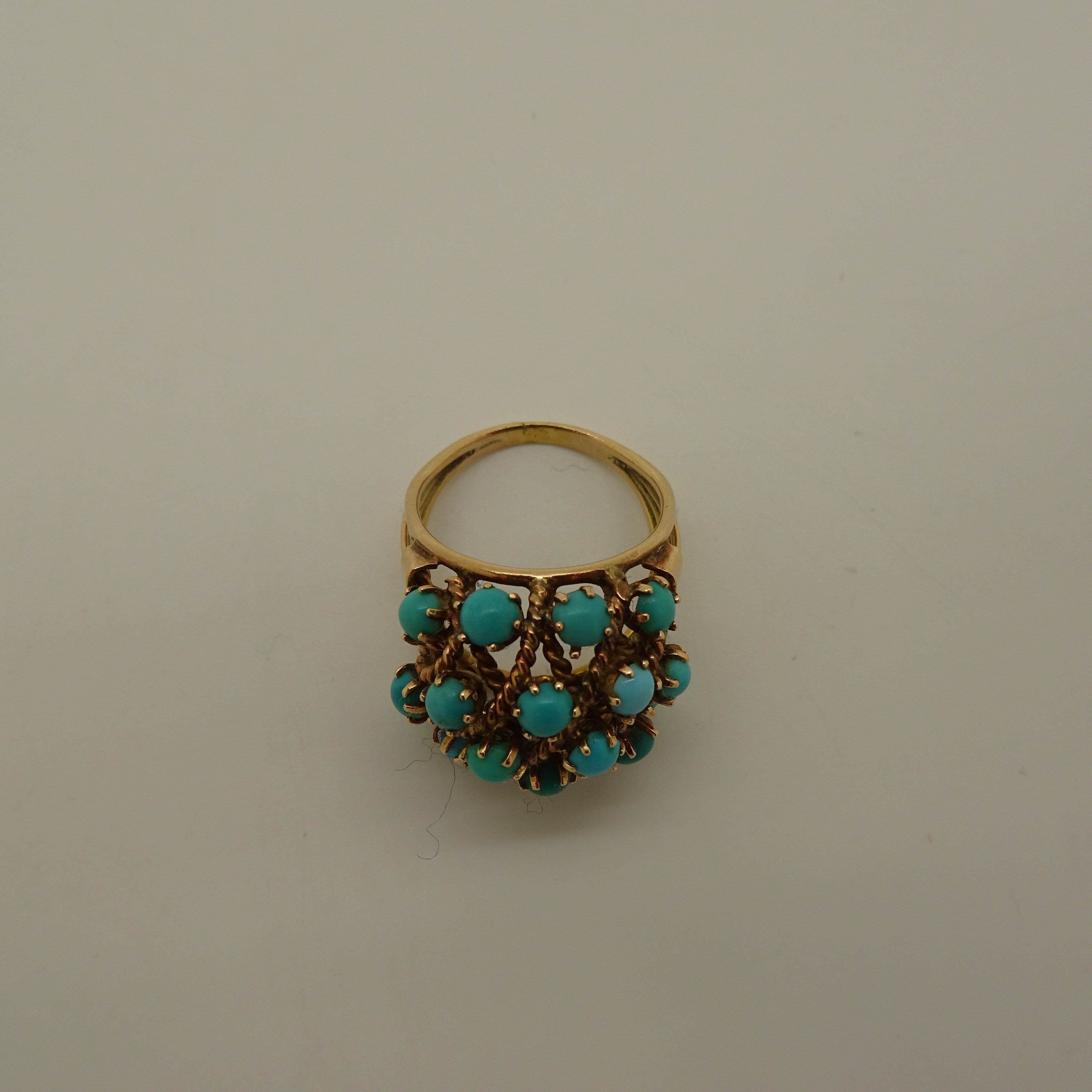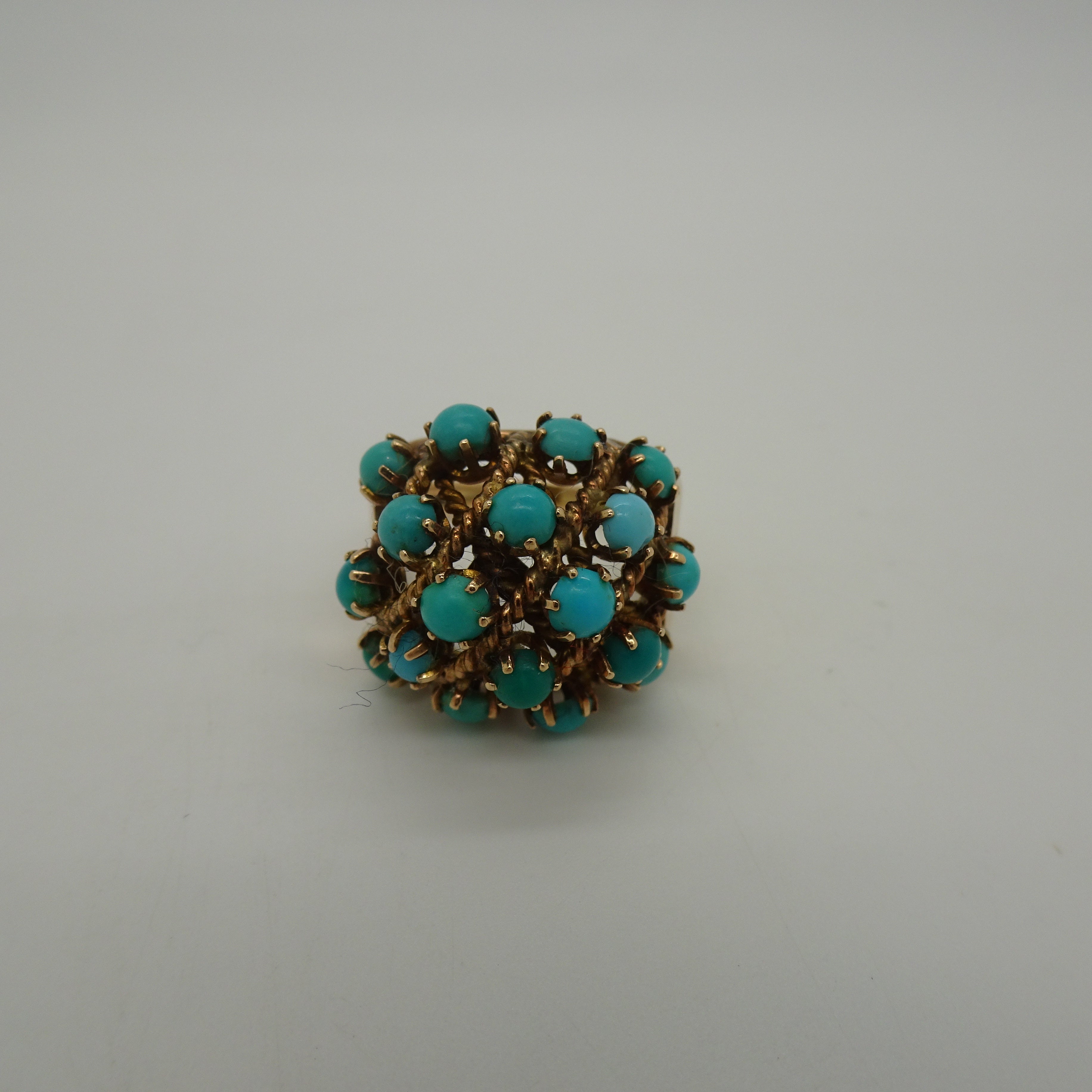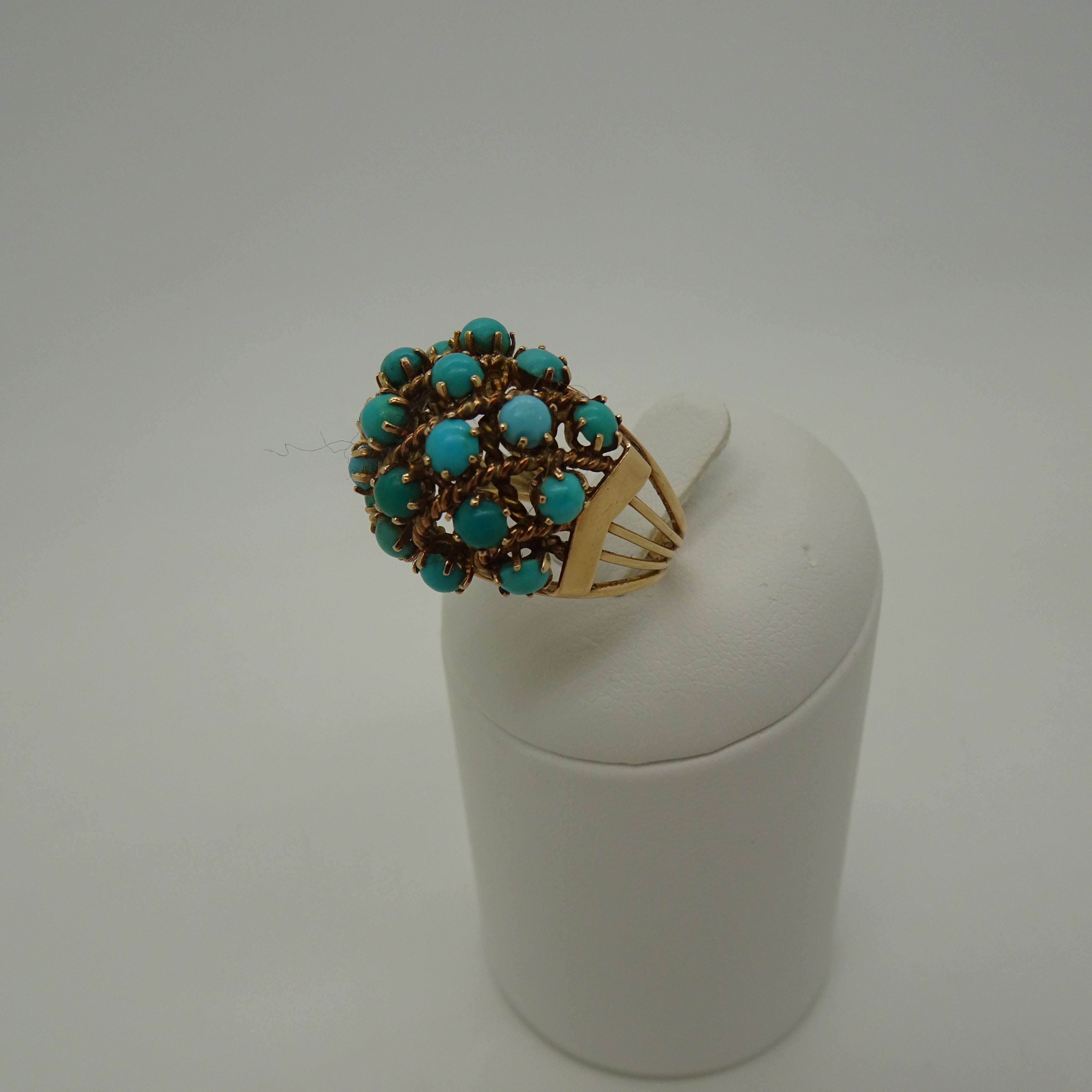 Bague empierrée est en or jaune 18 carats (750/1000), sans poinçon. Elle est ornée de 19 perles bleues, pèse 7,59 grammes et correspond à une taille 55. L’ensemble est présenté en très bon état.