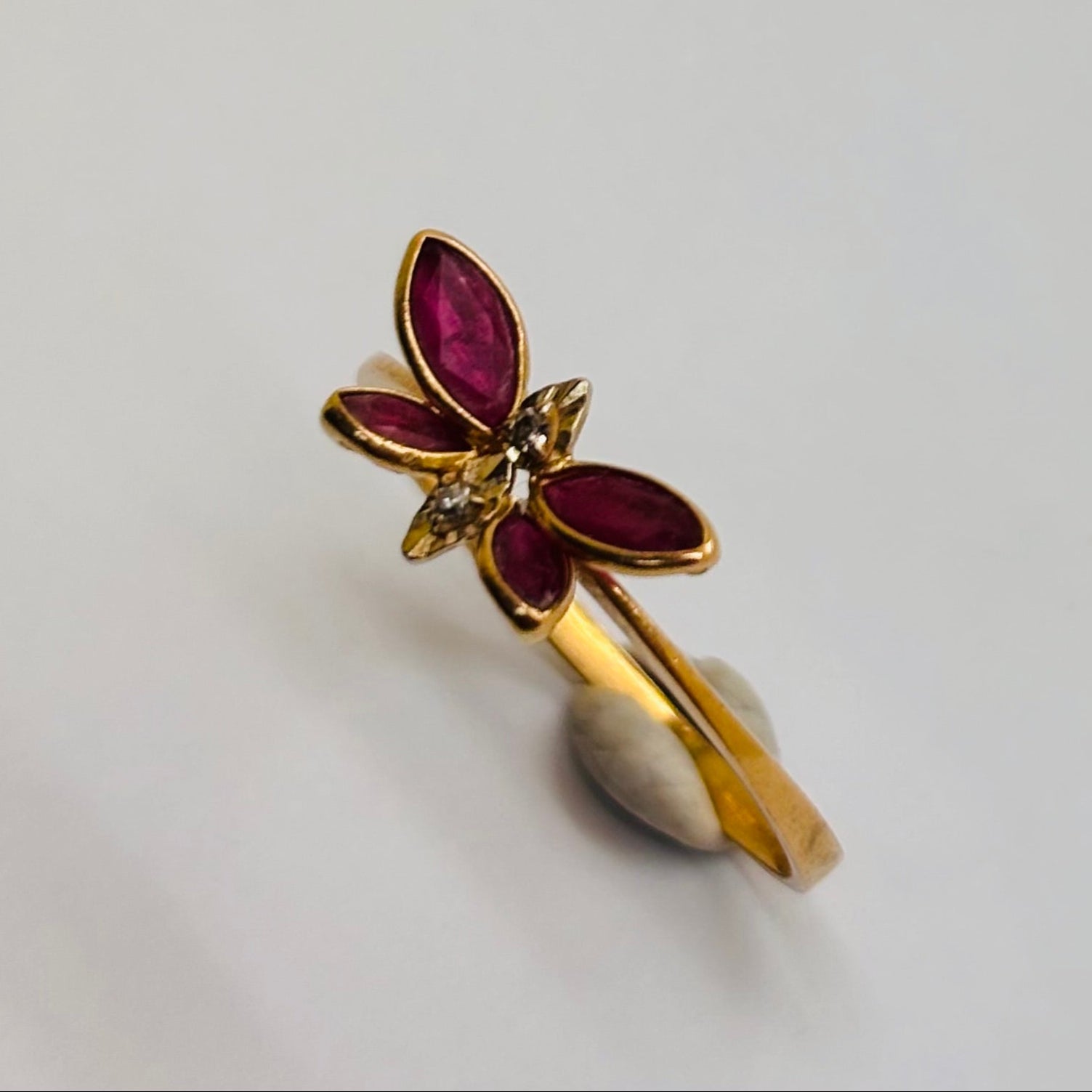 Elle est ornée de quatre rubis et deux petits diamants, offrant un joli contraste de brillance et de couleur. Avec une taille 57 et un poids de 1.73 grammes.