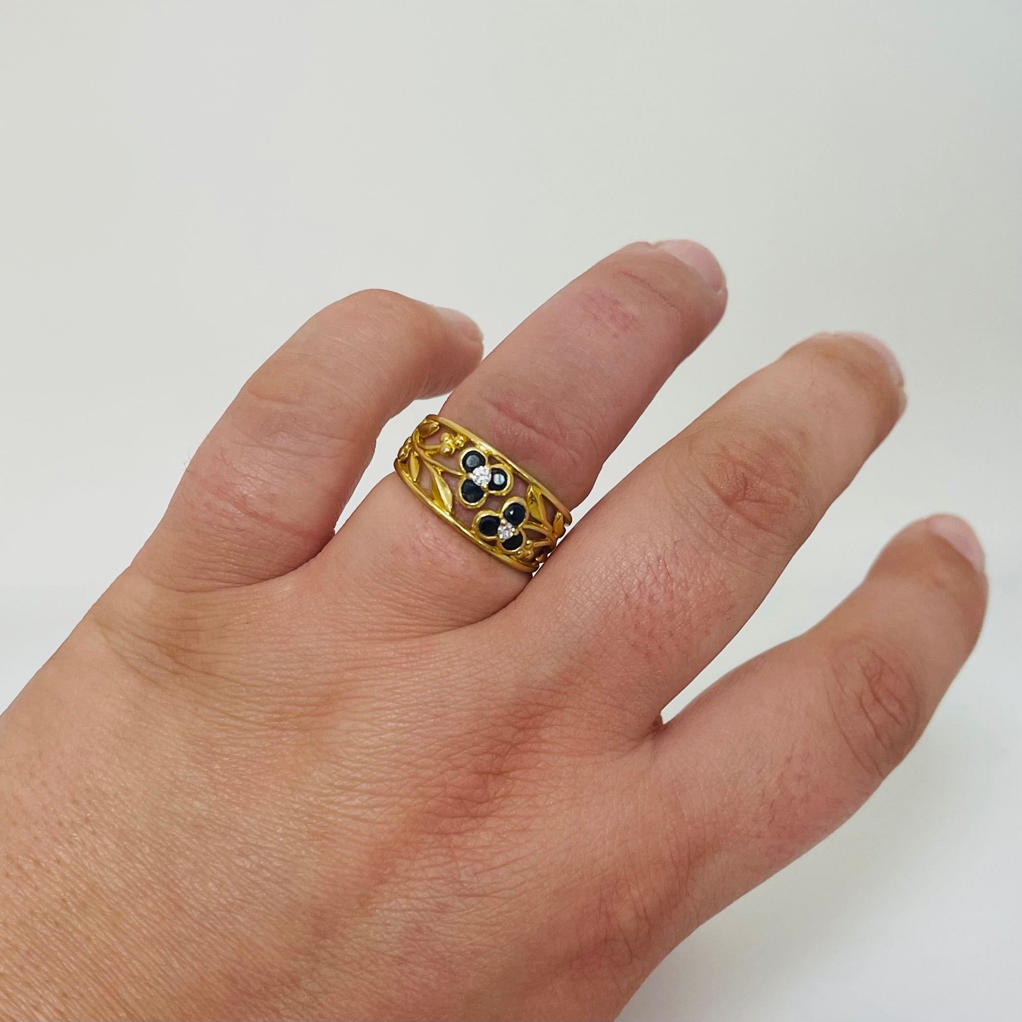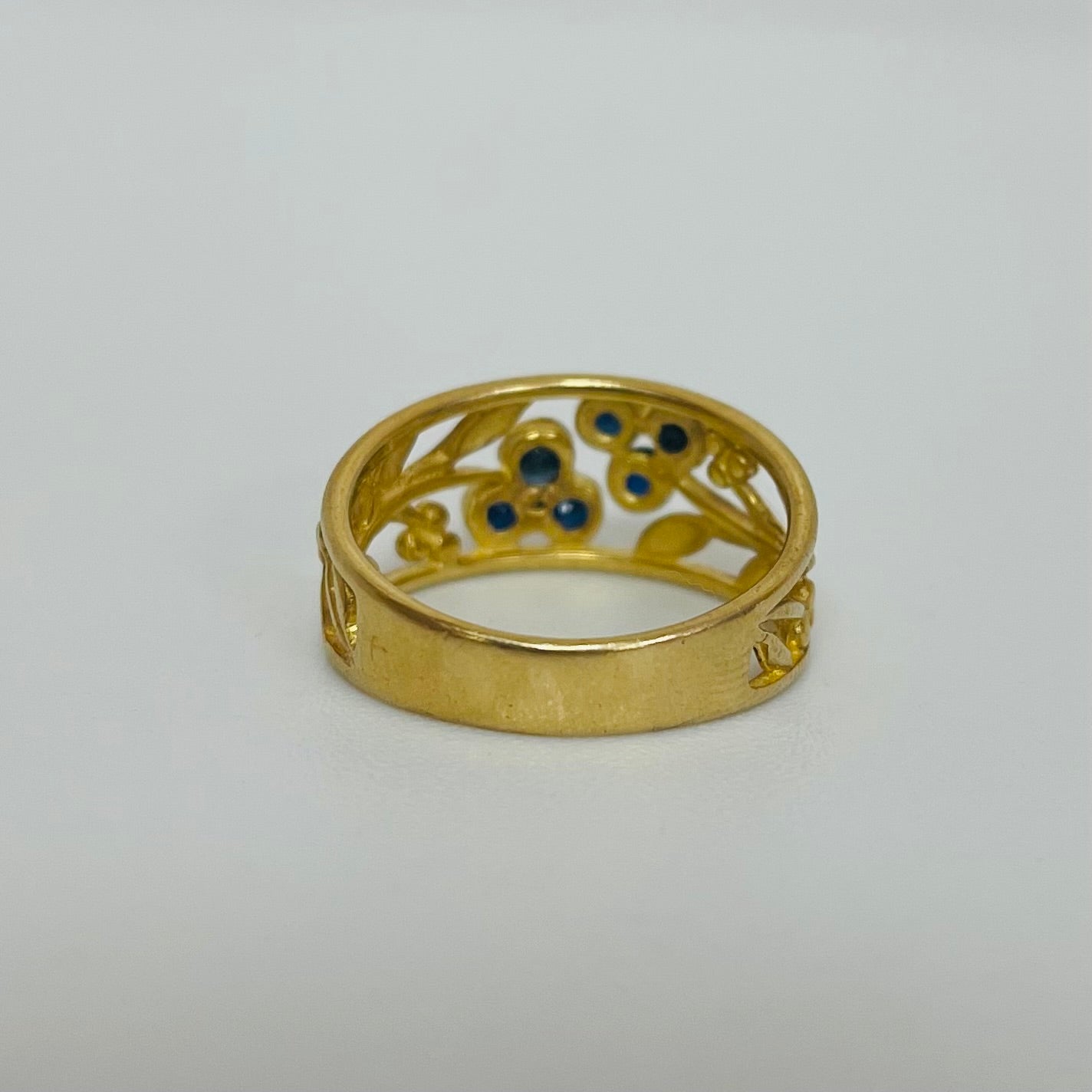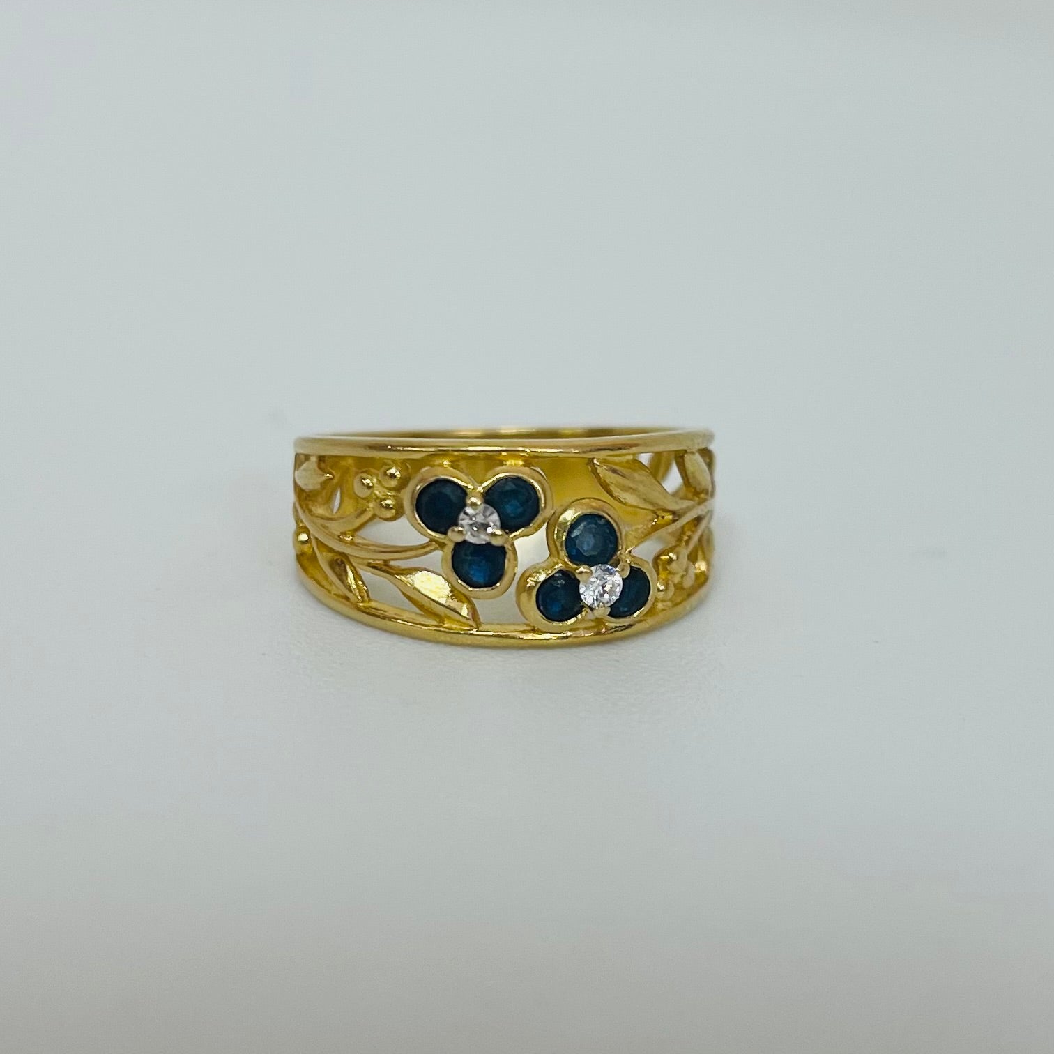 Bague empierrée en or jaune 18 carats (750/1000), sans poinçon, d’un poids de 4,50 grammes et en taille 55. Elle est ornée de 6 saphirs et de 2 oxydes de zirconium. Le bijou est en très bon état.