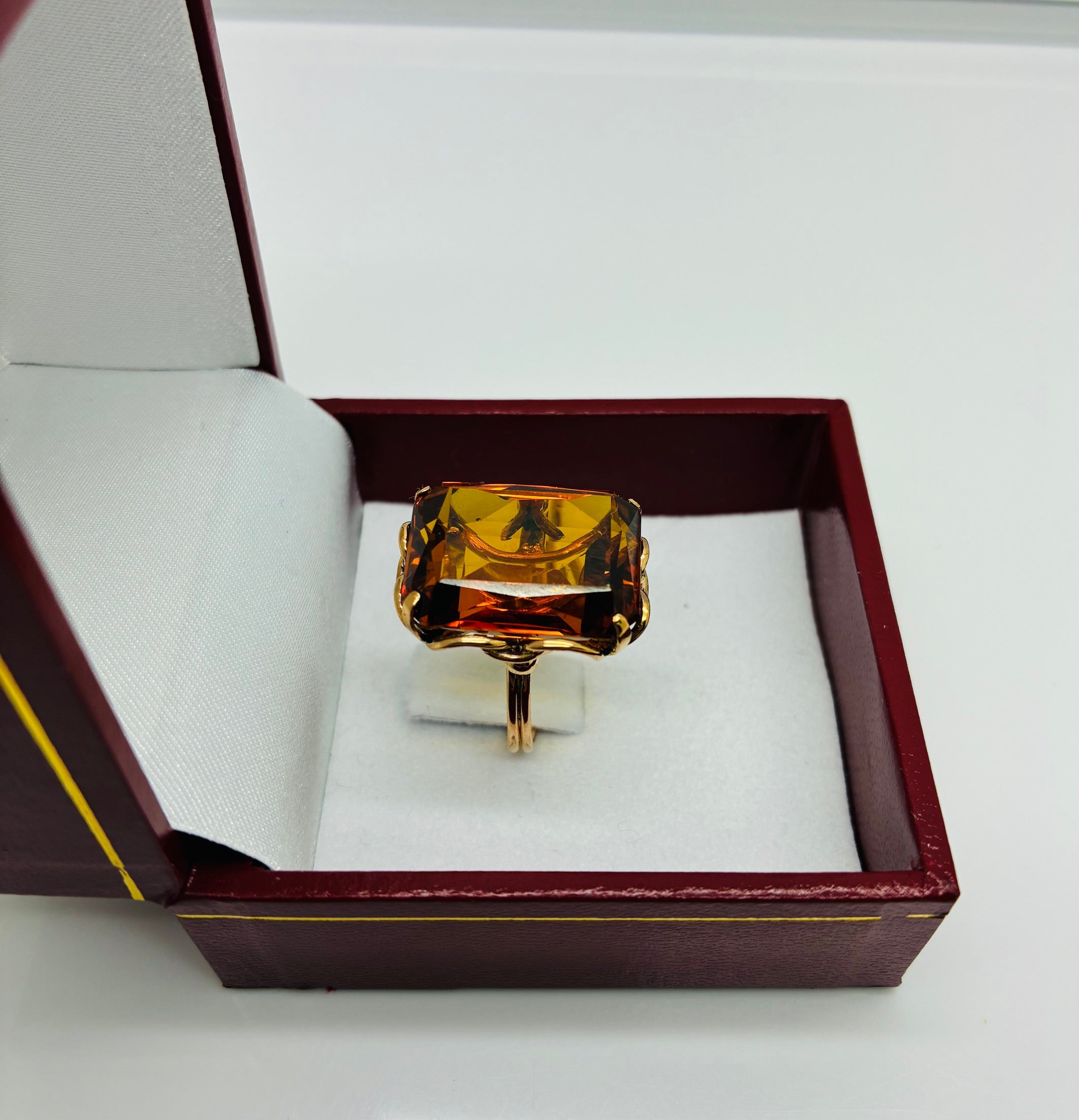 Bague en or jaune 18 carats (750/1000), poinçonnée tête d’aigle, pesant 10,93 grammes. Elle est sertie d’une topaze unique et correspond à une taille 52. L’ensemble est en très bon état.