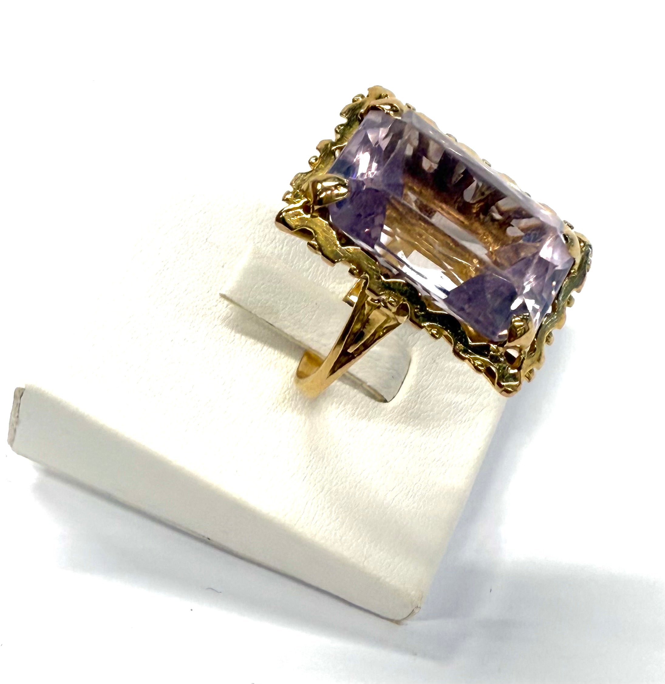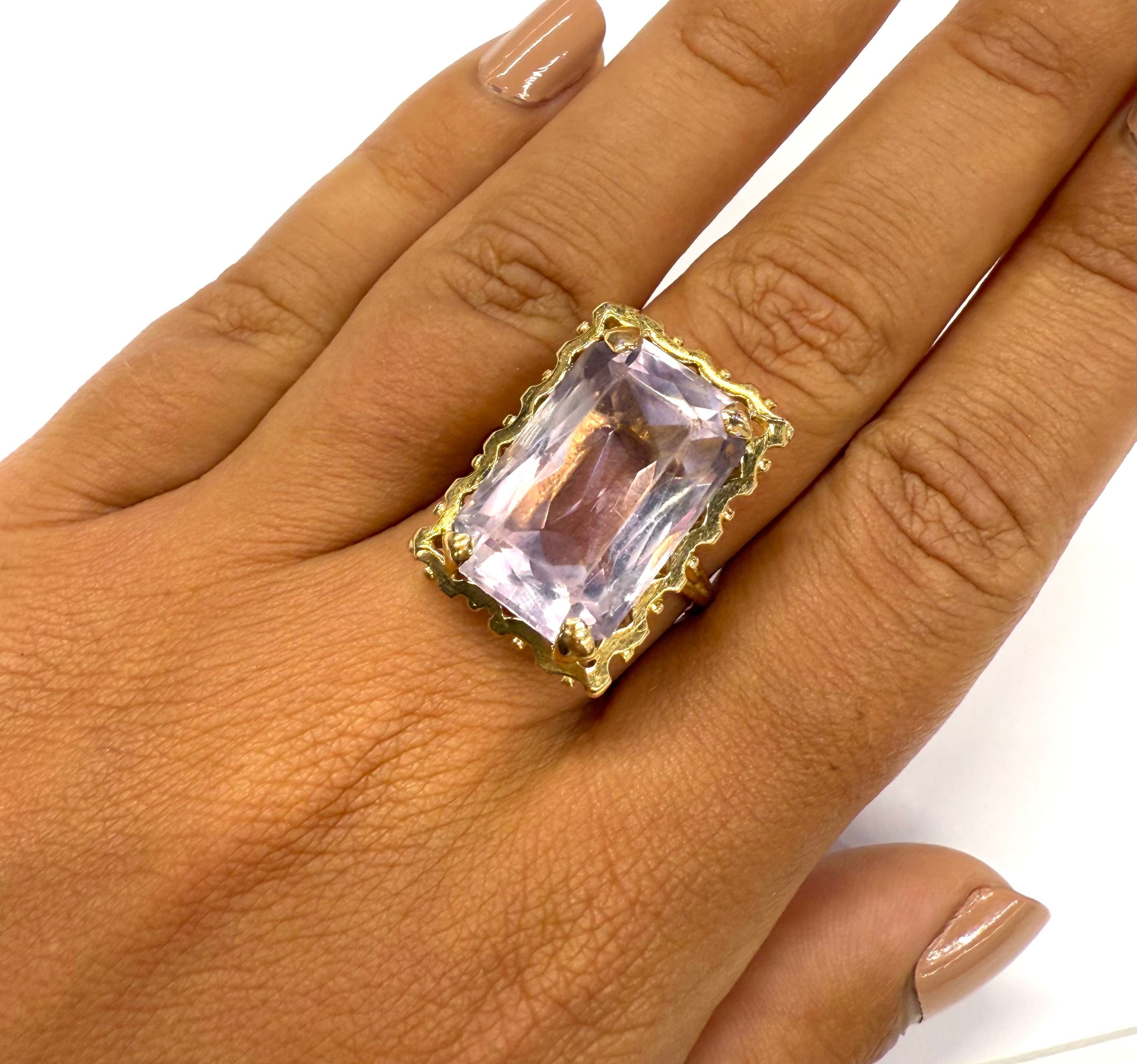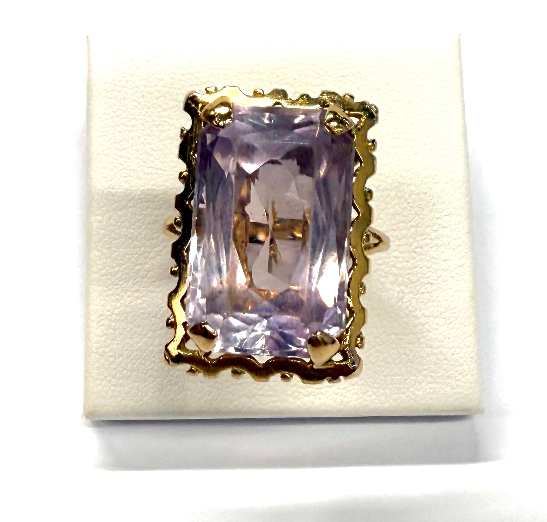 Bague empierrée en or jaune 18 carats (750/1000), sans poinçon, poids de 11,10 g, taille 60. Elle est sertie d’une améthyste mesurant 2 cm de longueur sur 1,3 cm de largeur. En très bon état.