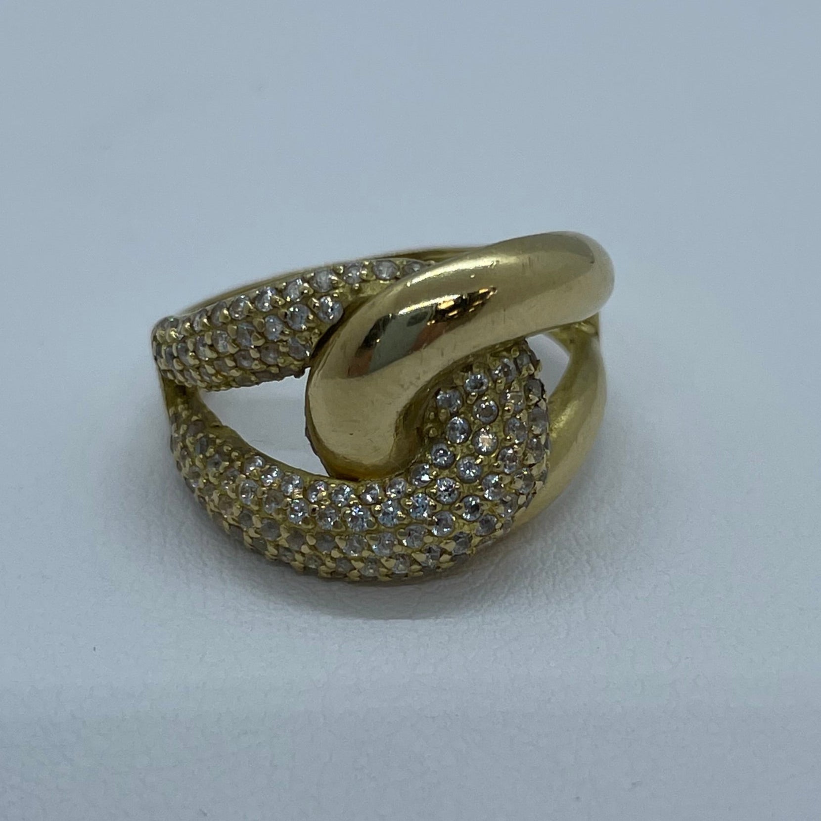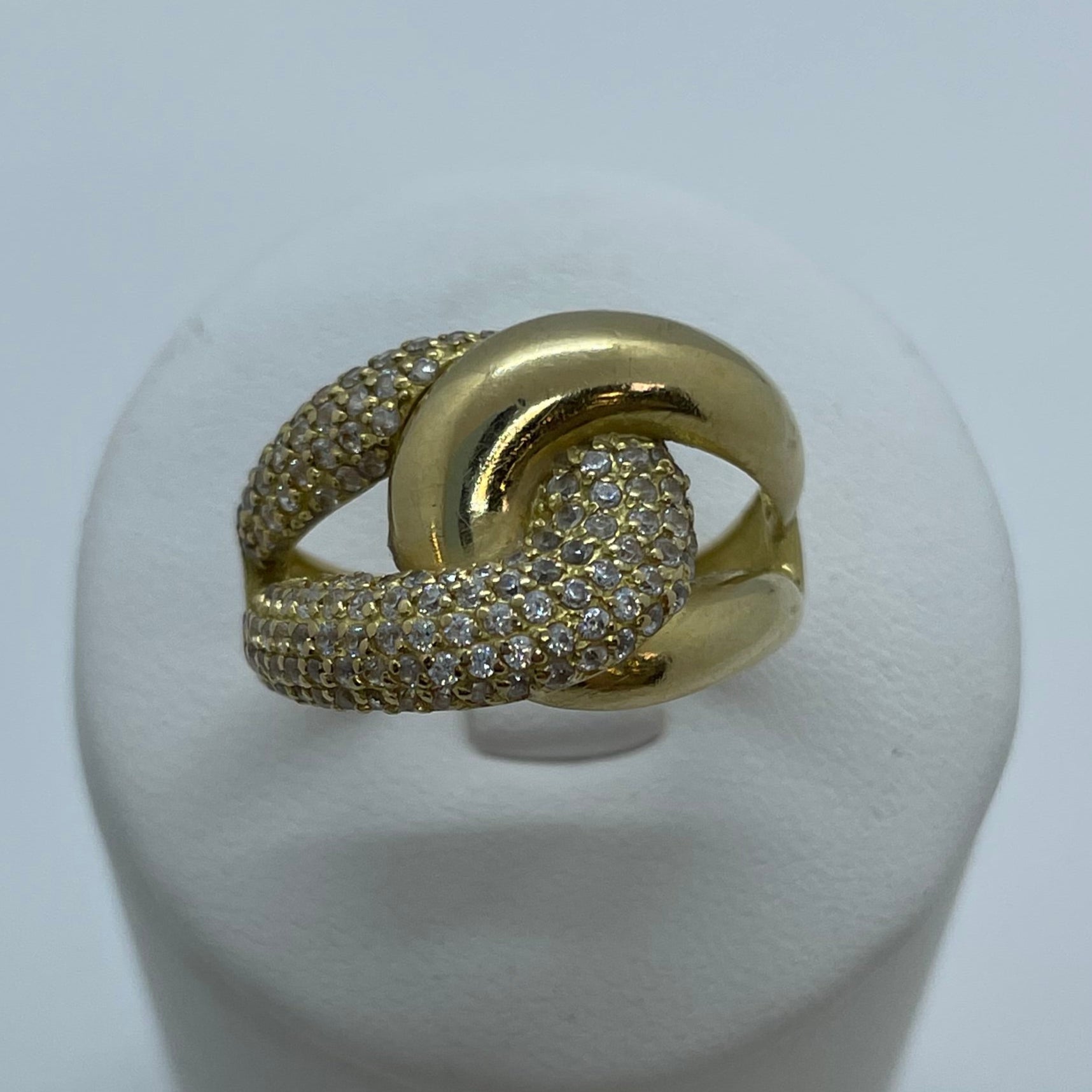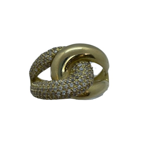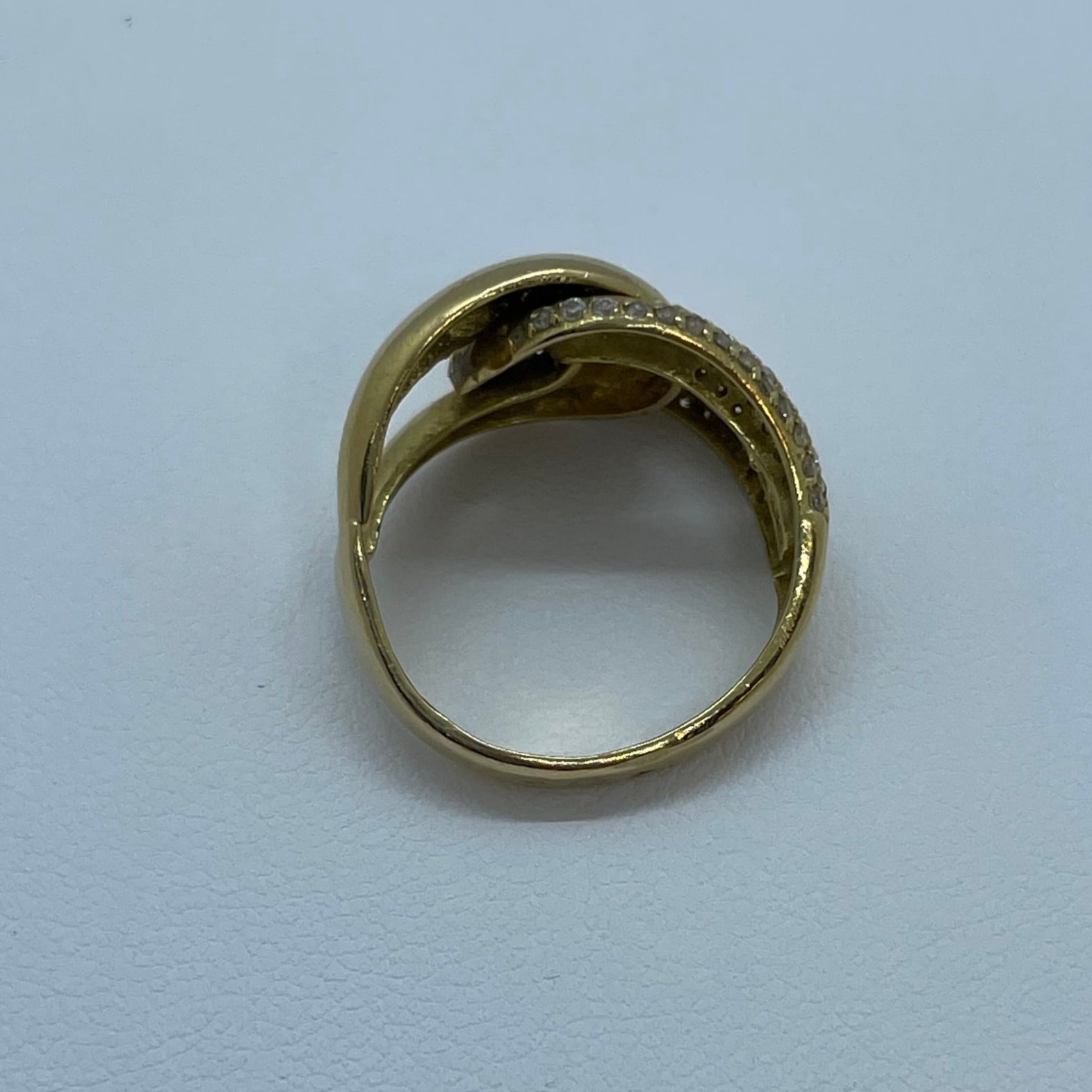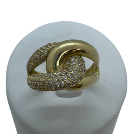 Bague en or jaune 18 carats (750/1000), poinçonnée 750, présente un design original rehaussé par des oxydes de zirconium. Avec un poids de 5,73 grammes, elle est proposée en taille 55.