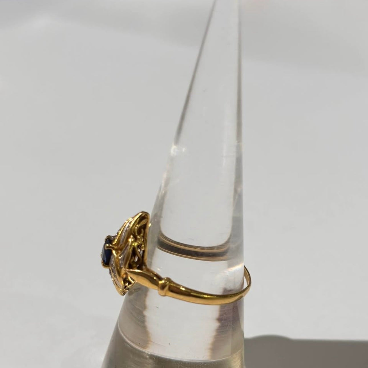 Ravissante bague empierrée en or jaune 18 carats (750/1000), poinçonnée de la tête d’aigle. Elle est sertie d’un saphir central profond, entouré de six diamants brillants qui en rehaussent l’éclat. Taille 55, pour un poids de 2,70 grammes. Une pièce raffinée et lumineuse, en état comme neuf, parfaite pour une touche de prestige discrète.
